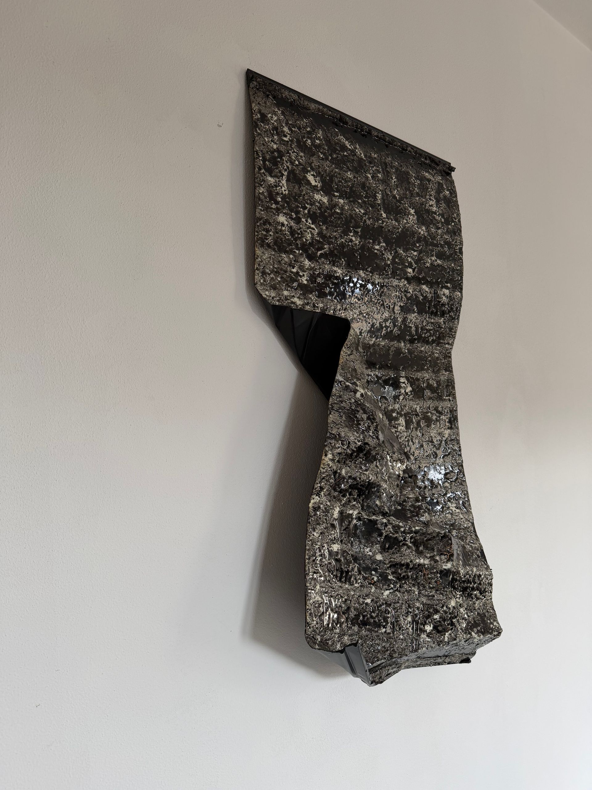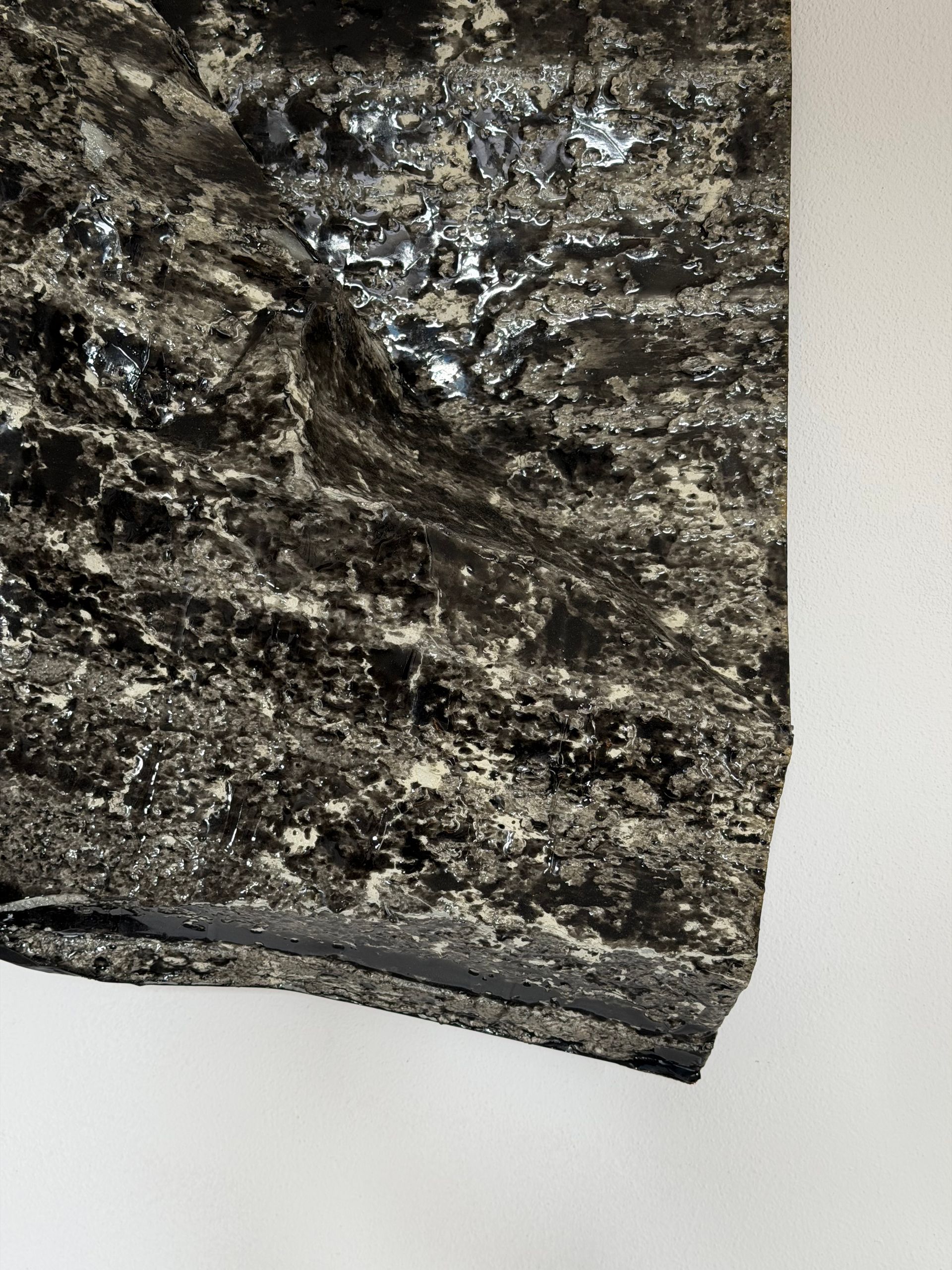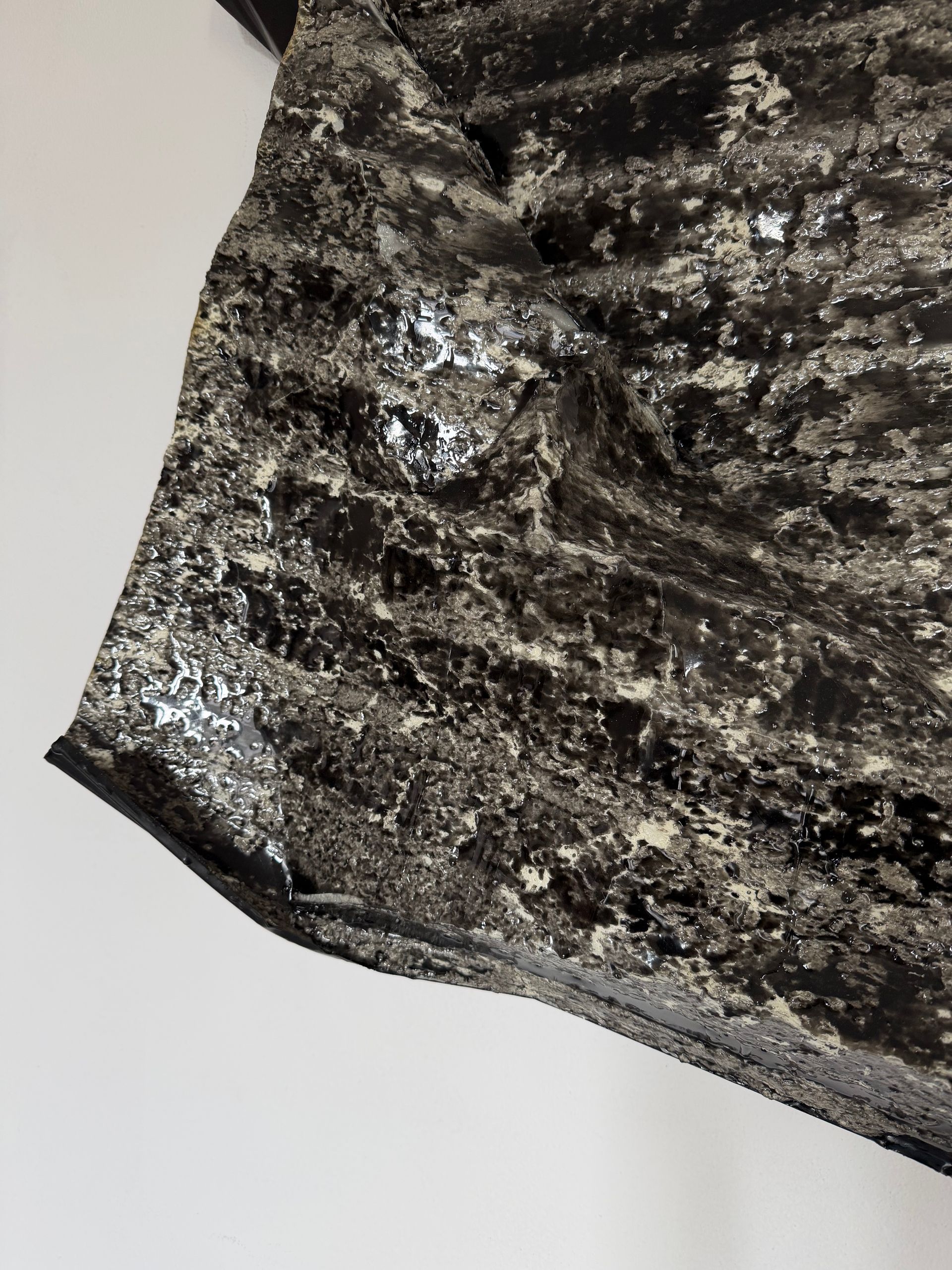 La superficie scura e profondamente materica richiama una pelle minerale segnata dal tempo, dove ogni piega e irregolarità cattura la luce in modo diverso.