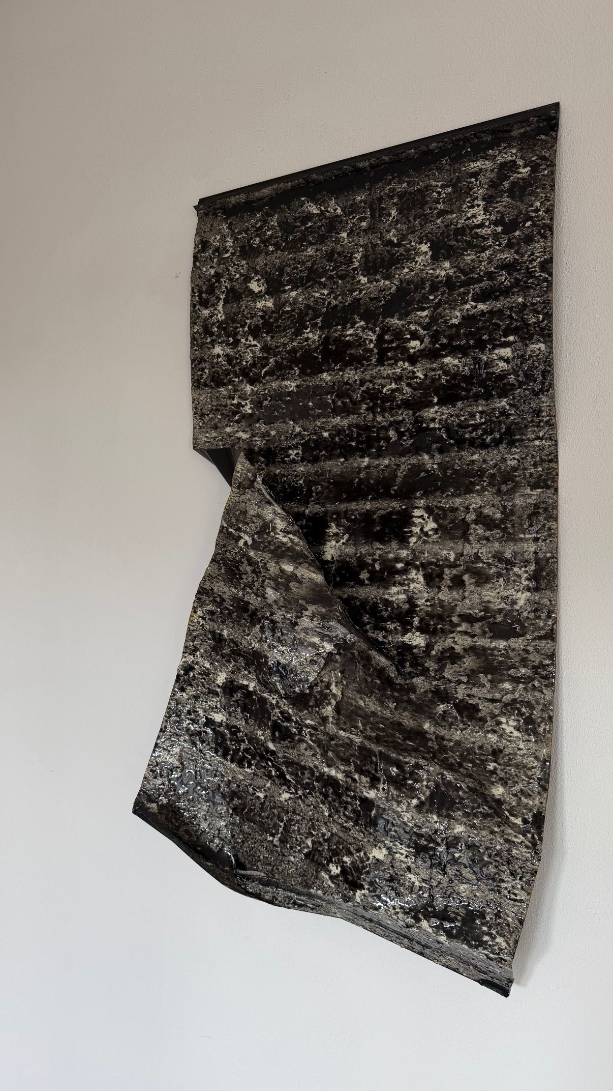 Black Sheet II porta all'estremo il dialogo tra la memoria industriale del supporto e la forza plastica del gesto artistico. In quest'opera, la lamiera "stropicciata" non è più solo un piano, ma un corpo metallico che reagisce alla manipolazione, trasformando la sua originaria rigidità in un movimento quasi organico.