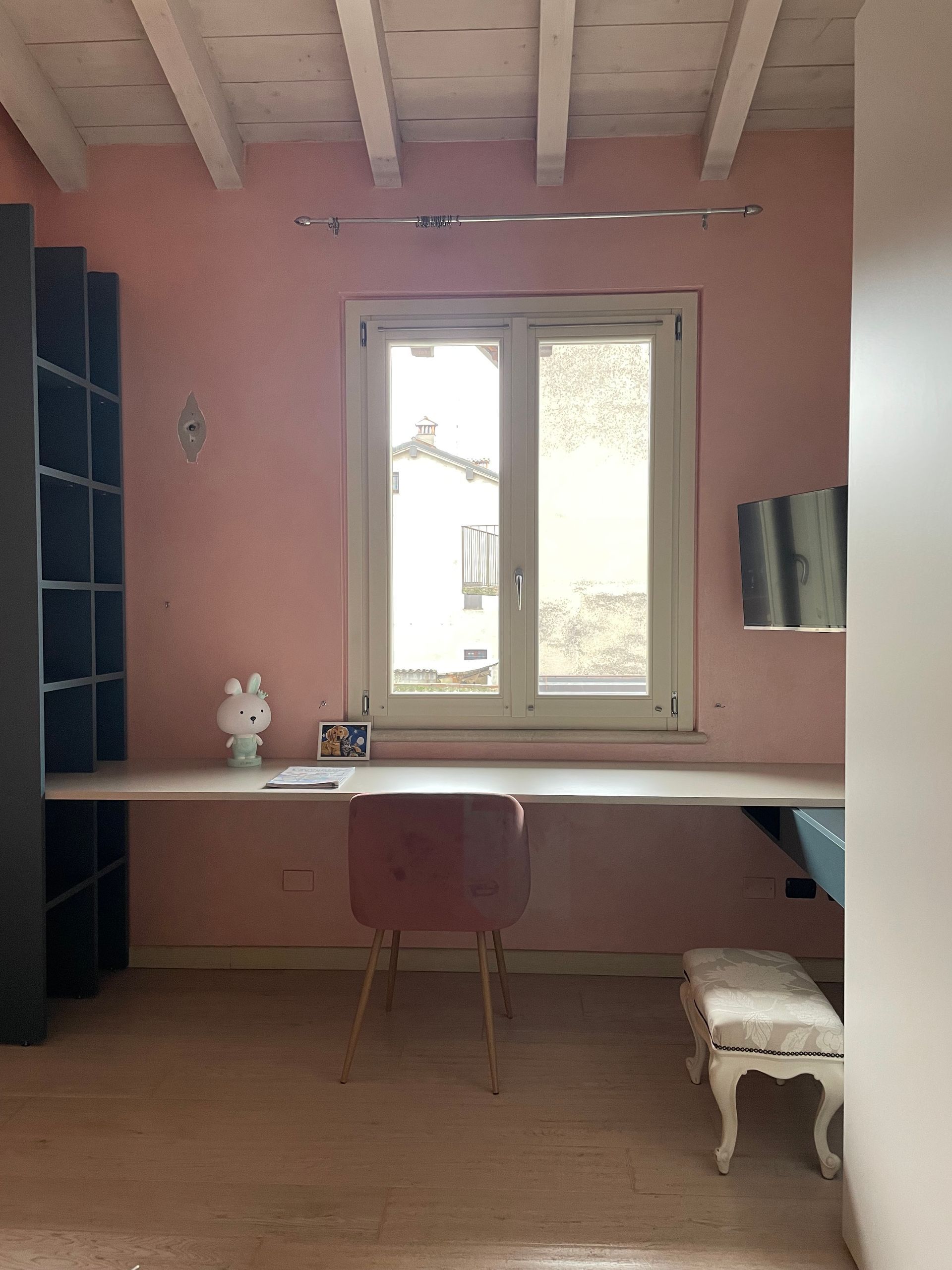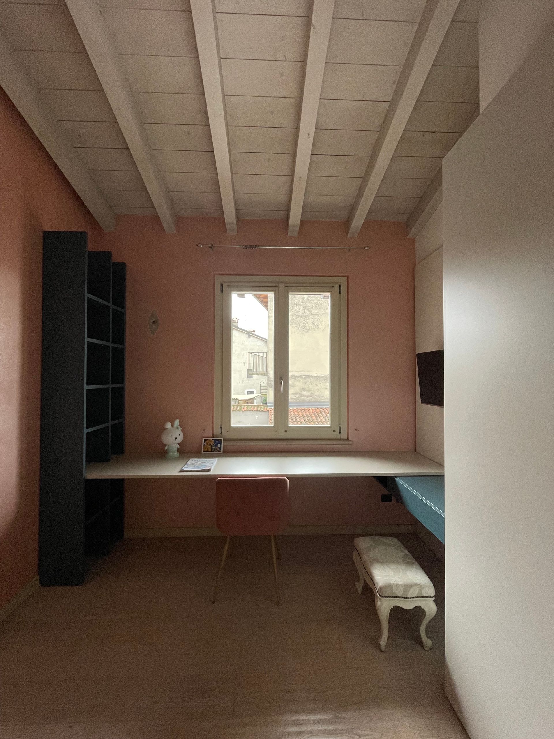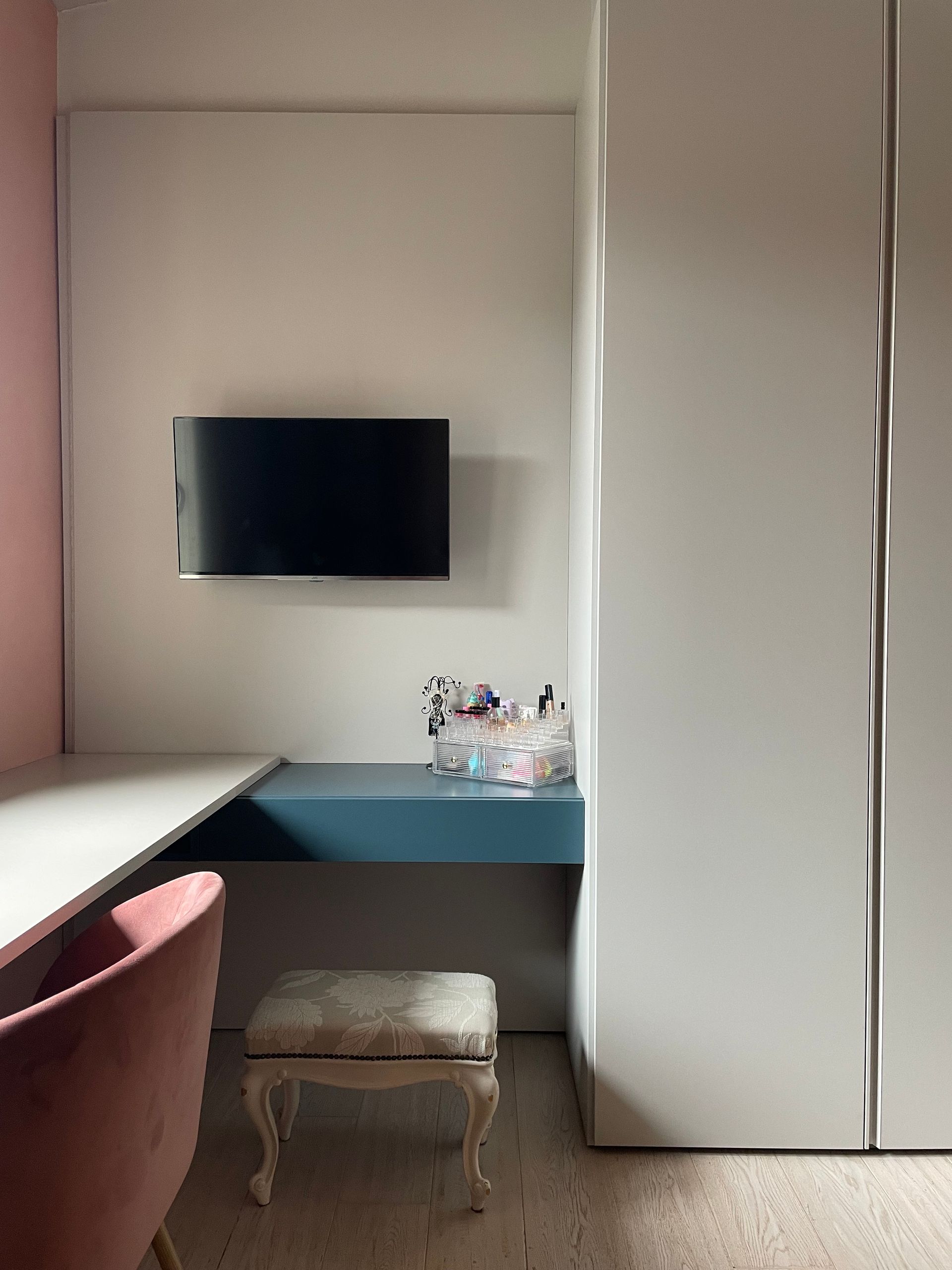 Tutto perfettamente intrecciato per le varie attività della giornata... letto, libreria, scrivania, angolo trucco, armadio... La continuità tra le forme e il contrasto di colori sono i temi di questo progetto.