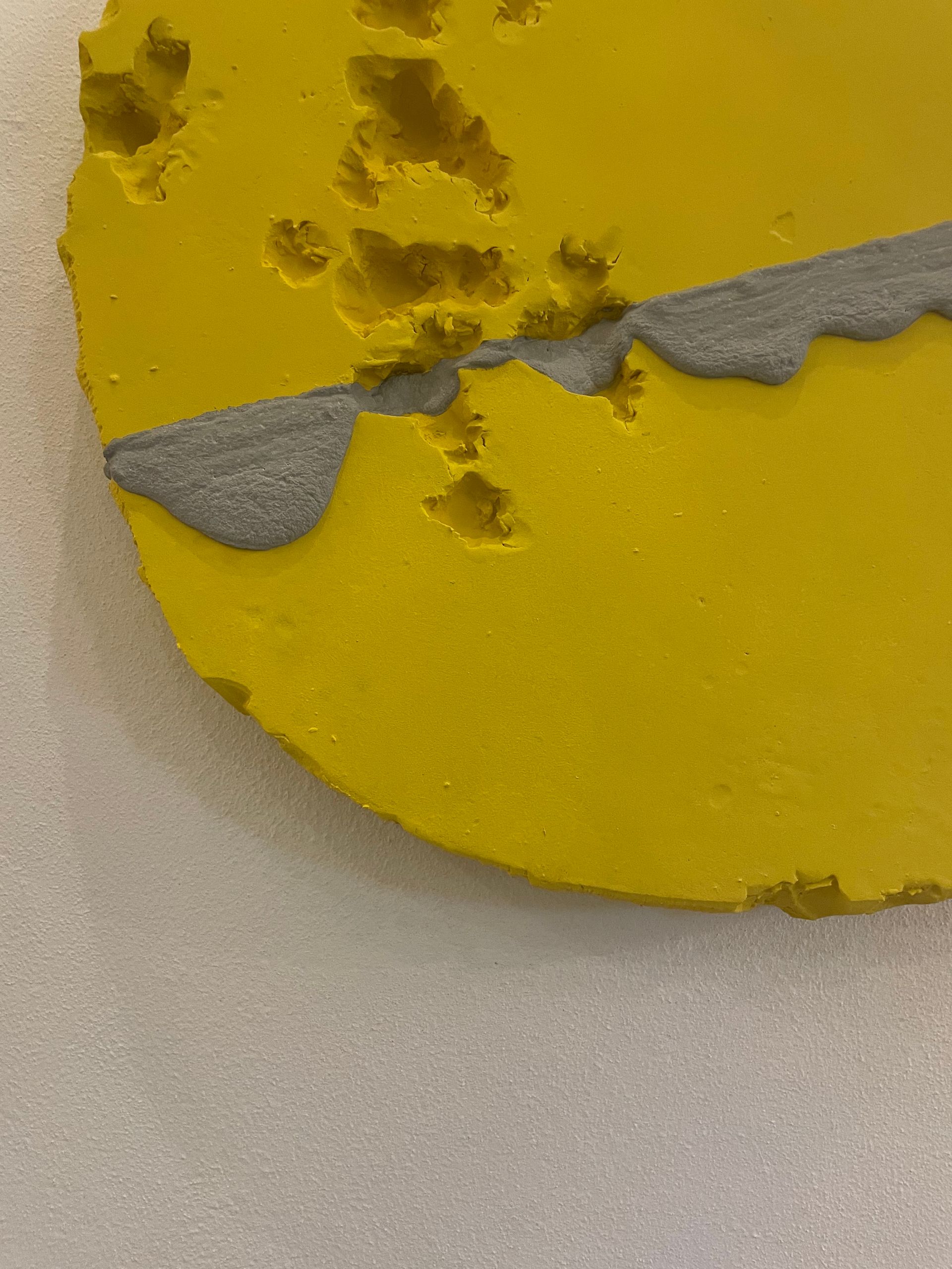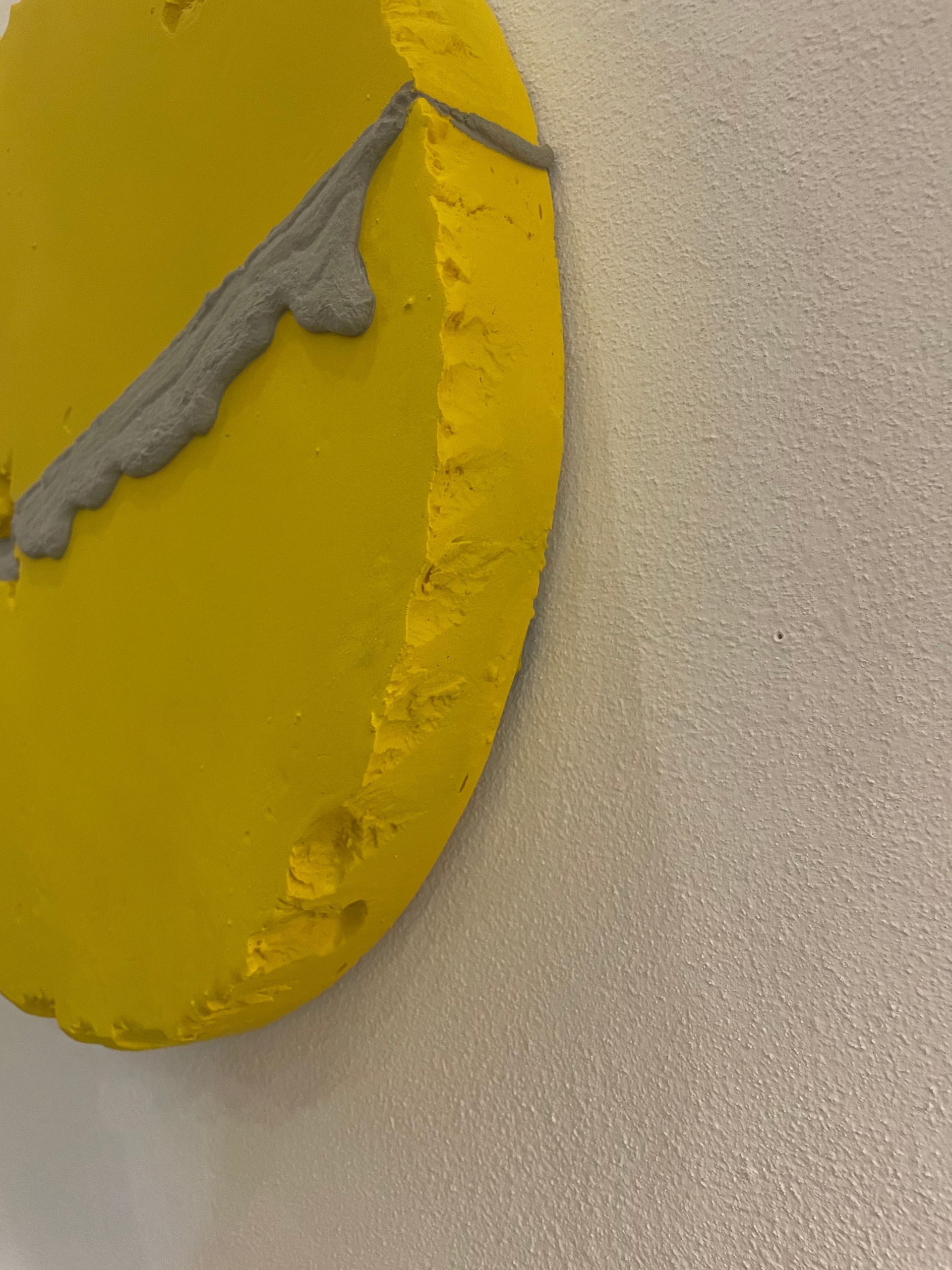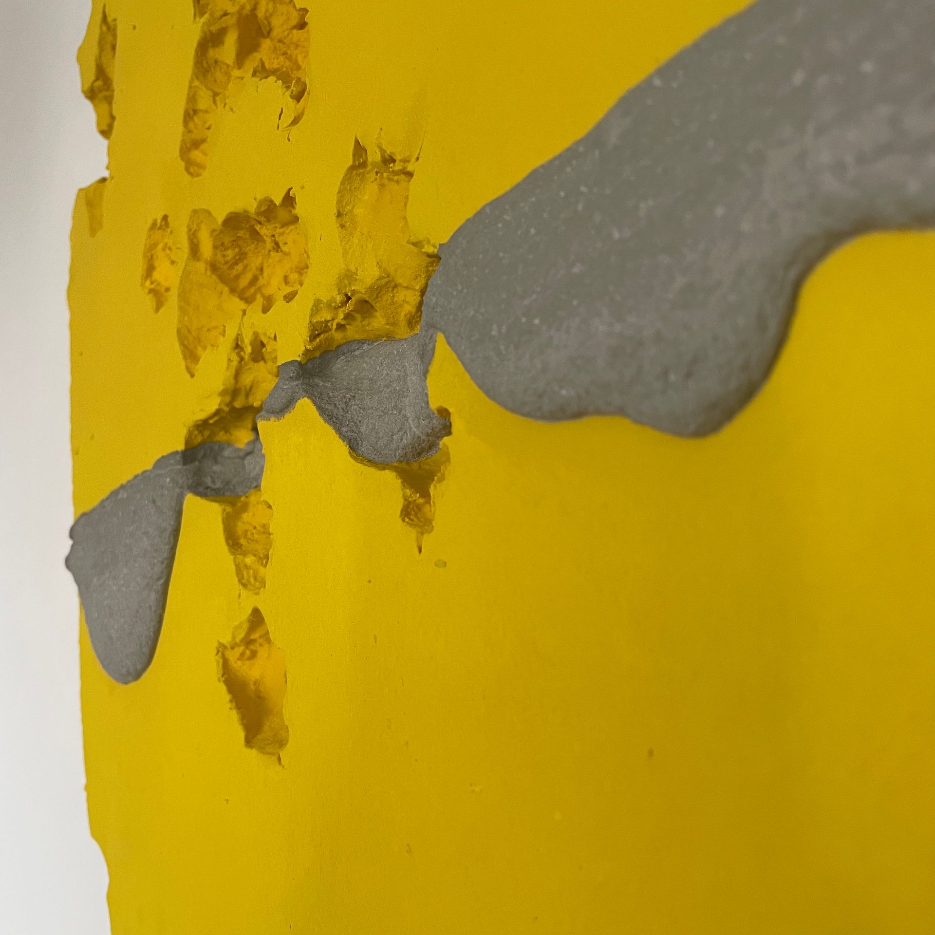 Due parti della stessa opera. L’opera è divisa a metà e incollata da una miscela di cemento che fuoriesce dalla fessura creando una colata sulla superficie. L’opera fa parte della mostra “Crepe”, del 2025.