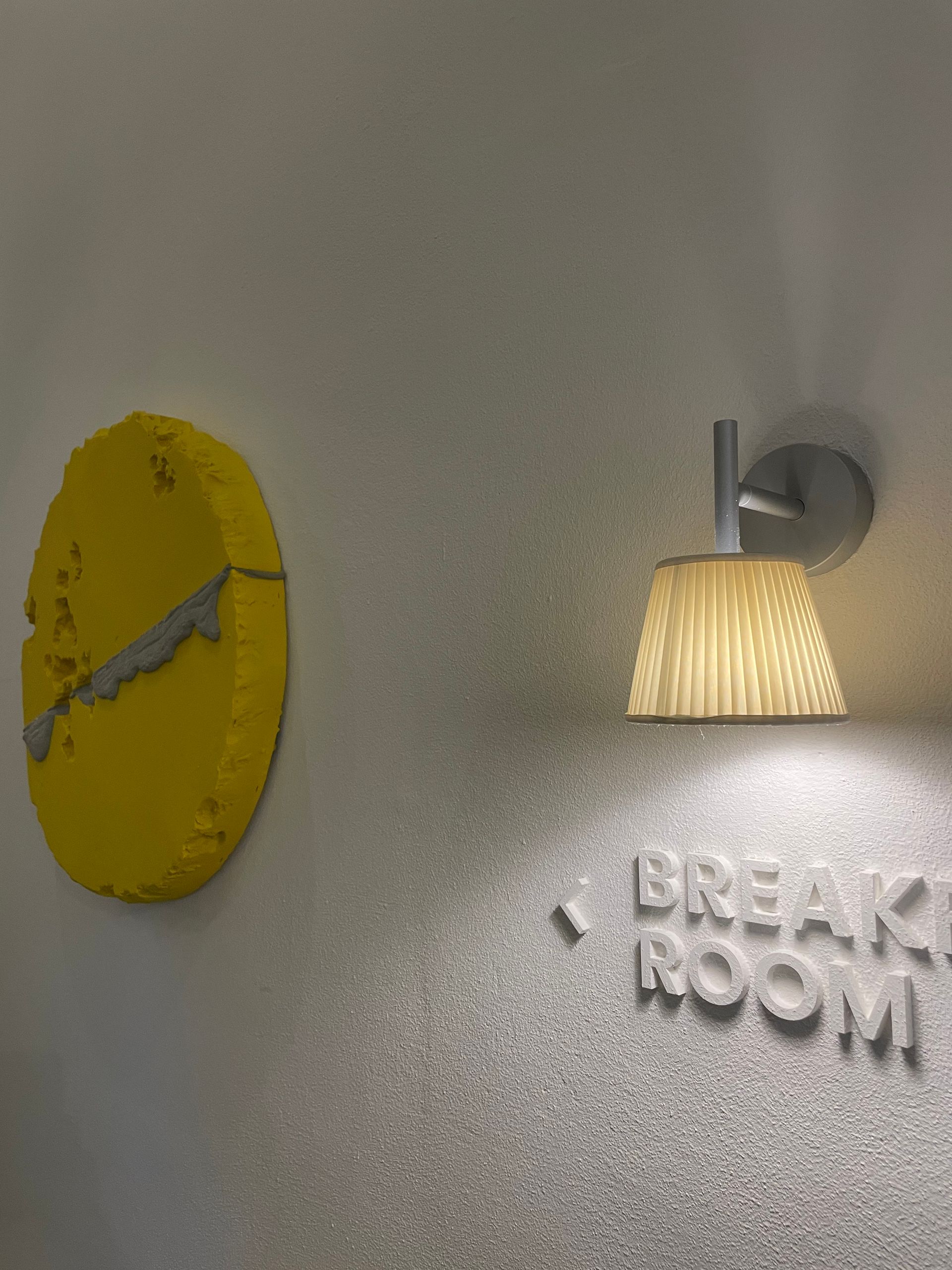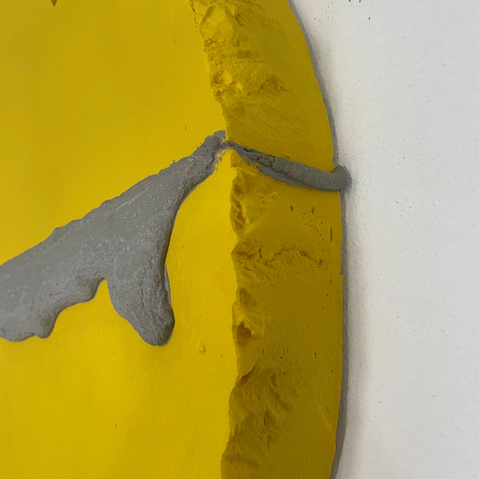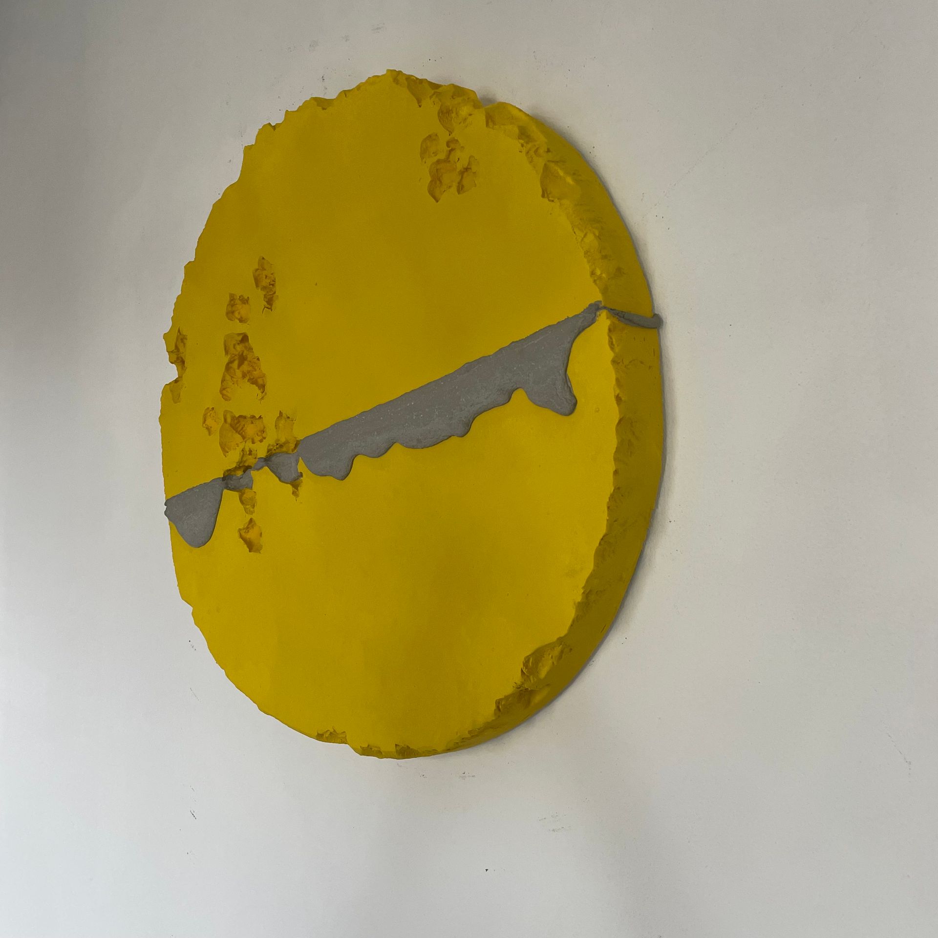 Due parti della stessa opera. L’opera è divisa a metà e incollata da una miscela di cemento che fuoriesce dalla fessura creando una colata sulla superficie. L’opera fa parte della mostra “Crepe”, del 2025.