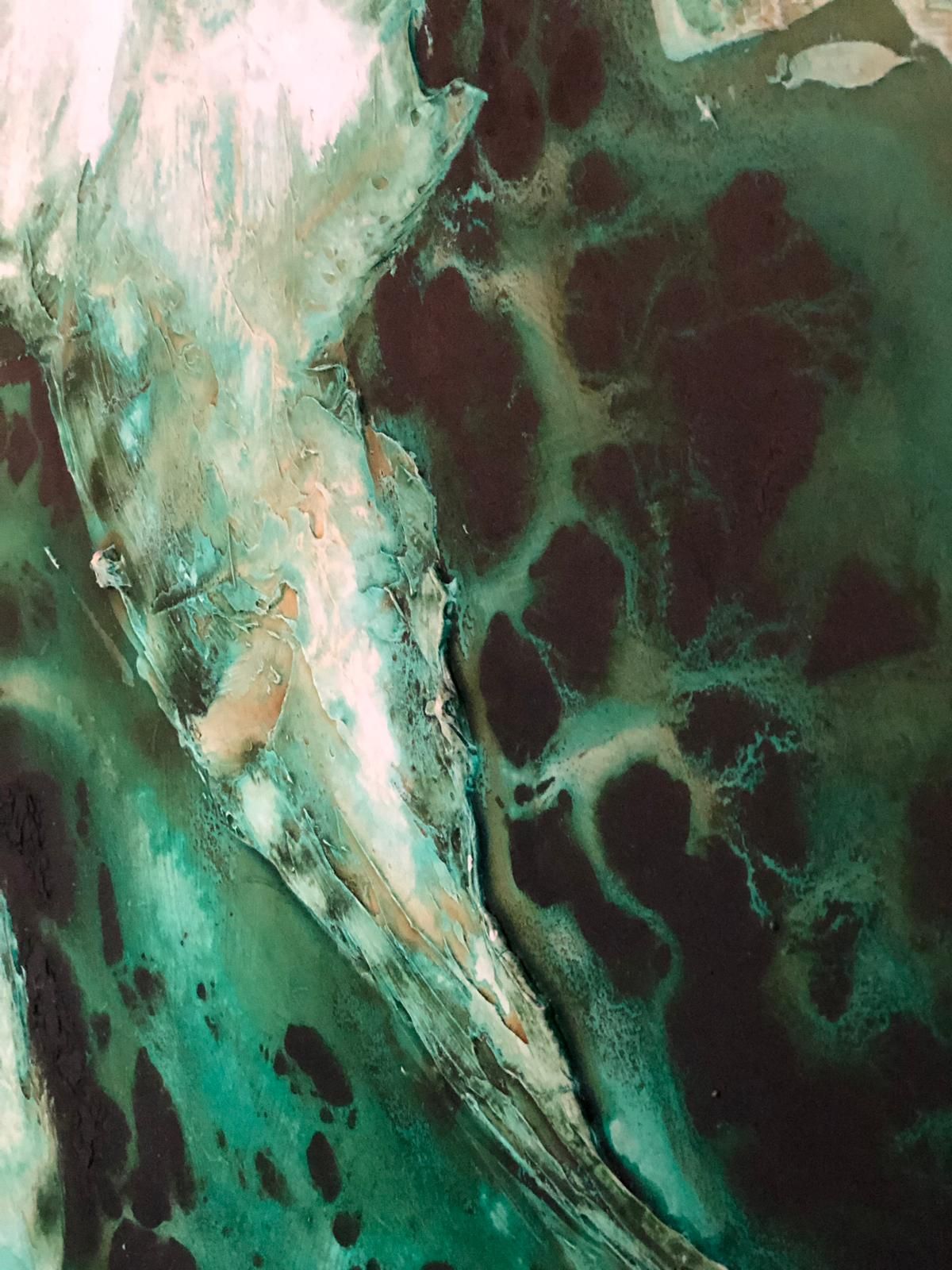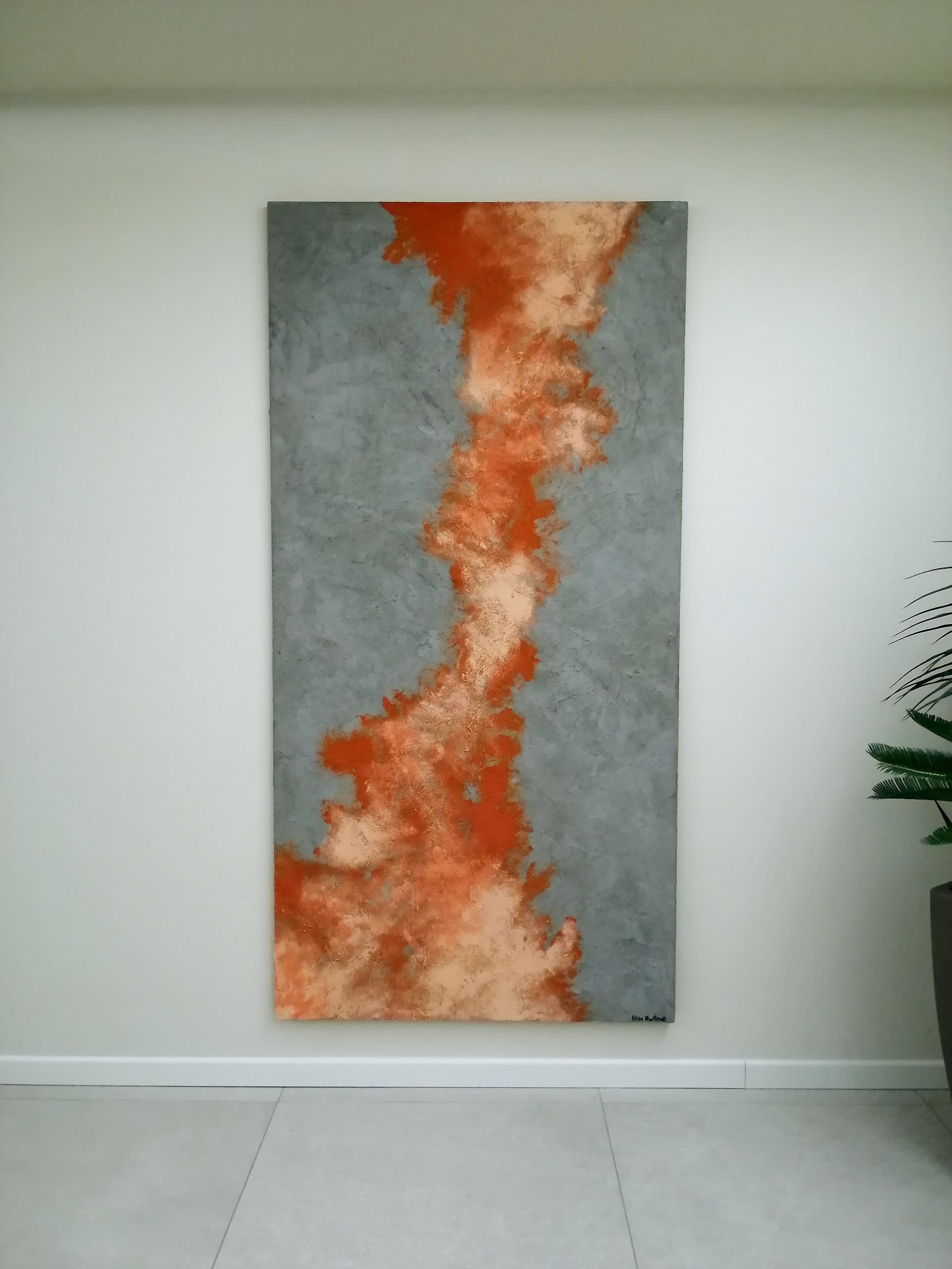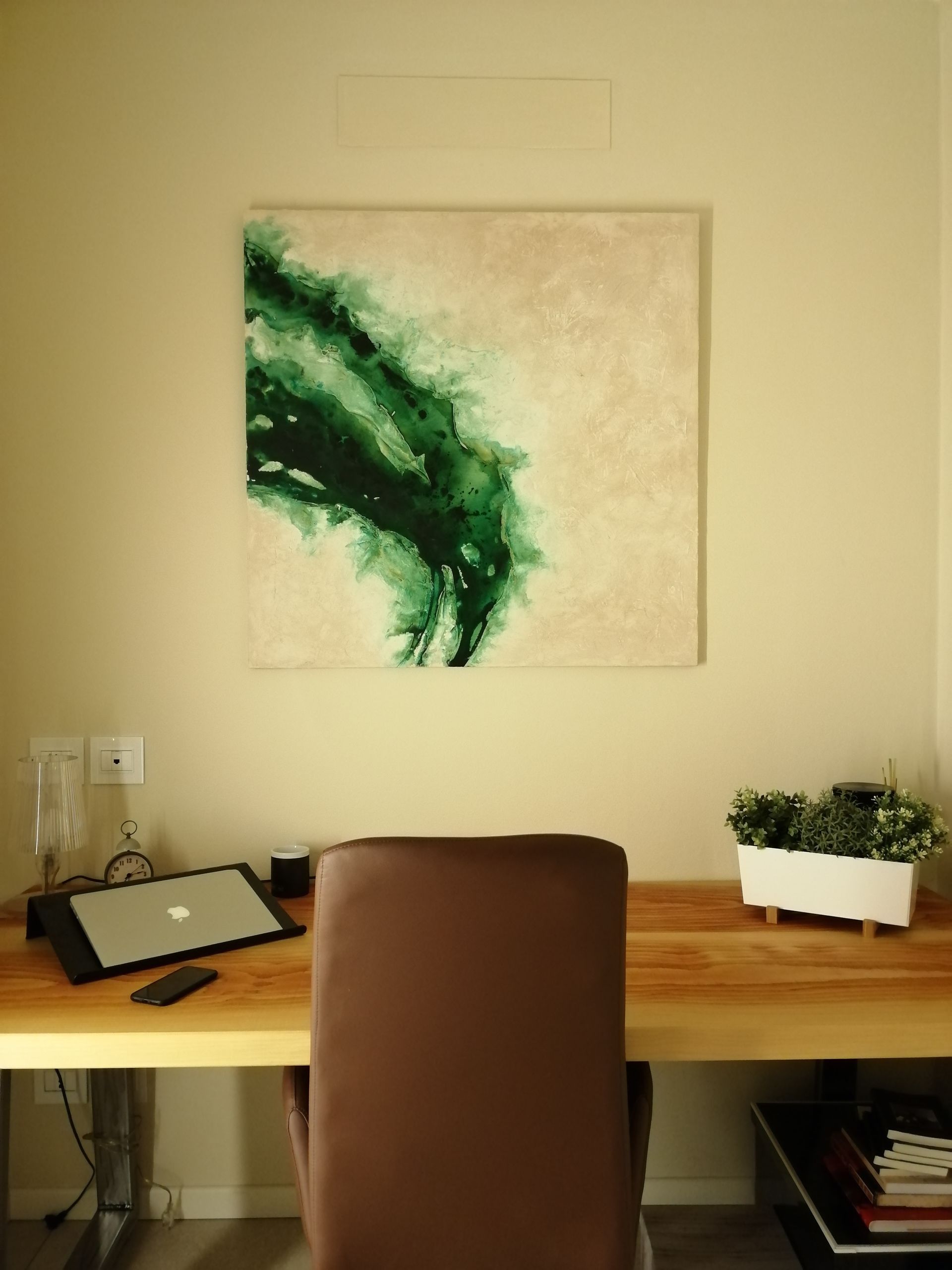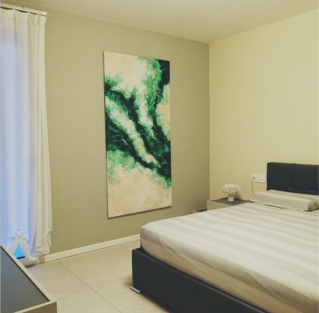 Shades of color pervade the home... that's the effect these works have. A bright orange welcomes us at the entrance, while in the bedroom, an emerald green square accompanies the hours spent at the desk, continuing on the front wall dedicated to the sleeping area.