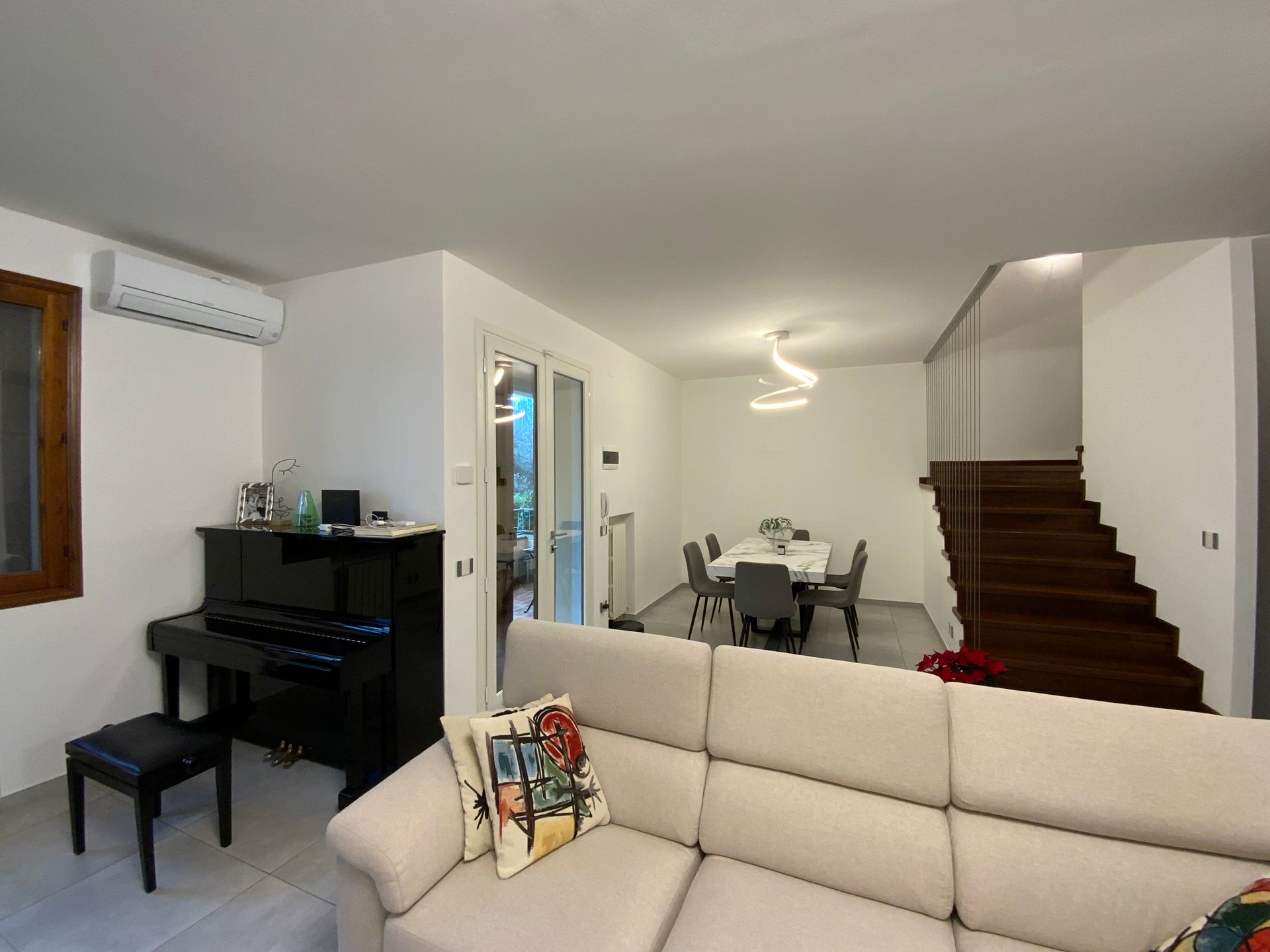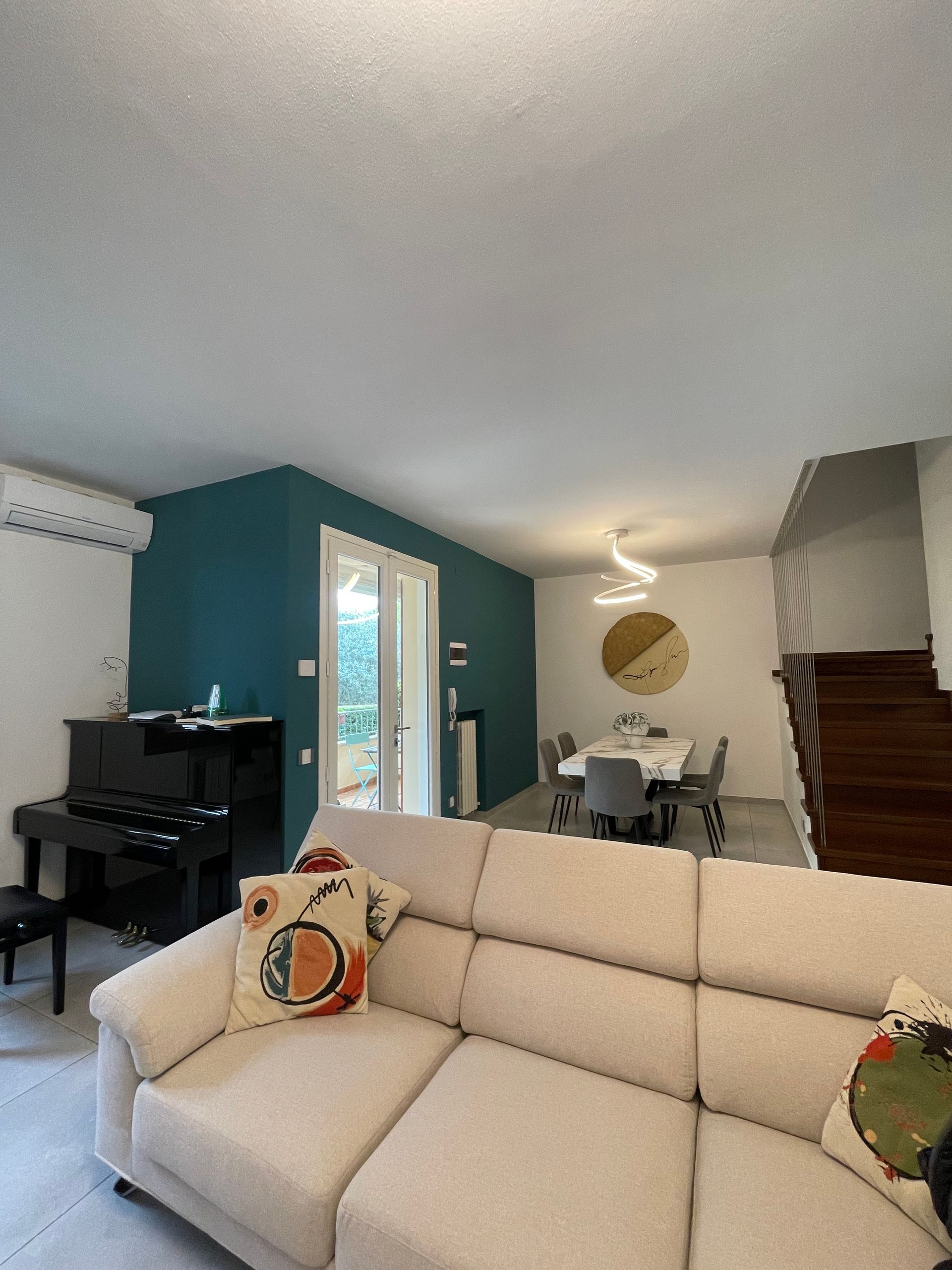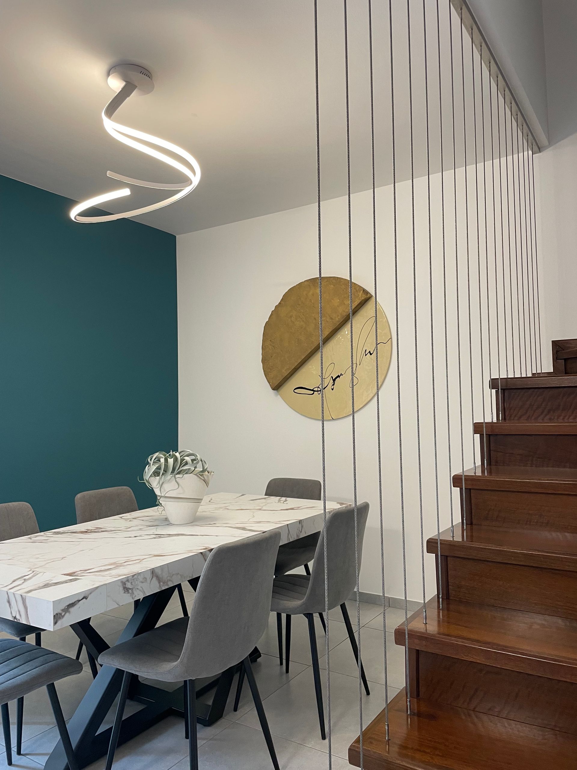 A few changes, a great result! Light colors and golden hues for this commission. The contemporary round ceiling now brightens the dining room and also highlights the wooden staircase. The suggestion to create a box of color by painting only two walls completed the whole look.