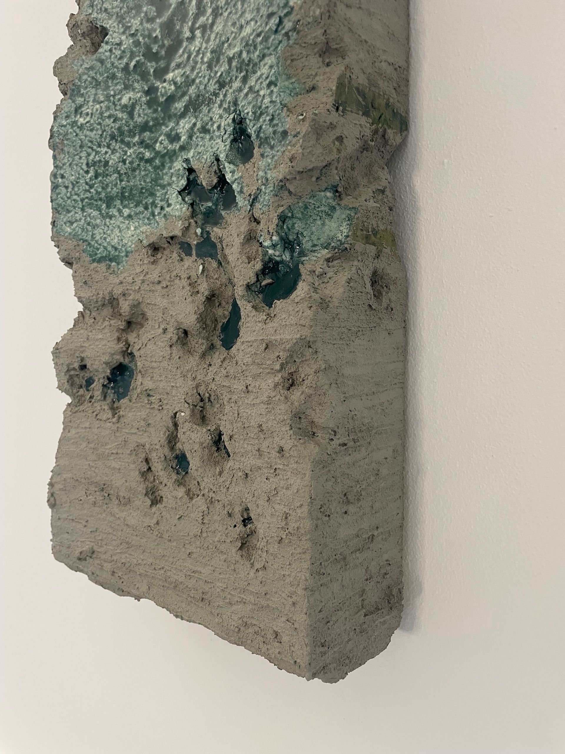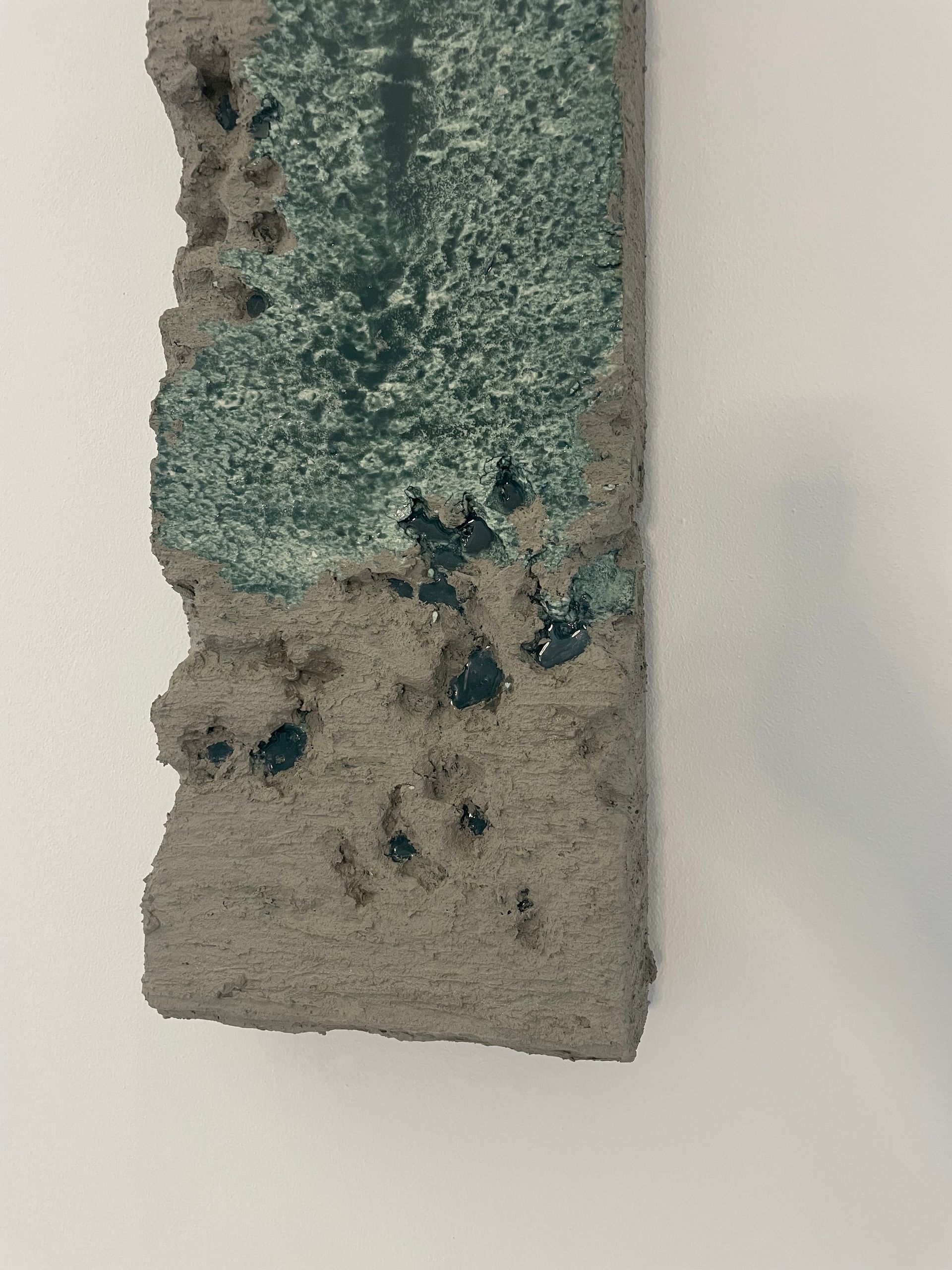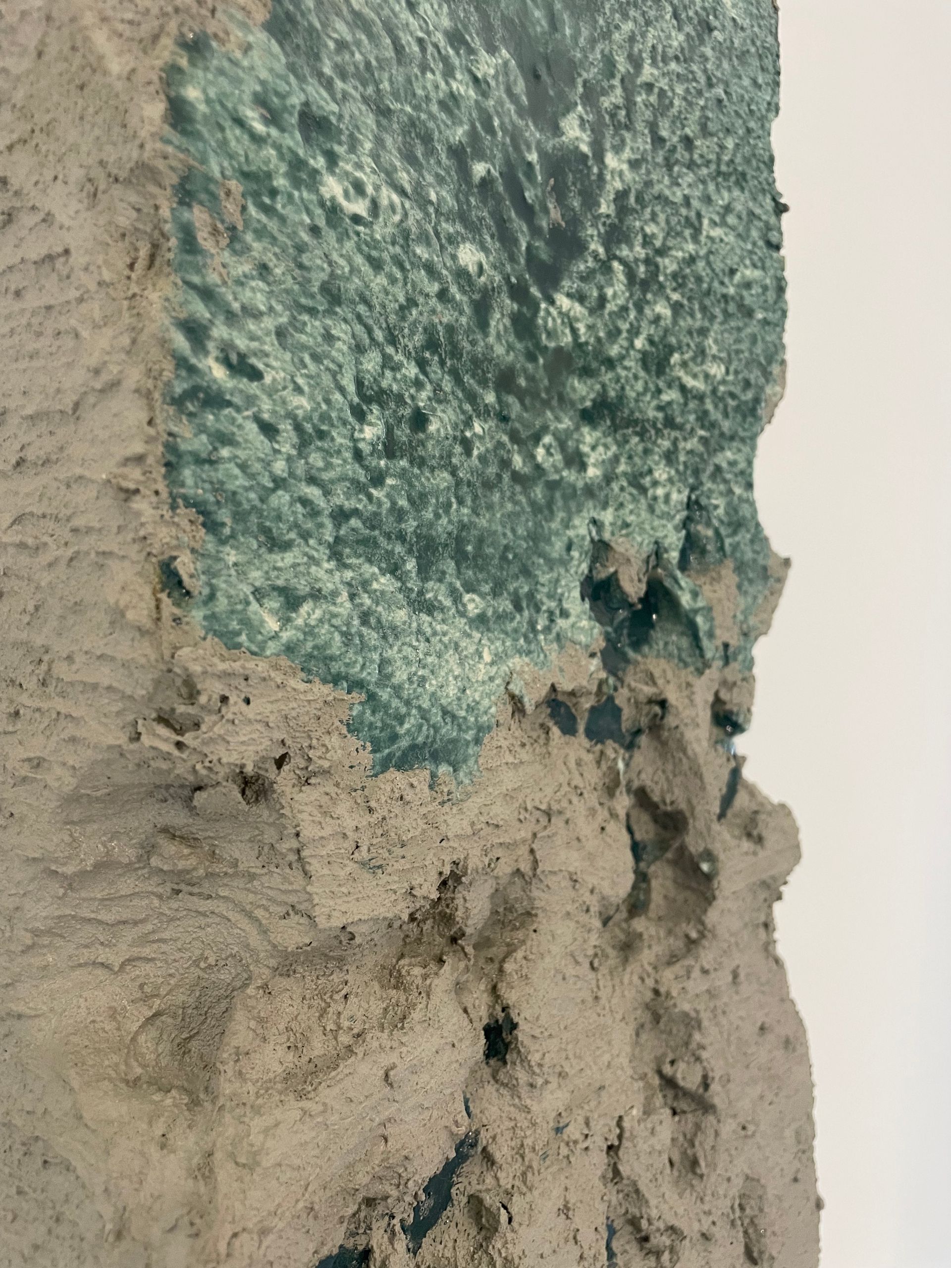 Verticalità è la parola chiave. La forma slanciata verso l’alto valorizza questo pezzo. Le crepe quì iniziano a diventare profonde, lasciando trasparire il fondo che sta dietro. Sono crepe senza meta. Cemento e resina spatolata. Le texture si intrecciano creando giochi di sfumature e di materia.