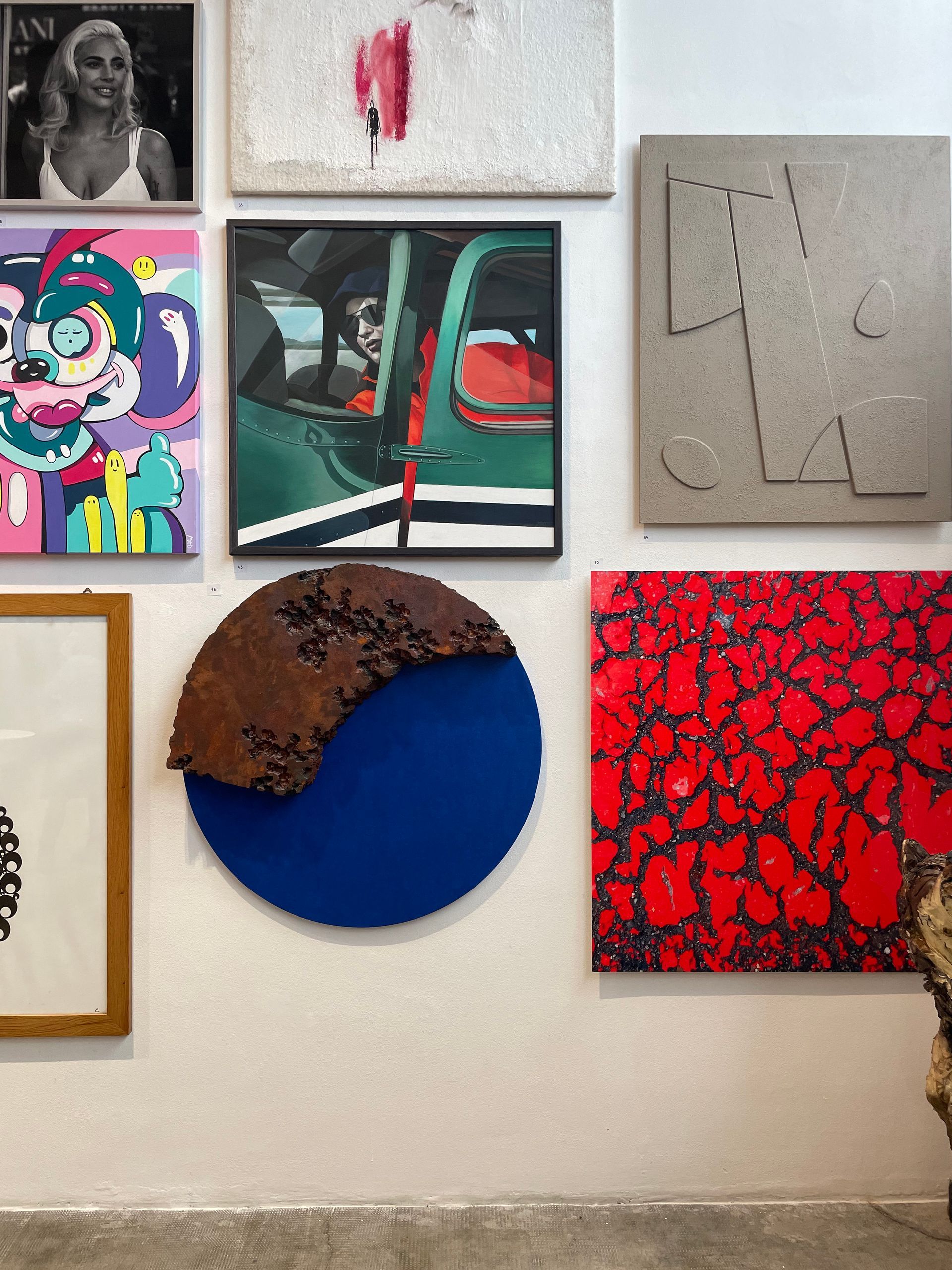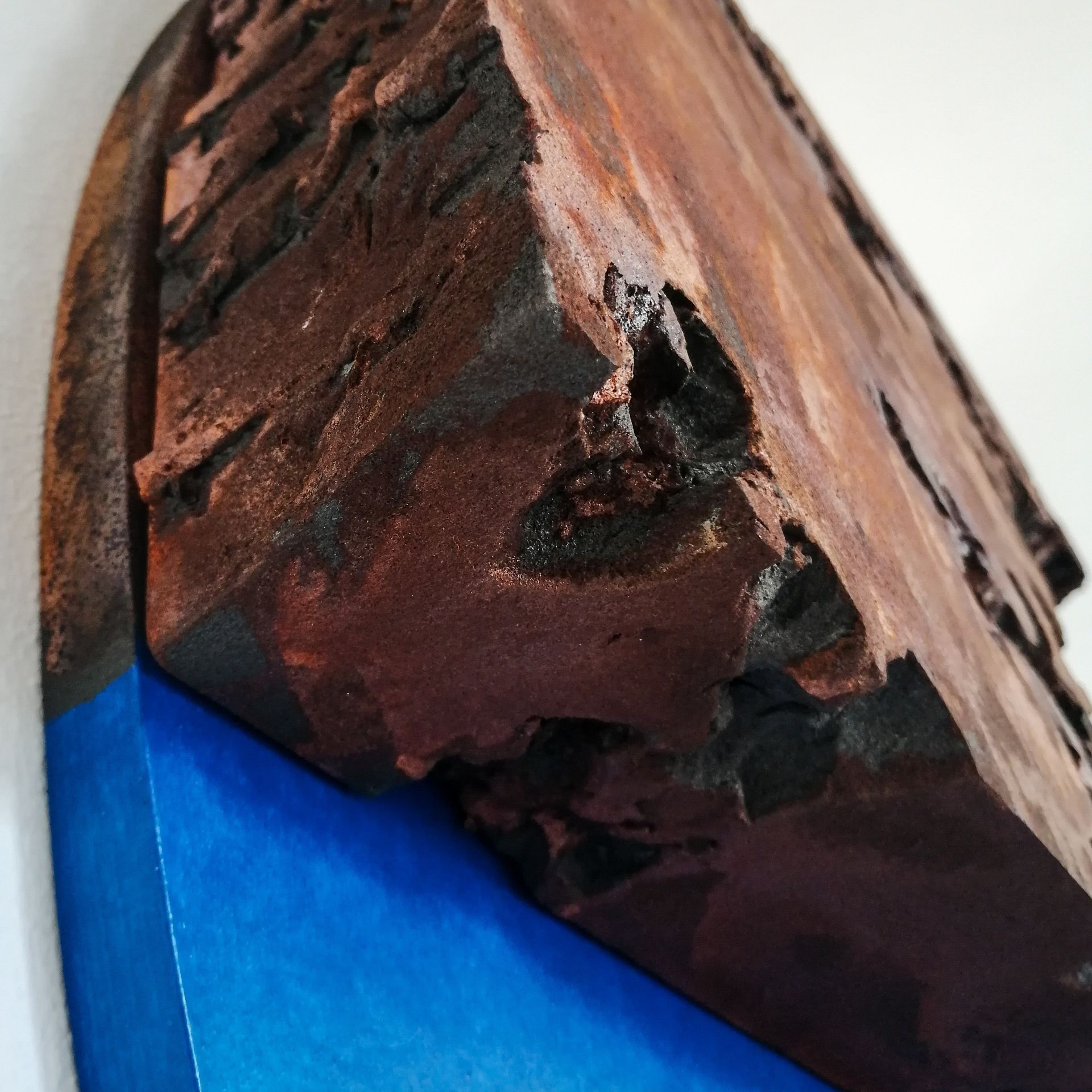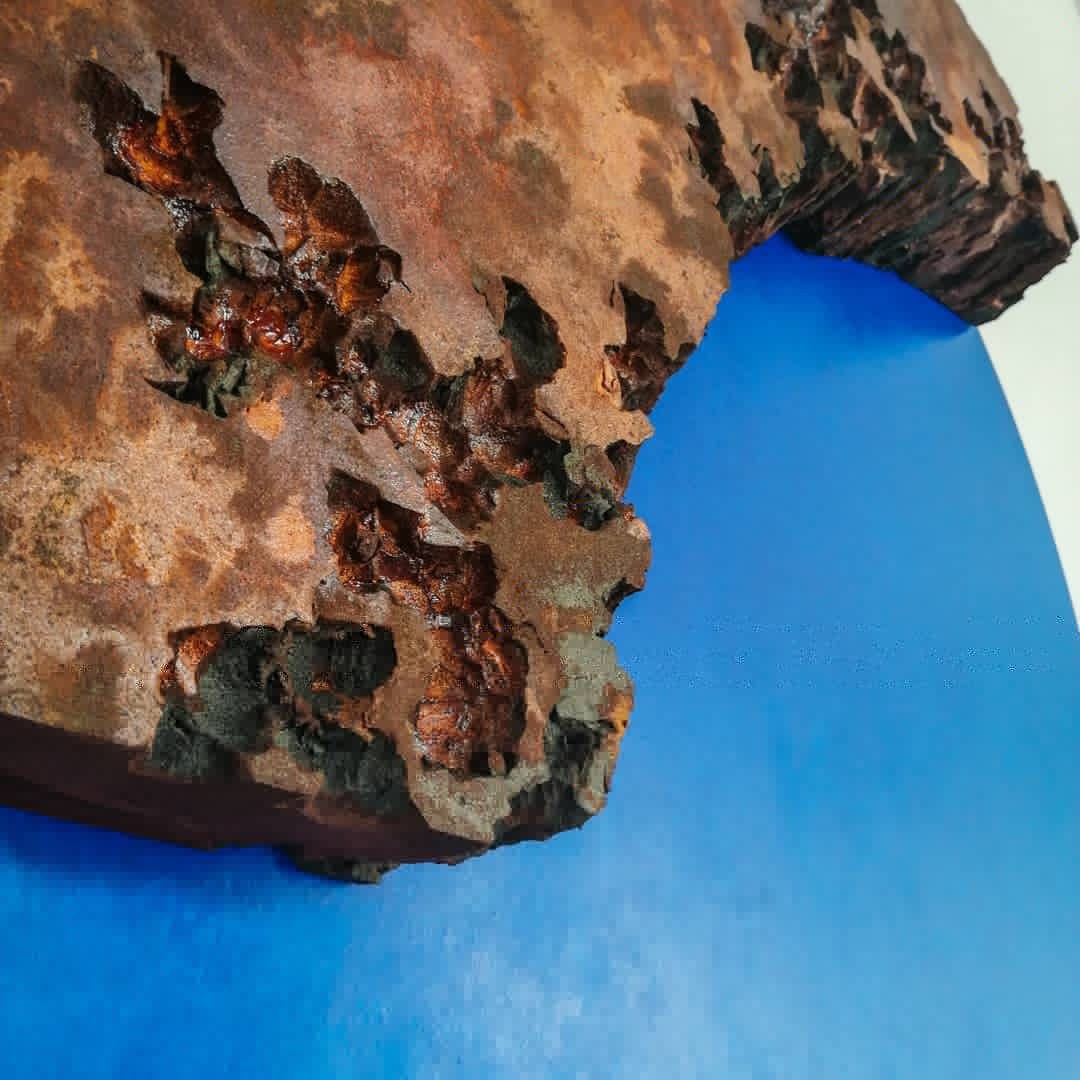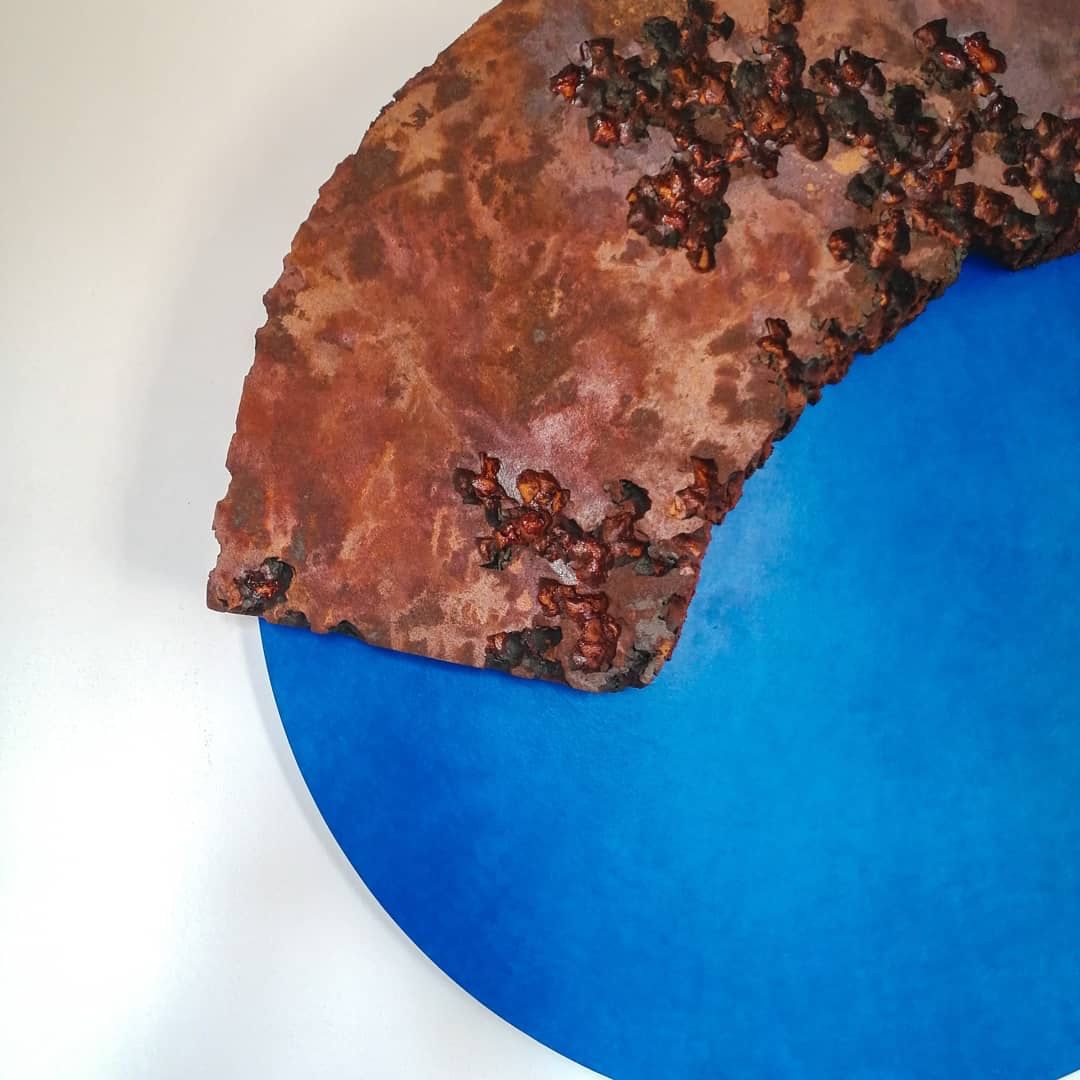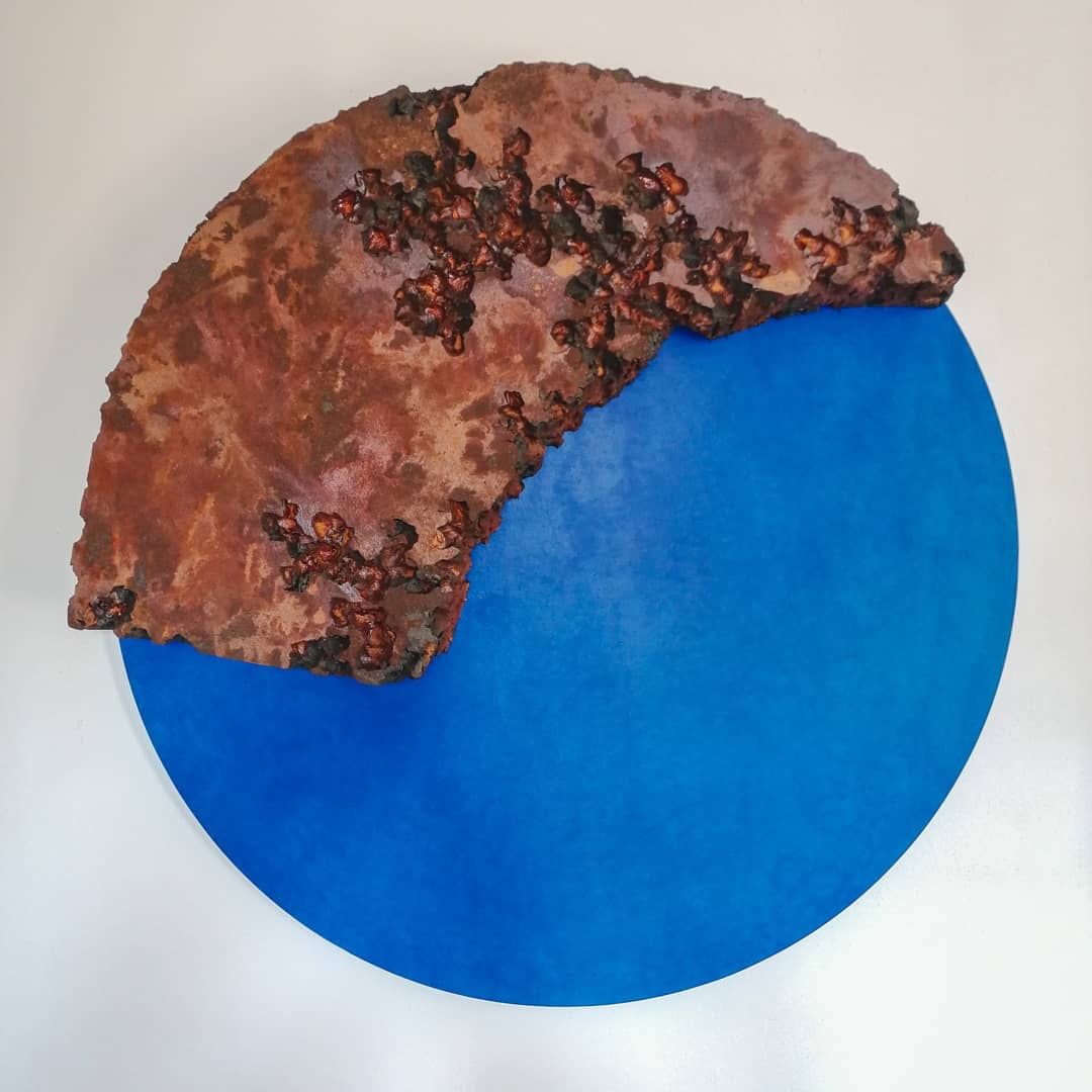 Il tondo rimasto incompleto come se un pezzo si fosse staccato dall’opera. Le crepe ne sono il risultato. Effetto ruggine e blu intenso. L’opera ha fatto parte della mostra collettiva nella Galleria d’arte Gare 82.