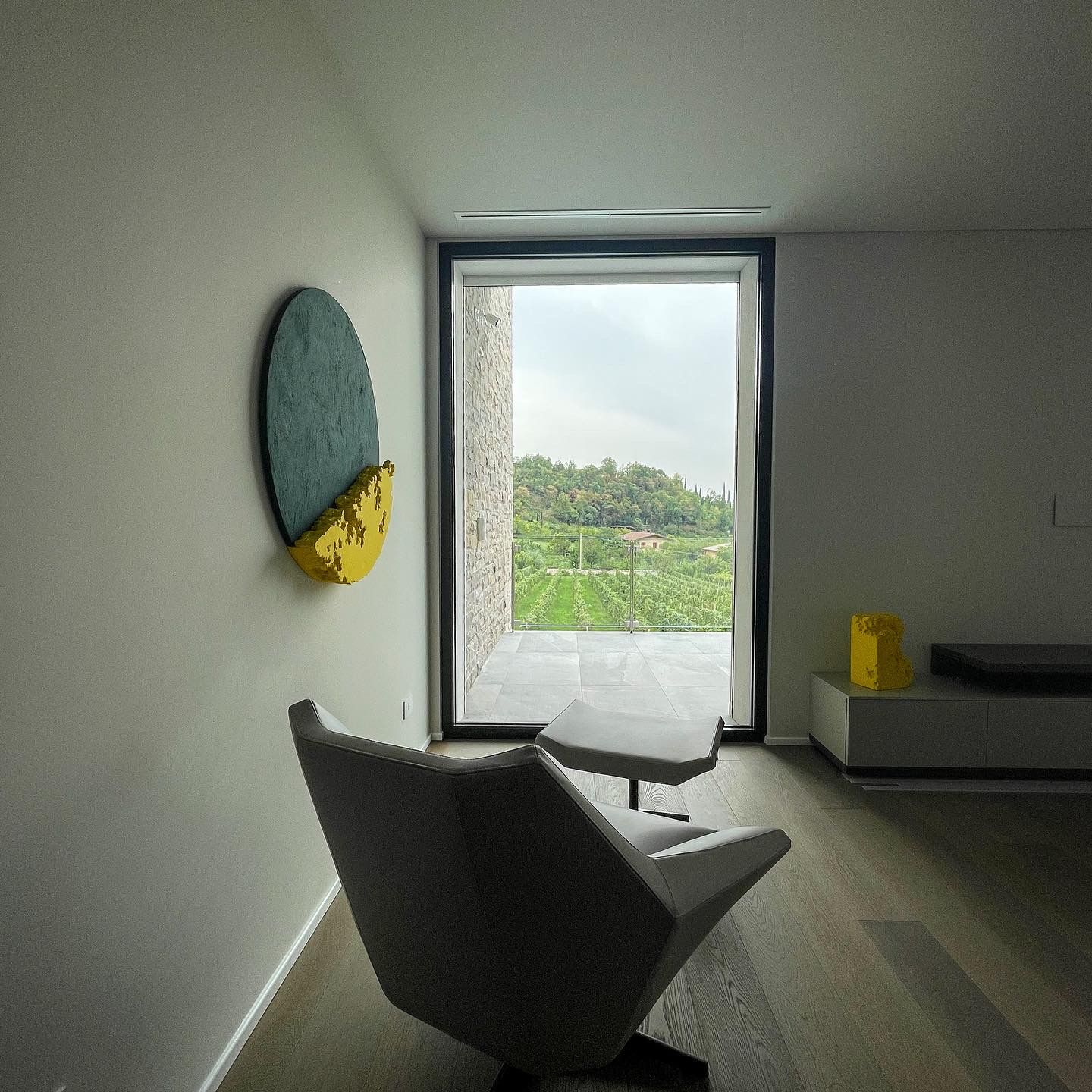 Luce, vetrata, vigneti... mancava solo un elemento unico come questo tondo. La sua parte materica si rompe e da vita alla scultura che diventa un pezzo da poter spostare dove si desidera. Anche i colori richiamano l'esterno. Il sole e la natura entrano nella casa.