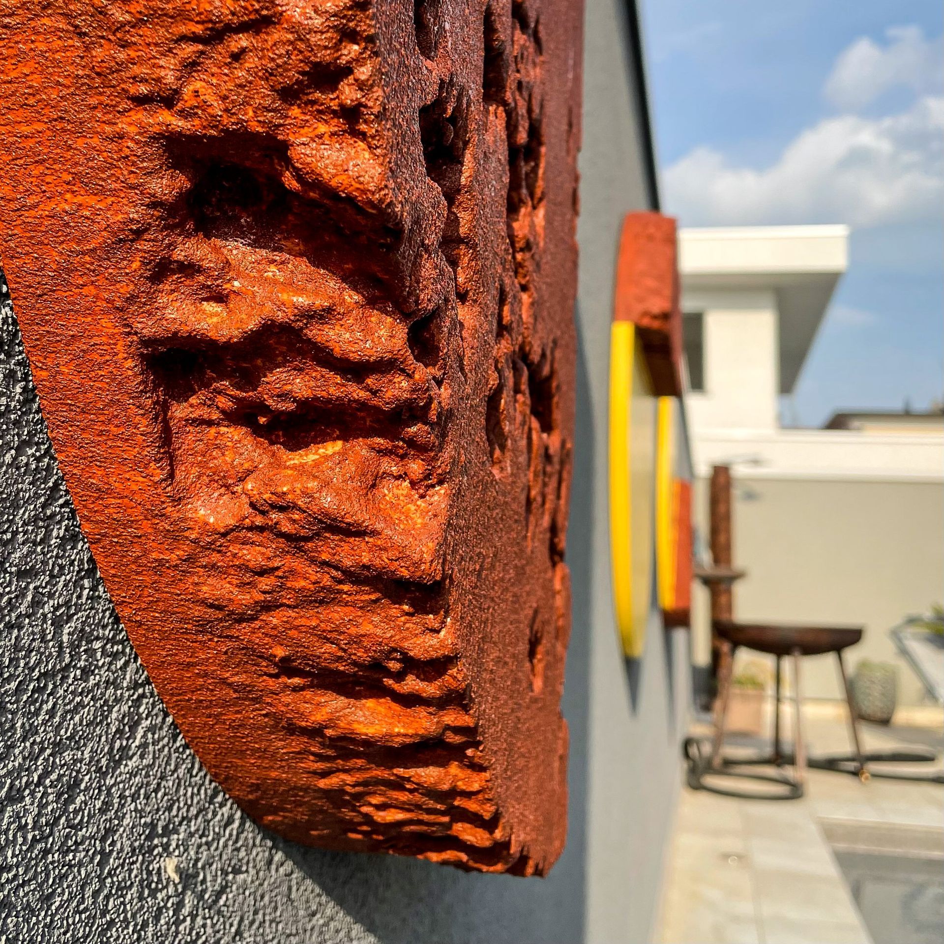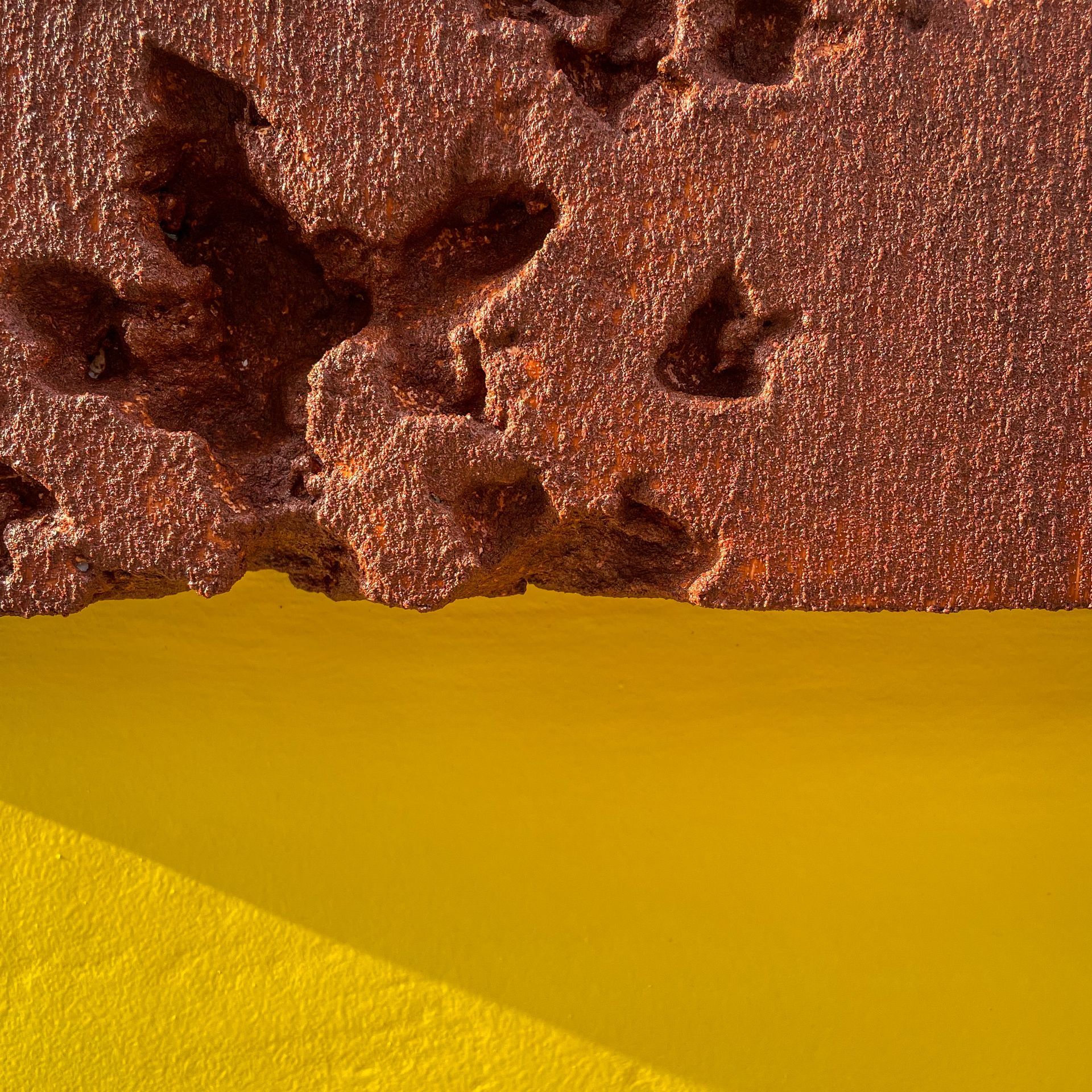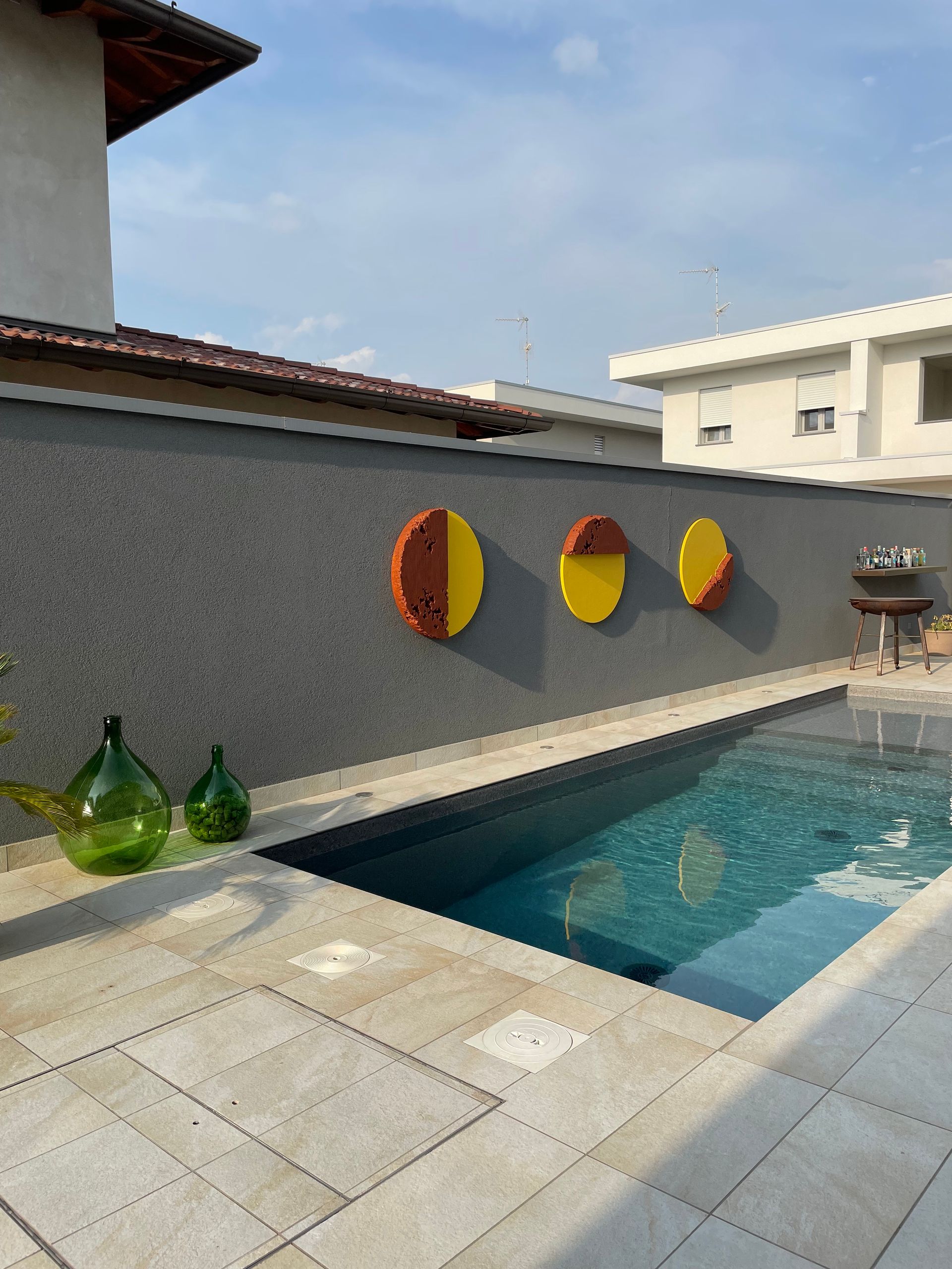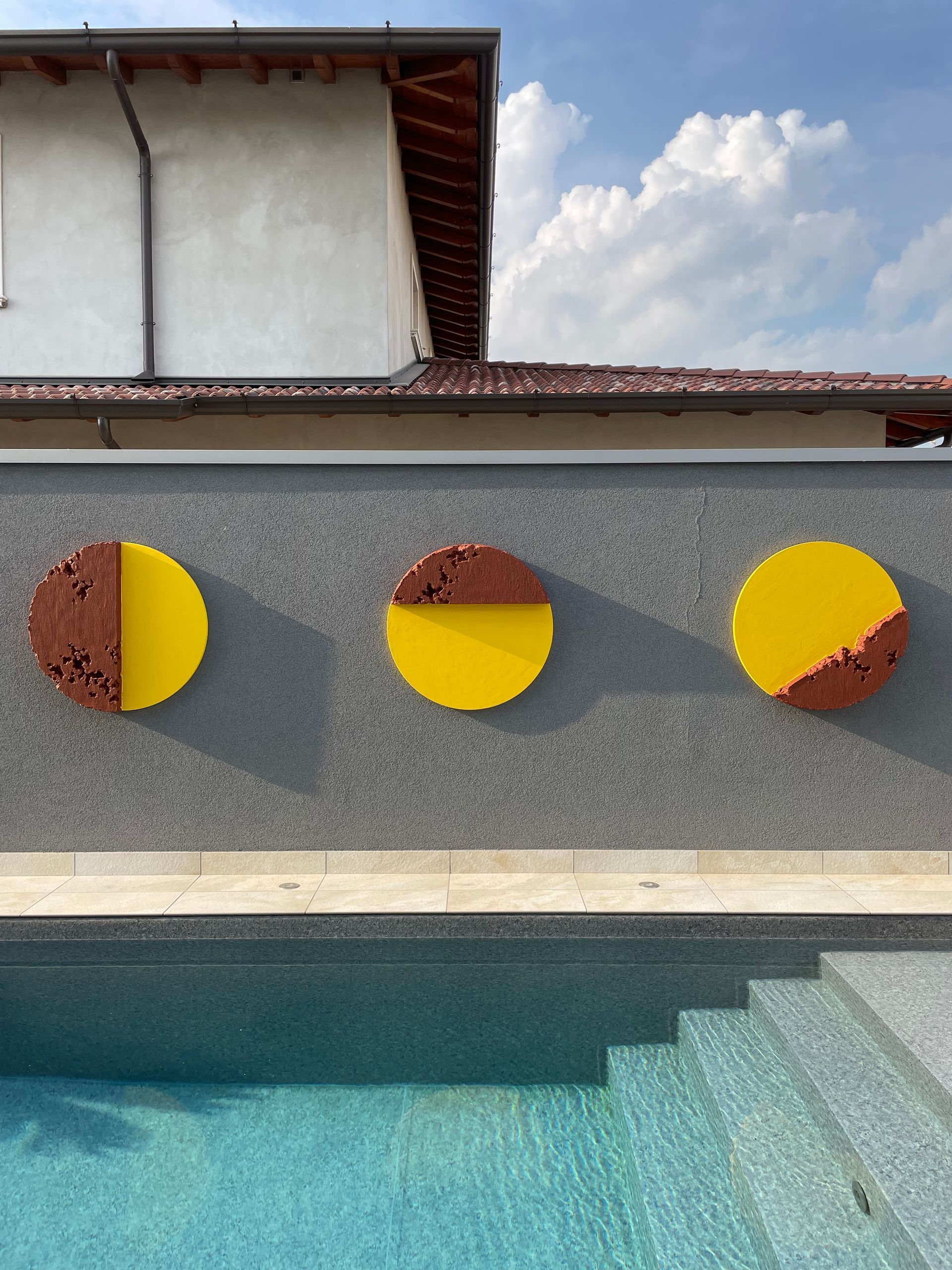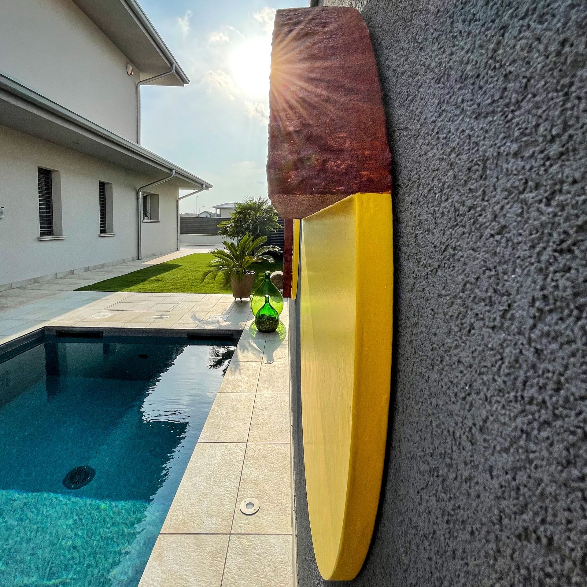 Giallo acceso ed effetto ruggine sono perfetti accostati all'azzurro limpido dello specchio d'acqua. Senza dimenticare le ombre proiettate sul muro durante ogni tramonto!