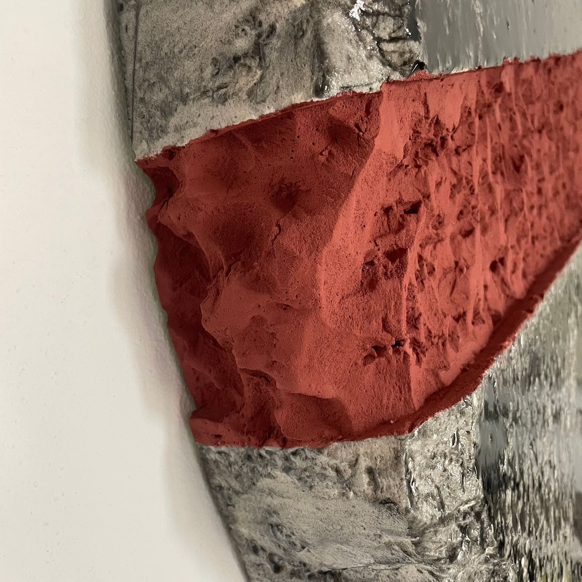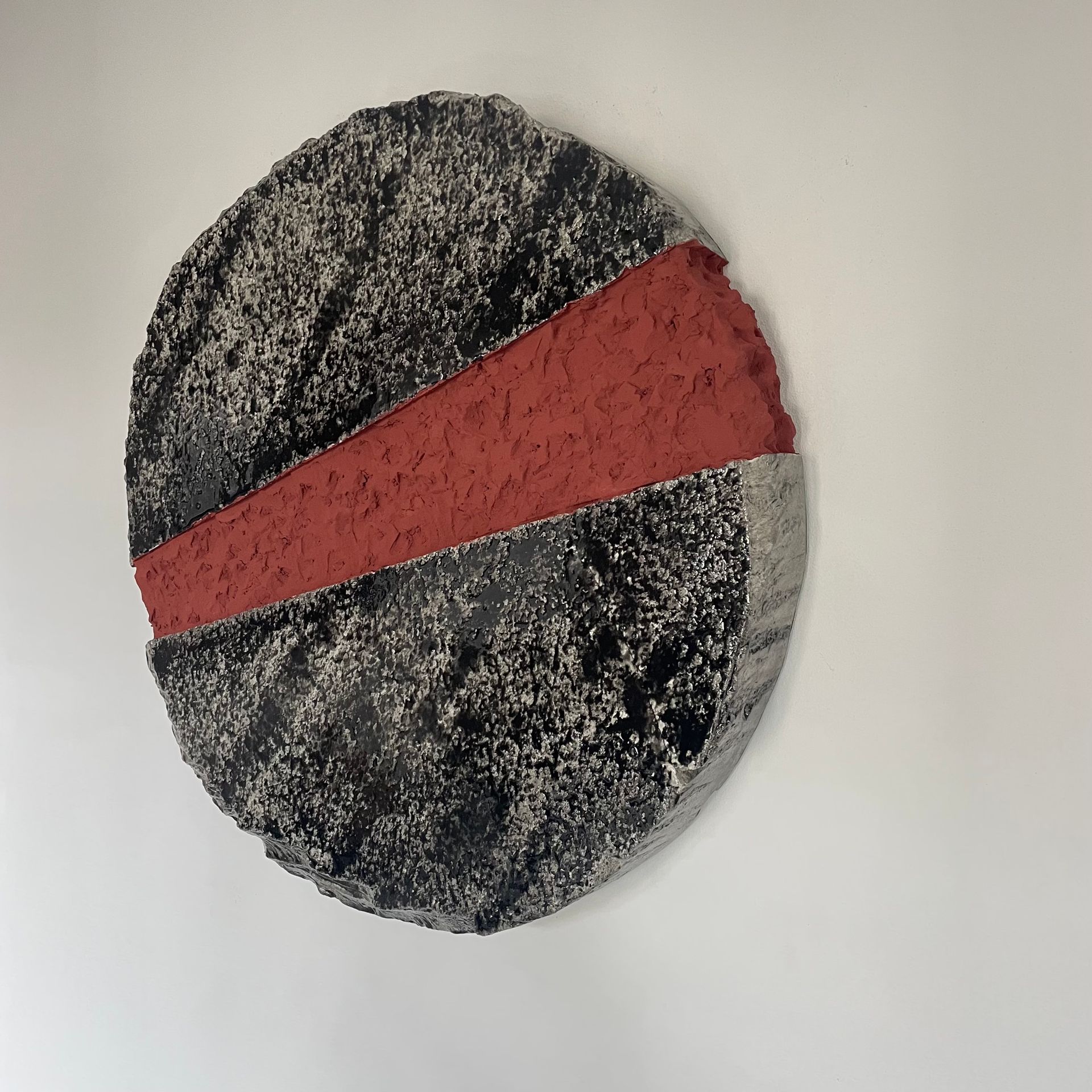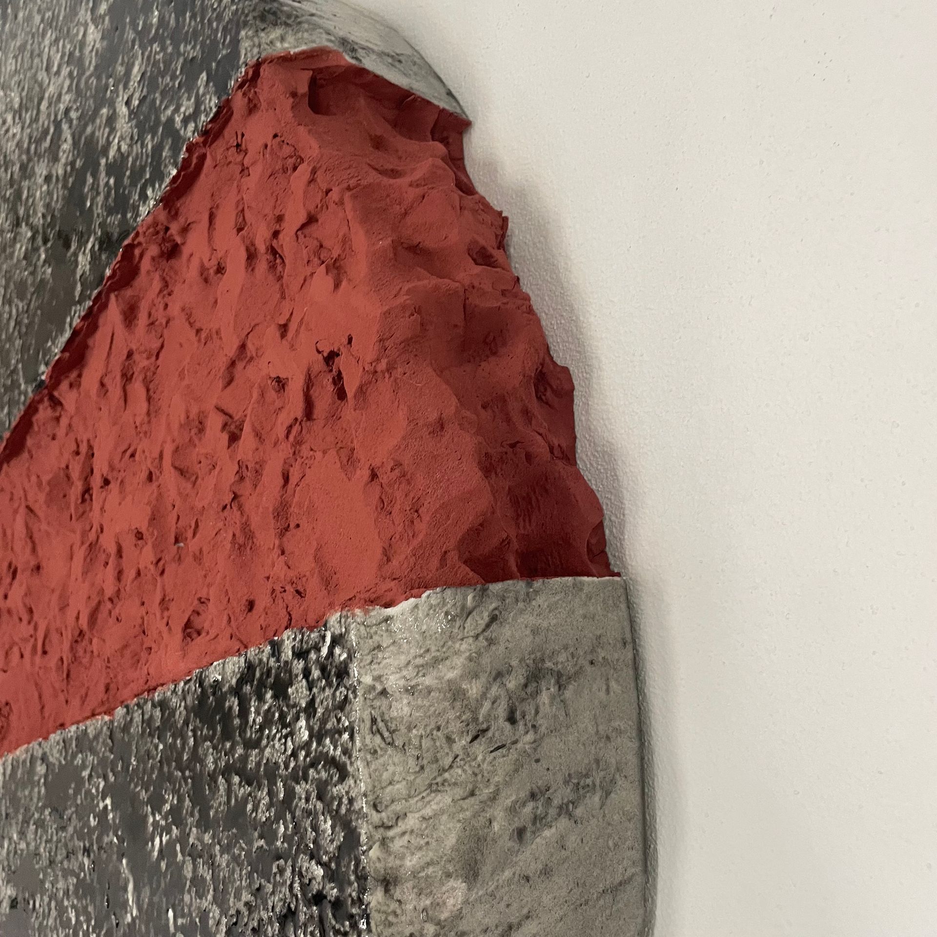 Tondo complementare dell’opera “ Sunrise”. L’accostamento di colori quì è più delicato, ma sempre innovativo. è la parte geometrica più piccola ad avere una maggiore profondità e a spiccare per le crepe e il tono di terracotta. La parte in cemento invece collassa creando una conca quasi al centro dell’opera.