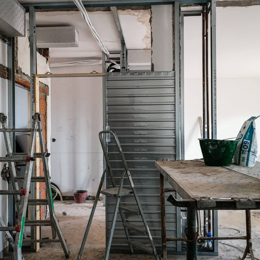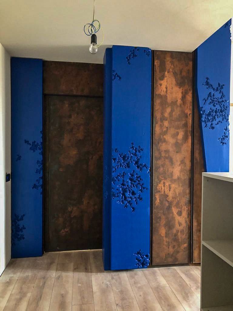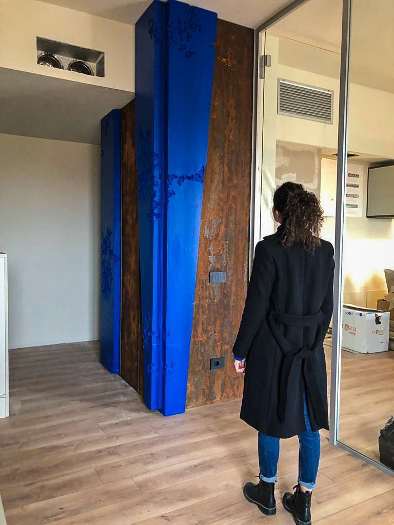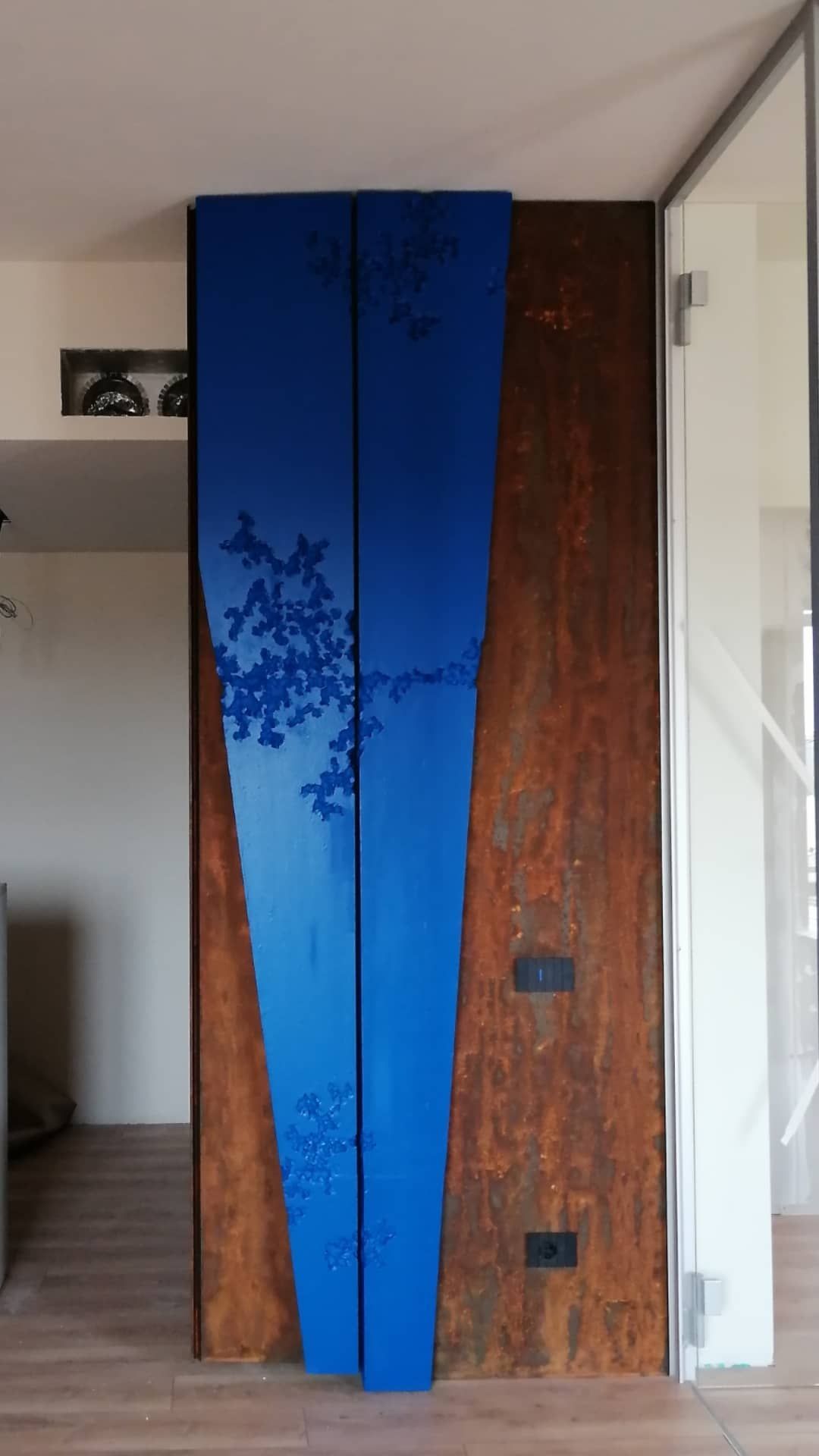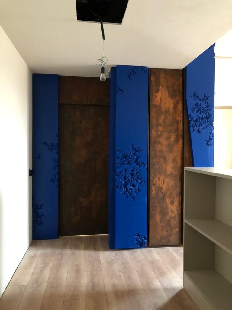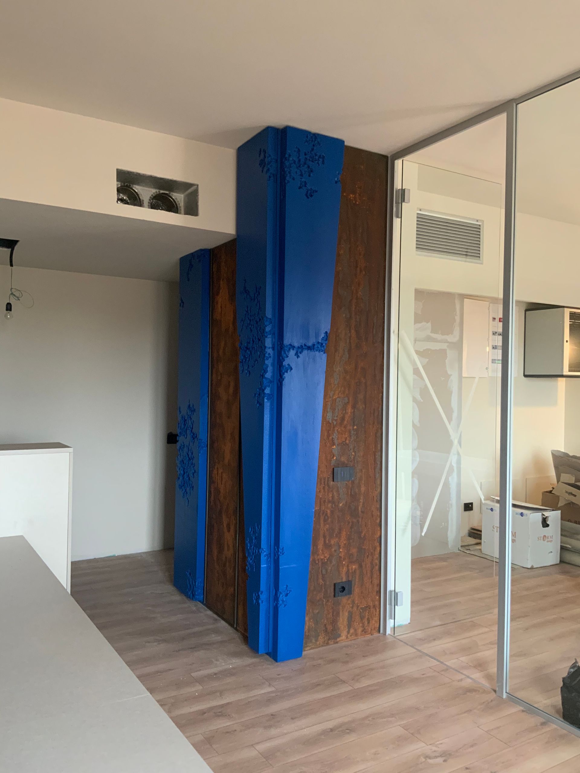 Parola chiave "uniformità". Questa volta si tratta di uno studio d'ingegneria. Porta scorrevole, armadio a tre ante e parete volevo diventassero una cosa sola. Ora entrando tutto ciò risulta nascosto e l'impressione è quella di essere di fronte soltanto ad una grande opera d'arte!