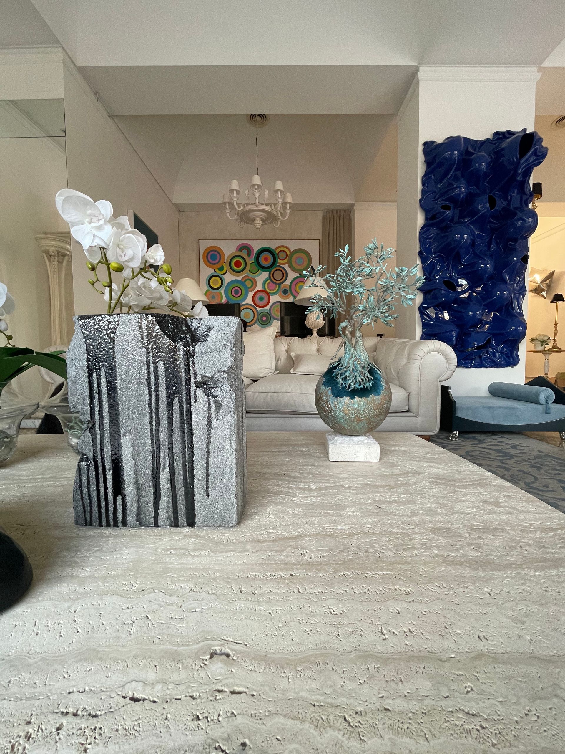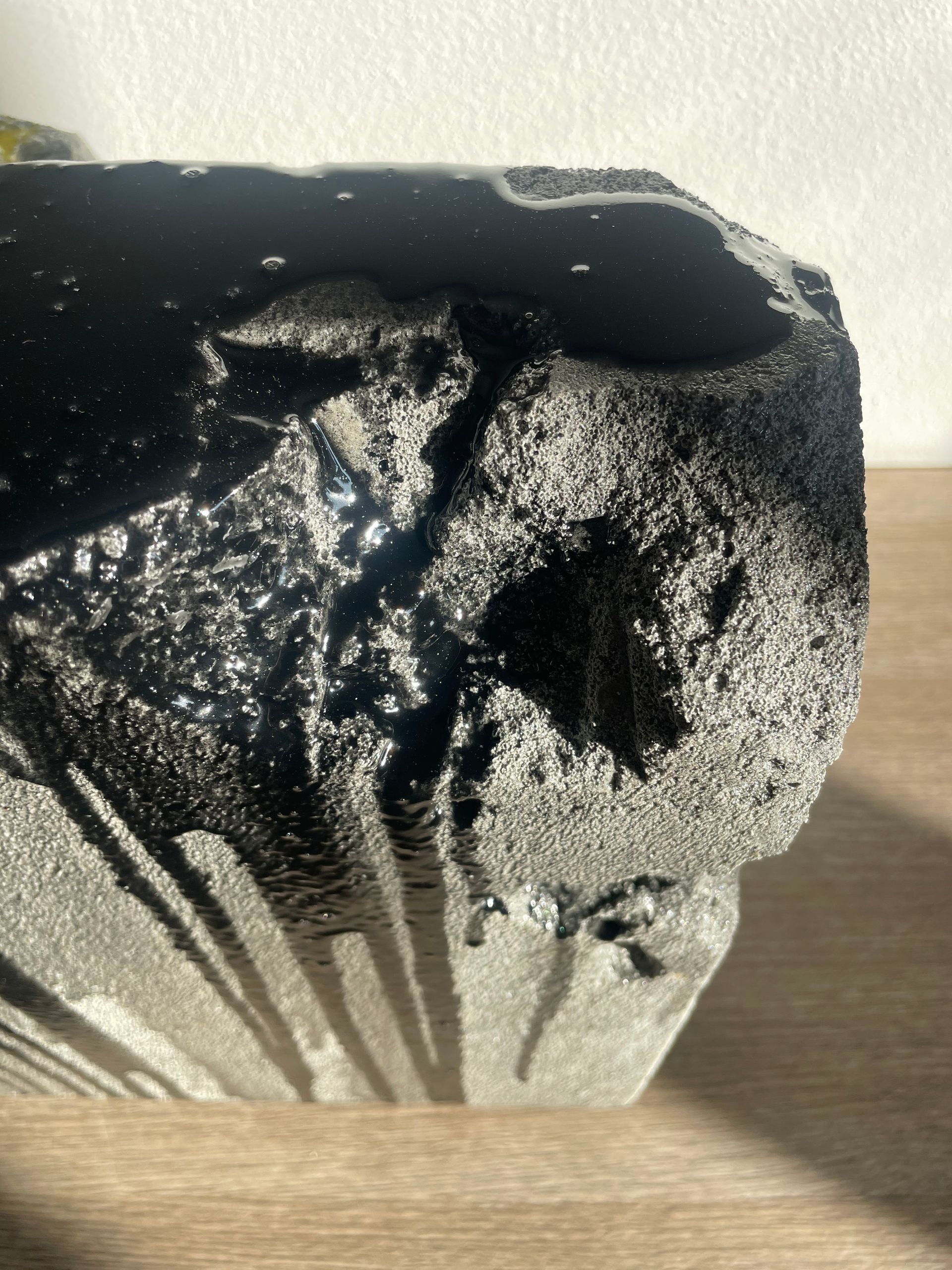 Una colata di resina nera sembra inglobare questo blocco di cemento. La lucentezza di questo dettaglio impreziosisce l’opera.