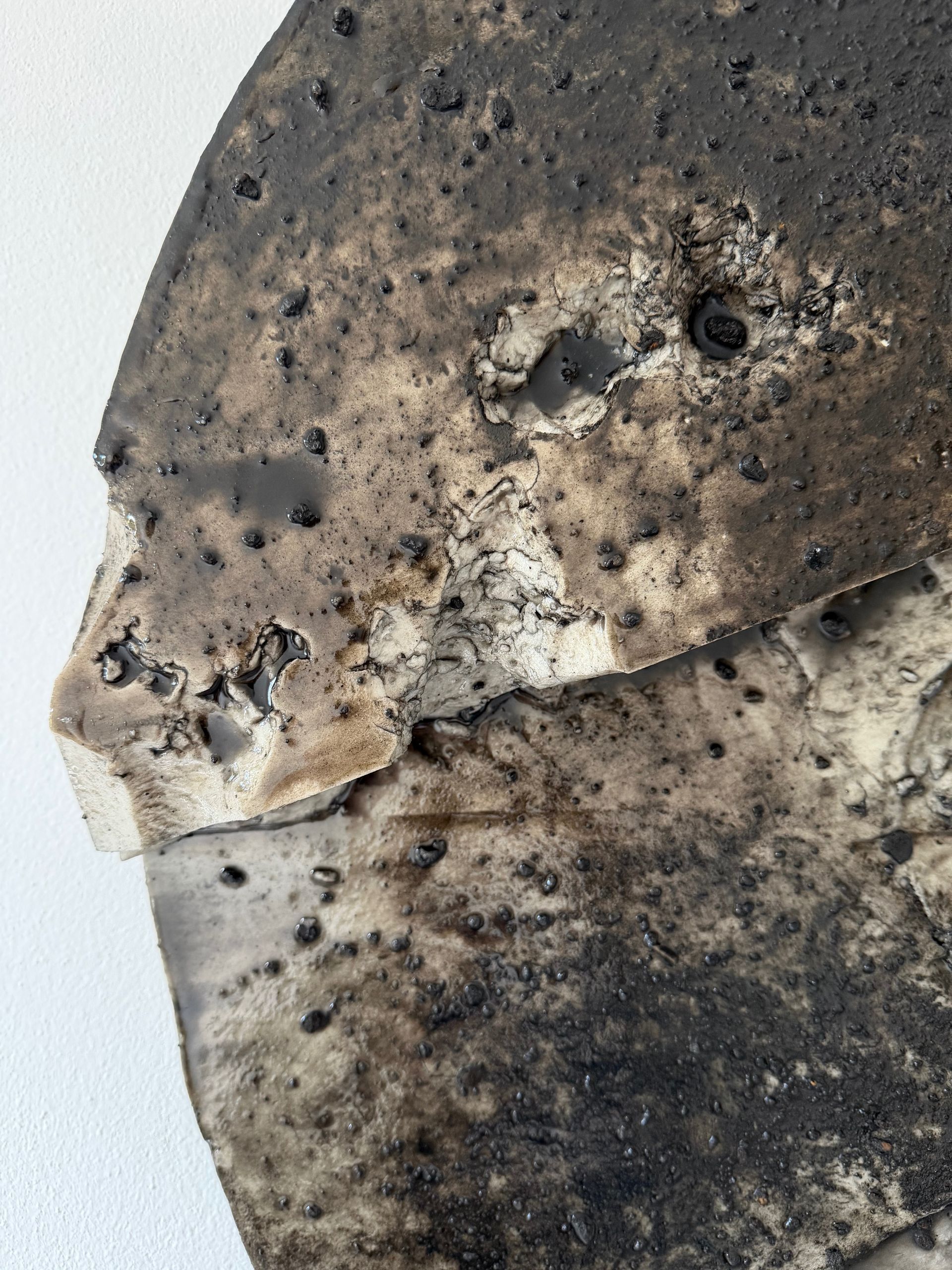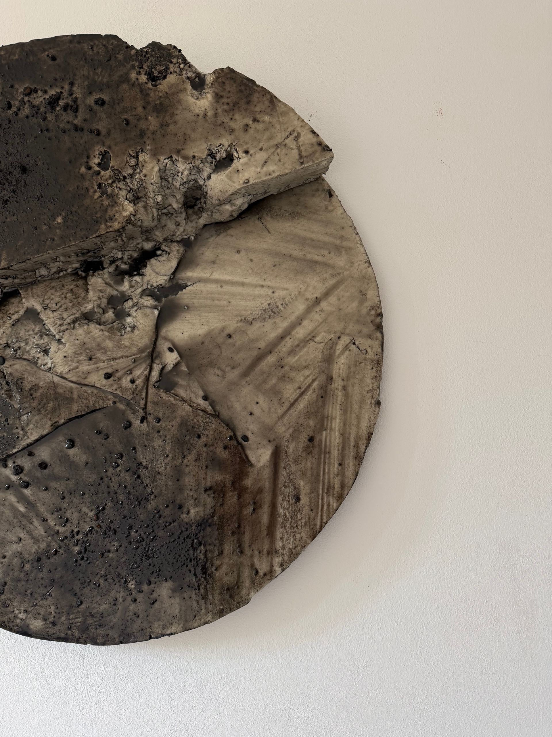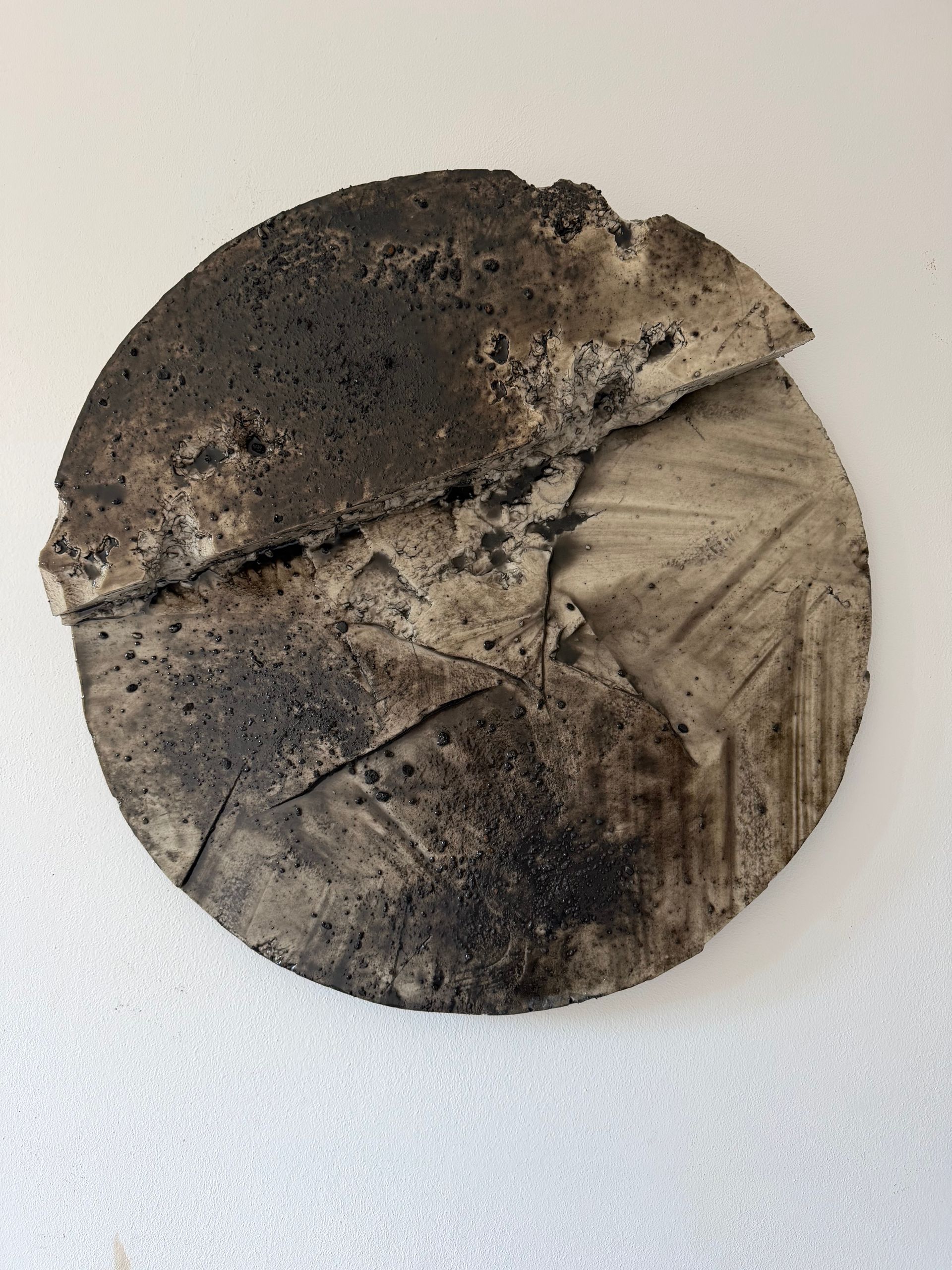 Smoked si presenta come un frammento di memoria minerale, dove la superficie è definita da una stratificazione cromatica che evoca sedimentazioni carboniose e residui.