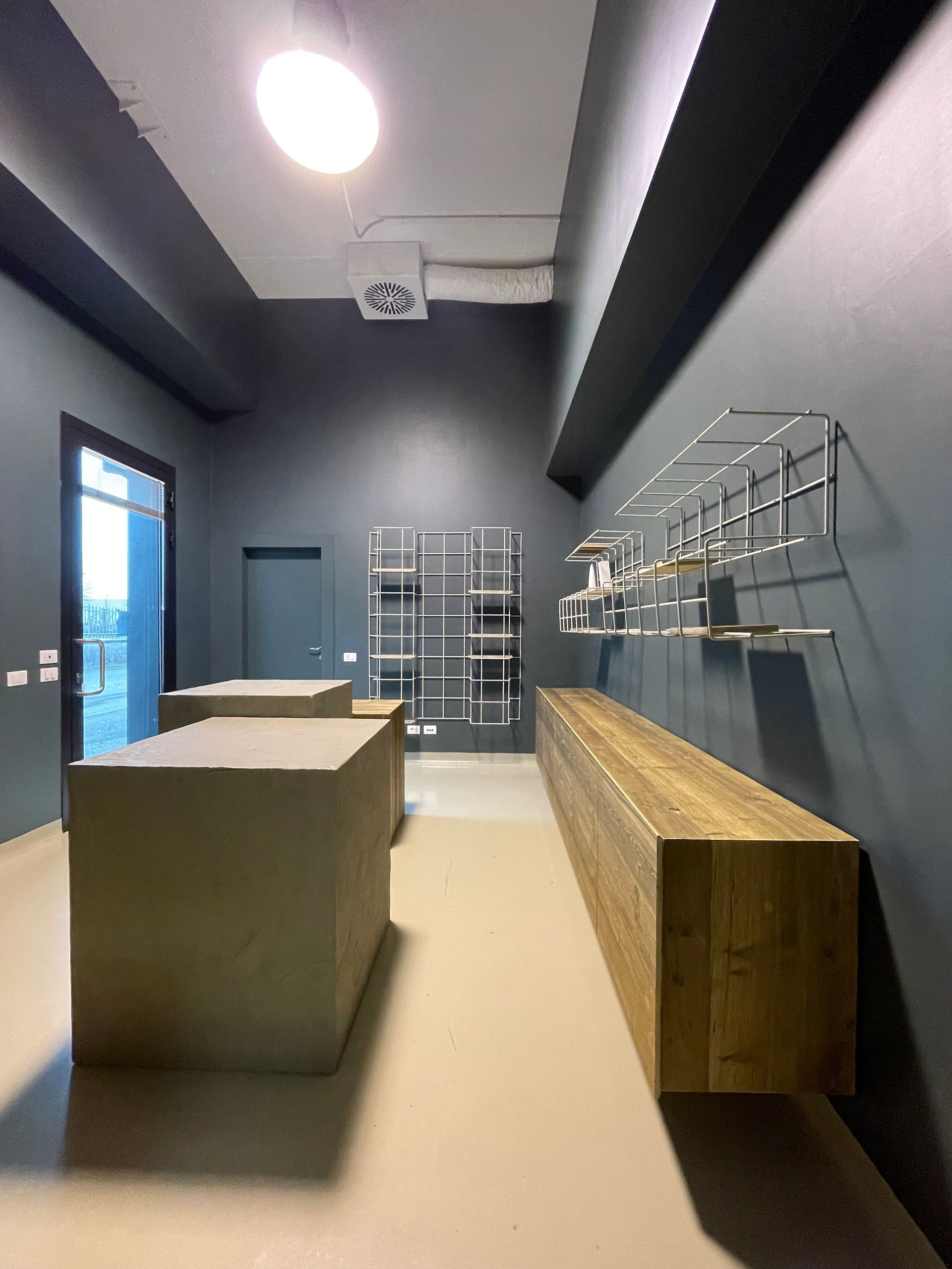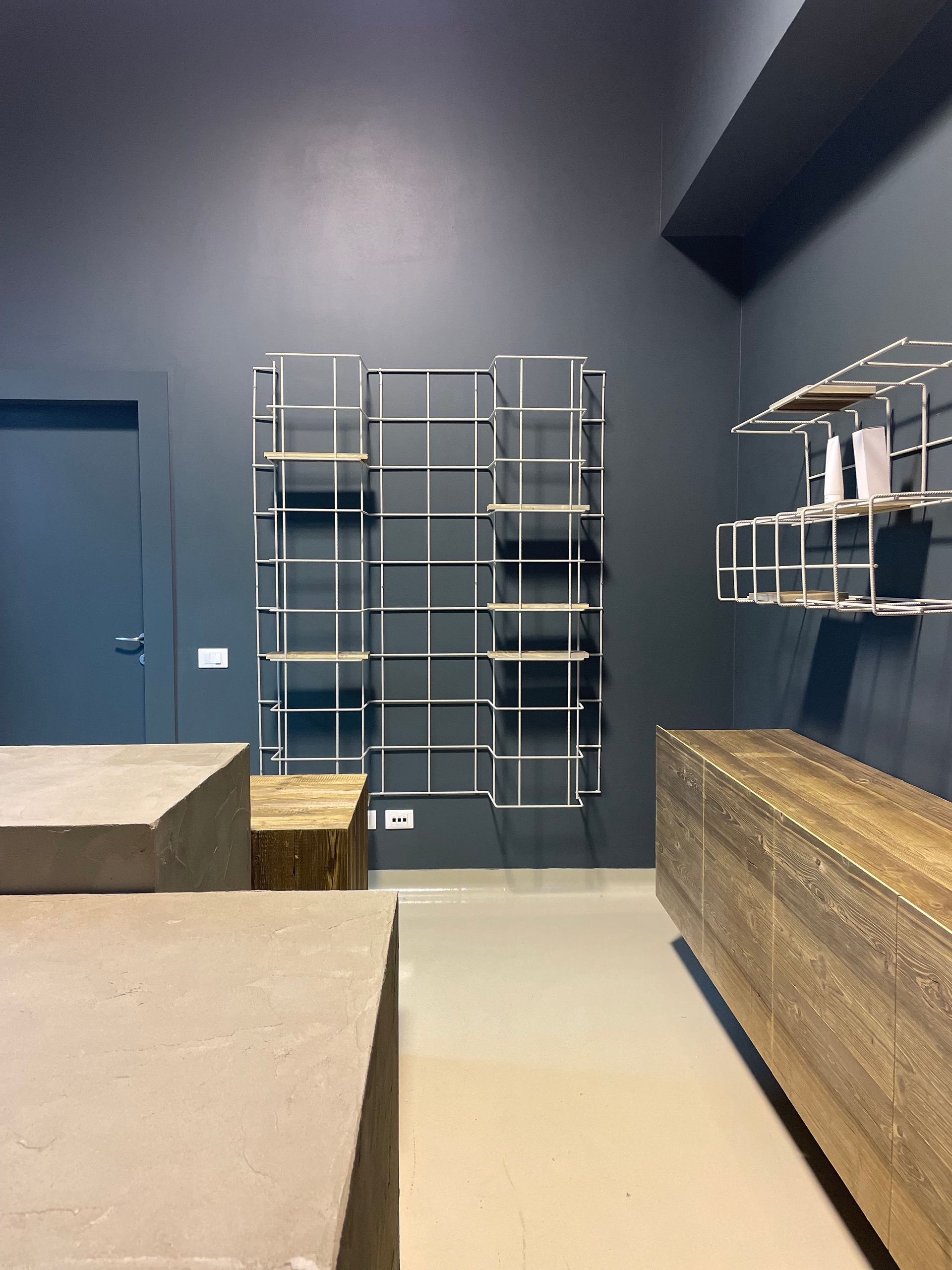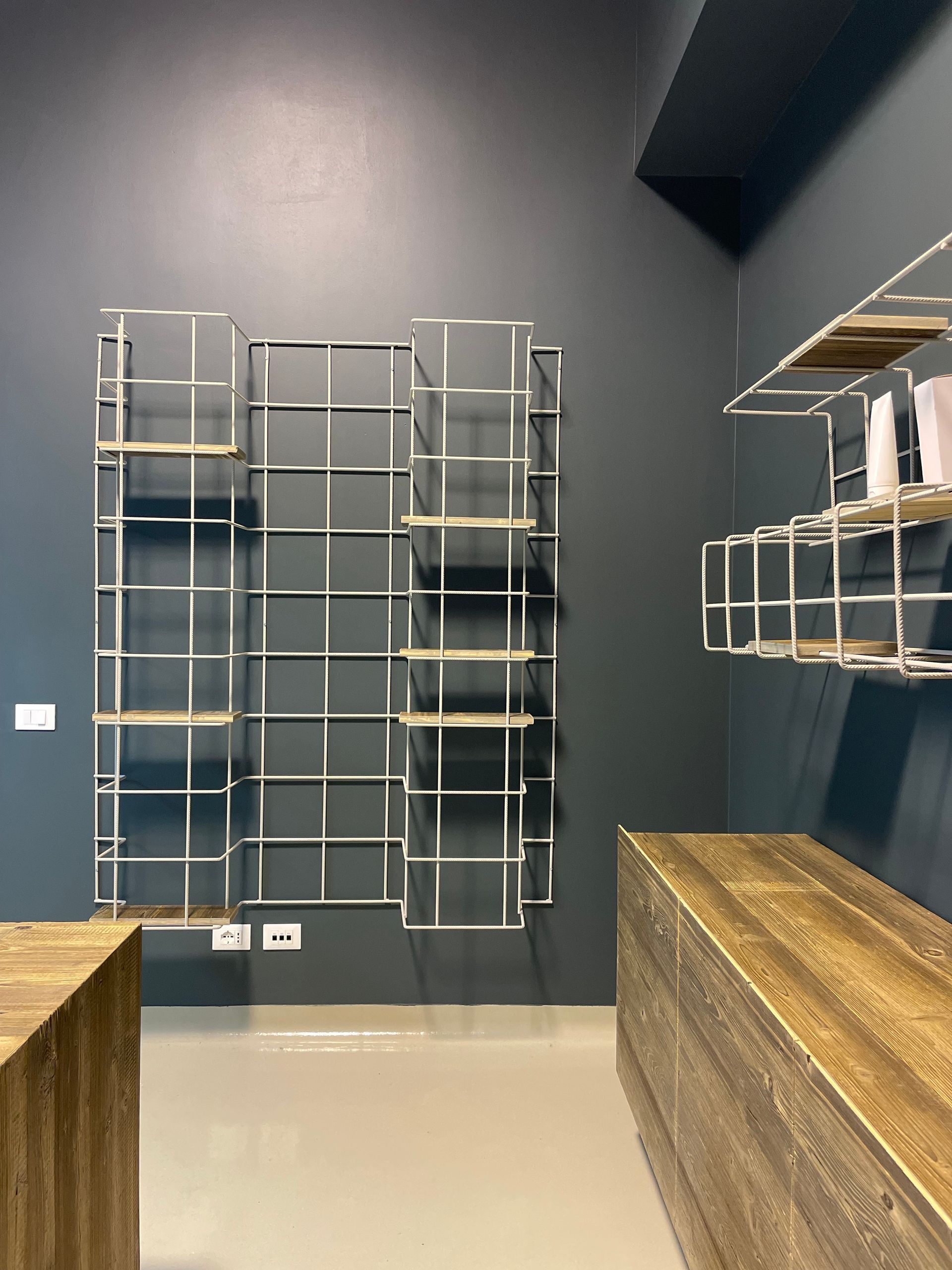 Il progetto prevedeva l'arredo dello spaccio aziendale per una realtà Bresciana. Rete metallica piegata e verniciata, accostata a legno grezzo e cemento... è questo il moodboard scelto.