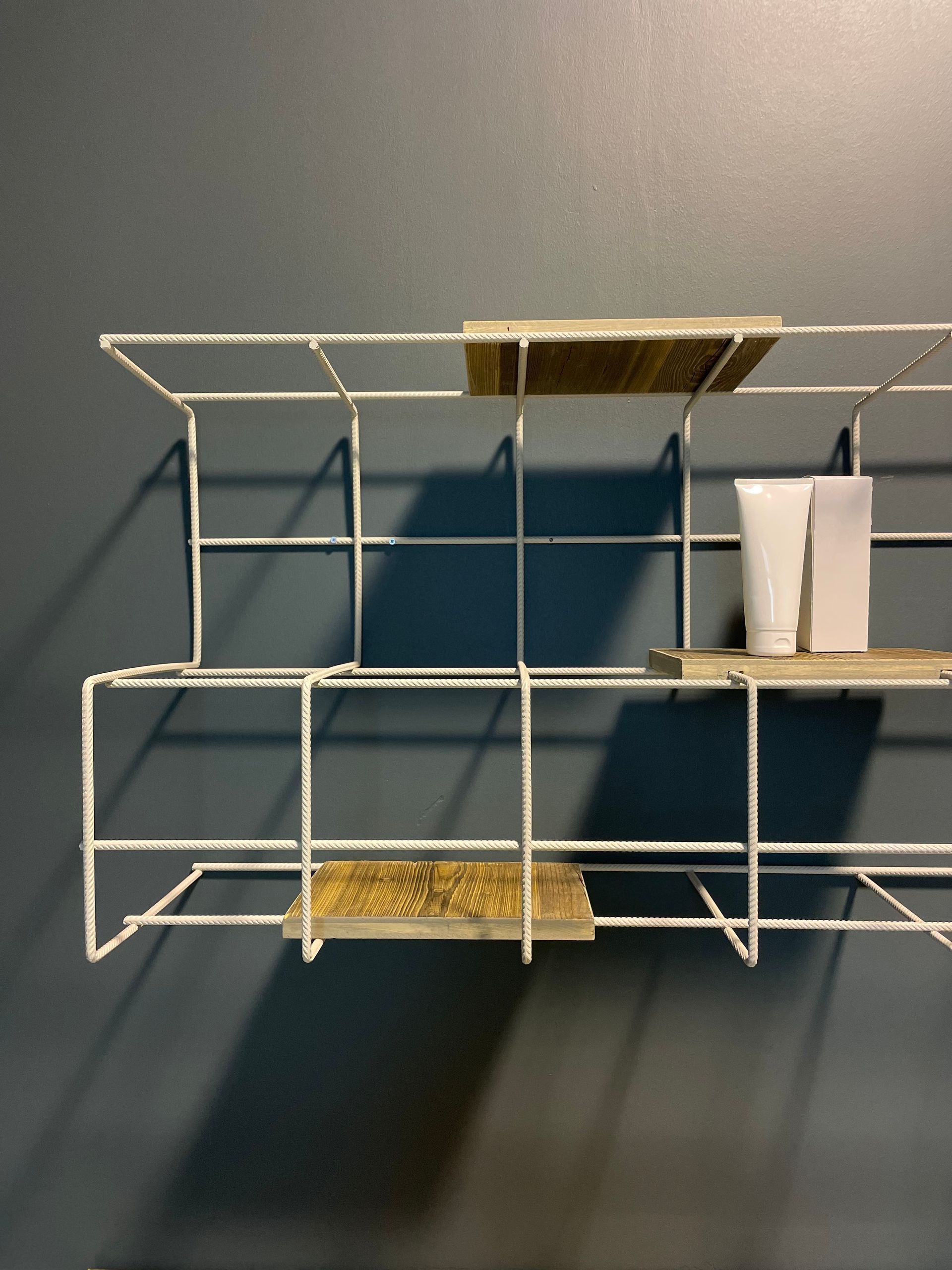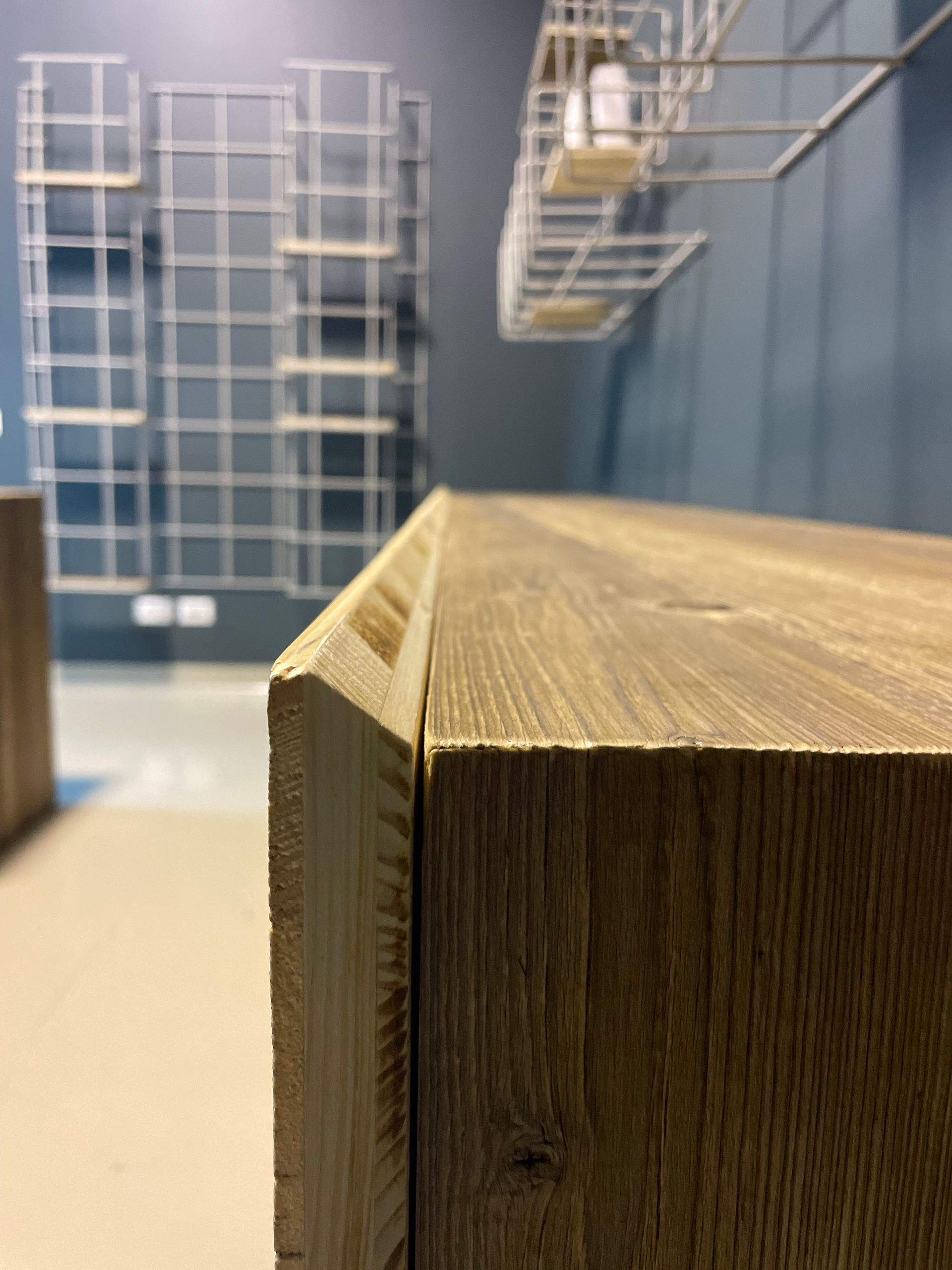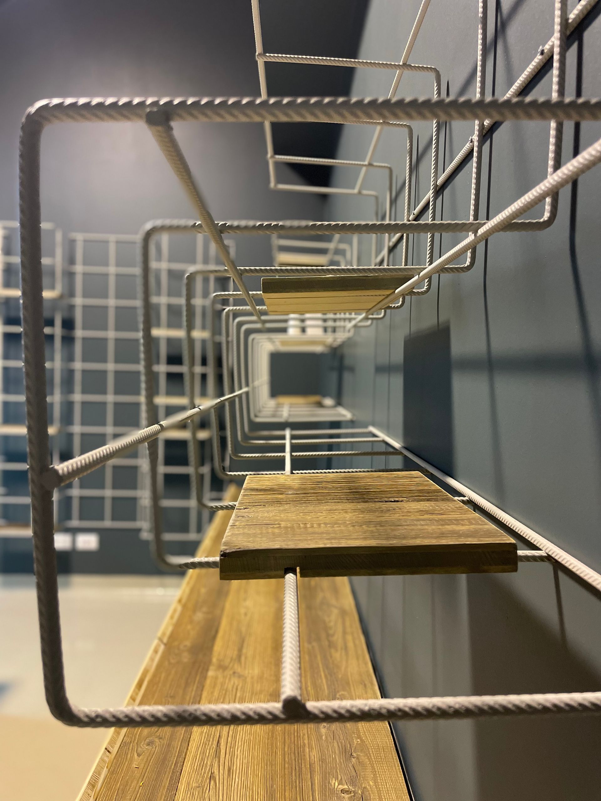 Il progetto prevedeva l'arredo dello spaccio aziendale per una realtà Bresciana. Rete metallica piegata e verniciata, accostata a legno grezzo e cemento... è questo il moodboard scelto.