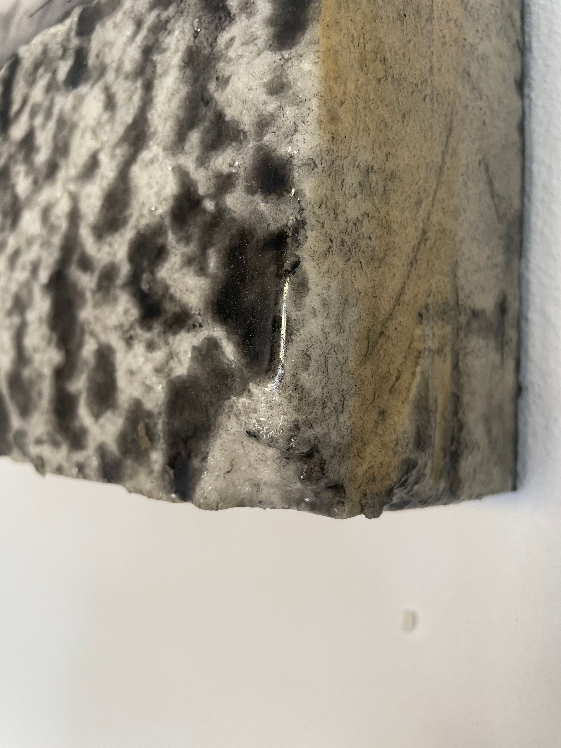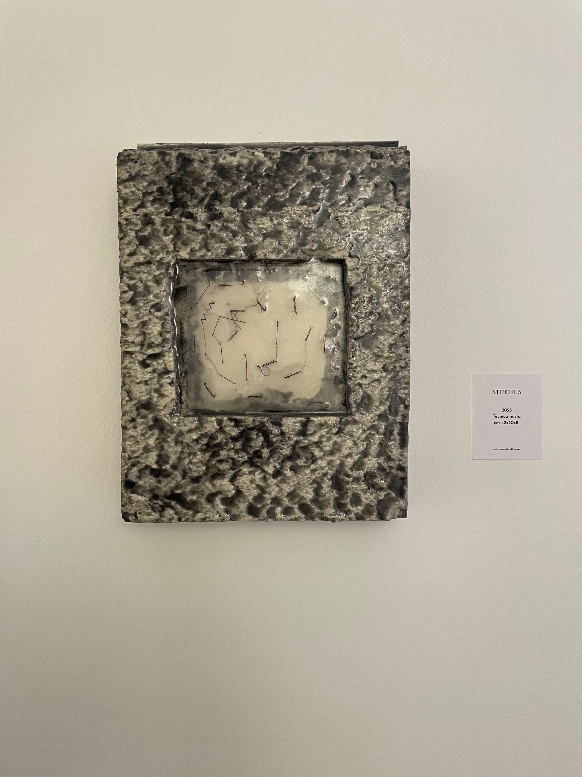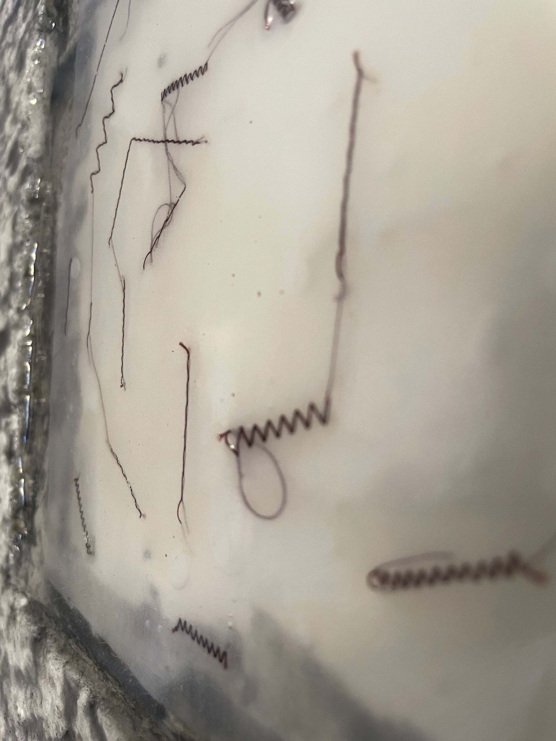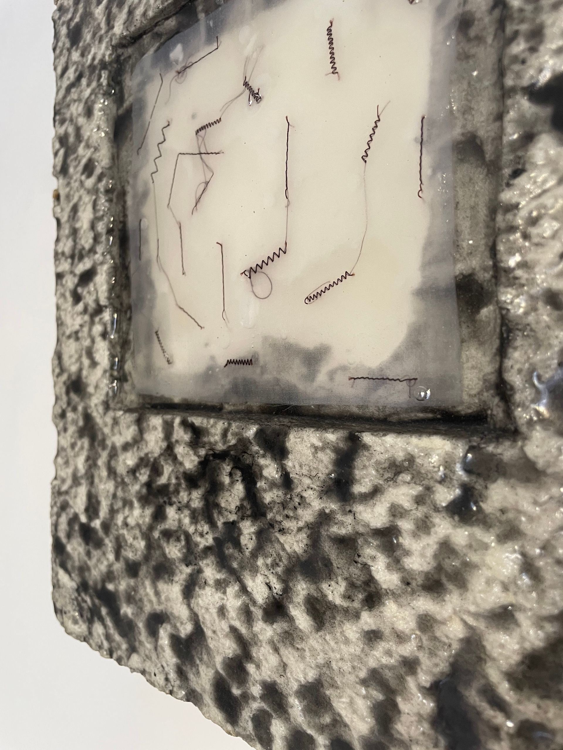 Cuciture su stoffa, una trama inglobata nella resina per durare per sempre. La serie Meetings è caratterizzata da linee che si intrecciano, in questo caso le linee sono tutte distaccate tra loro a simboleggiare le diverse vite di persone che non si incontreranno mai..