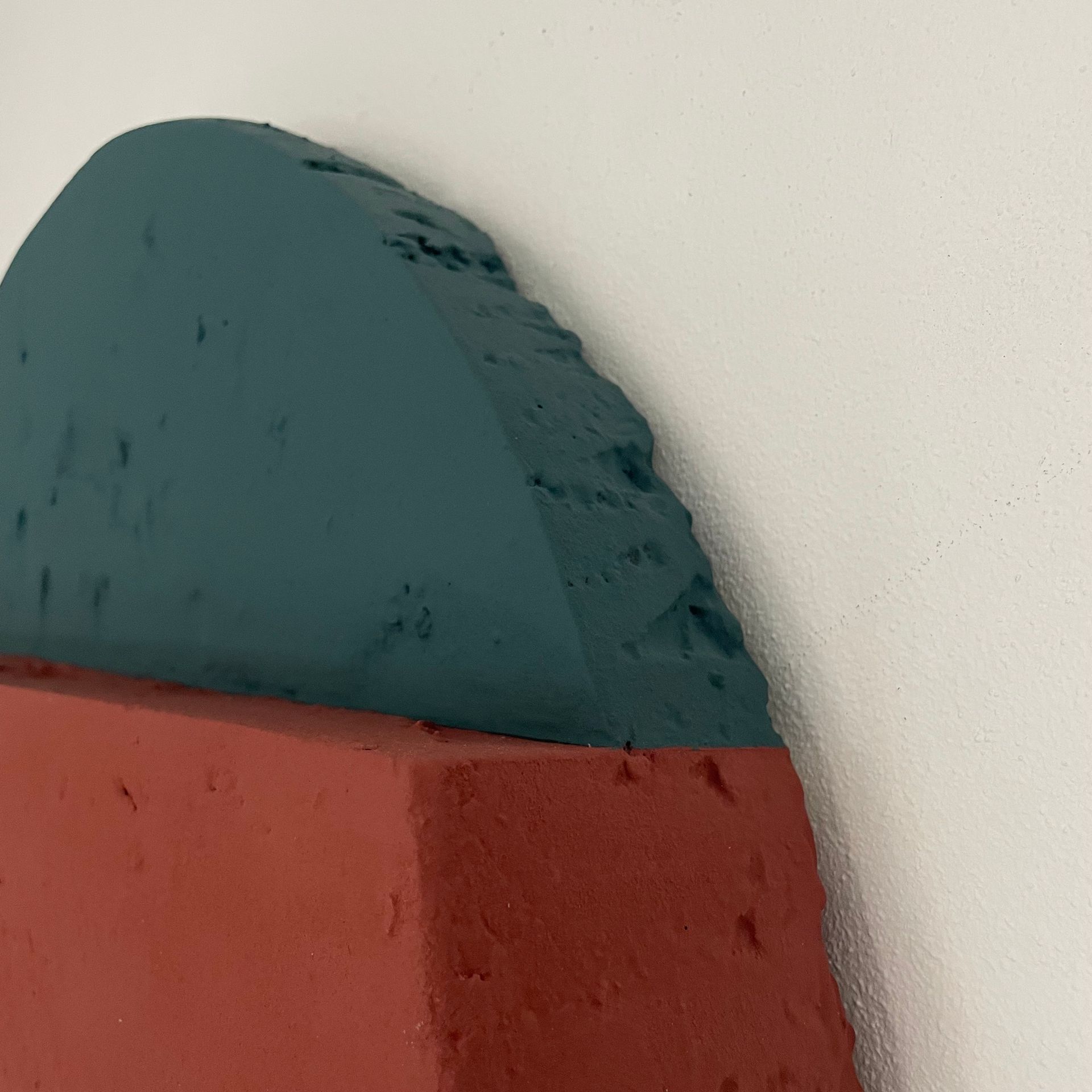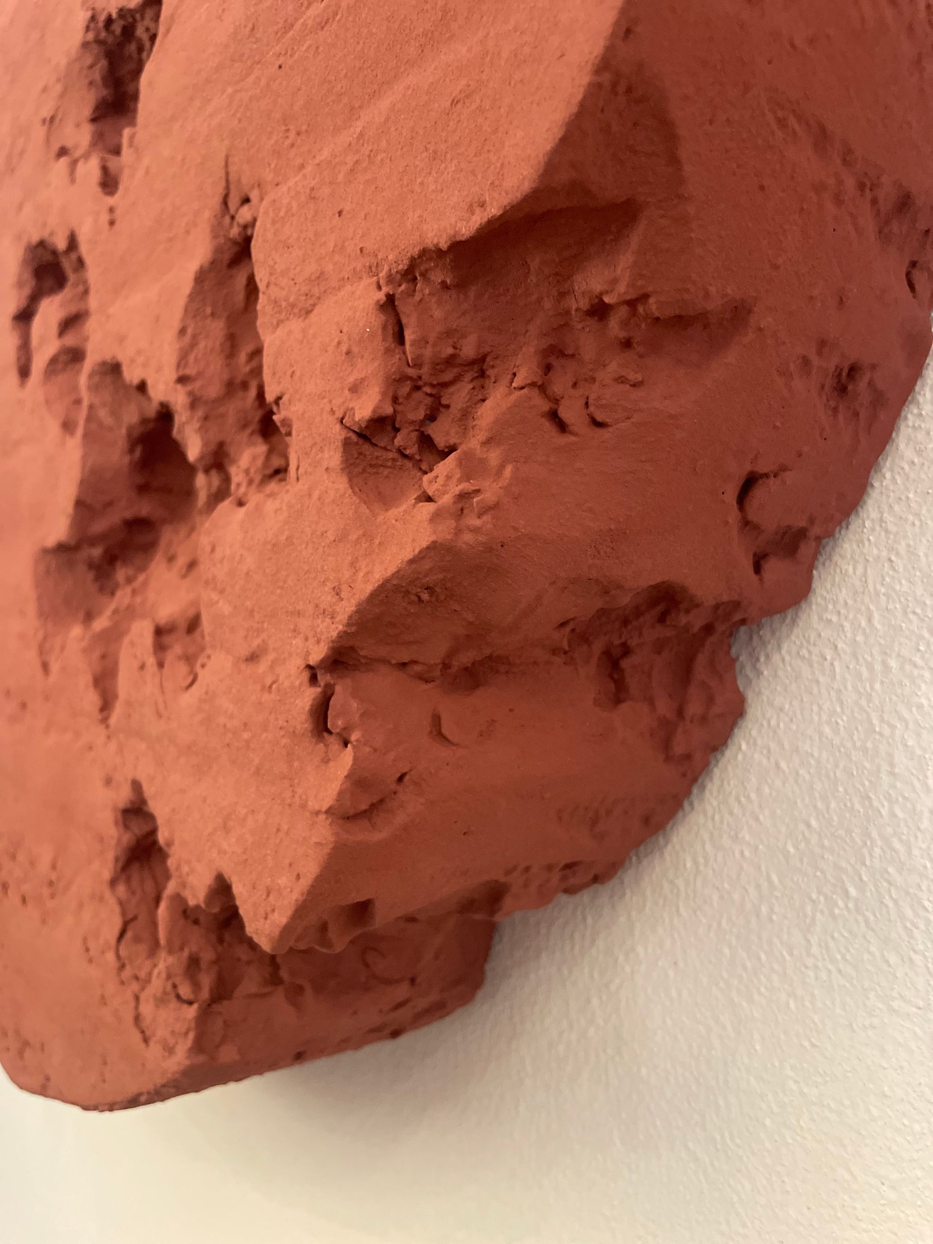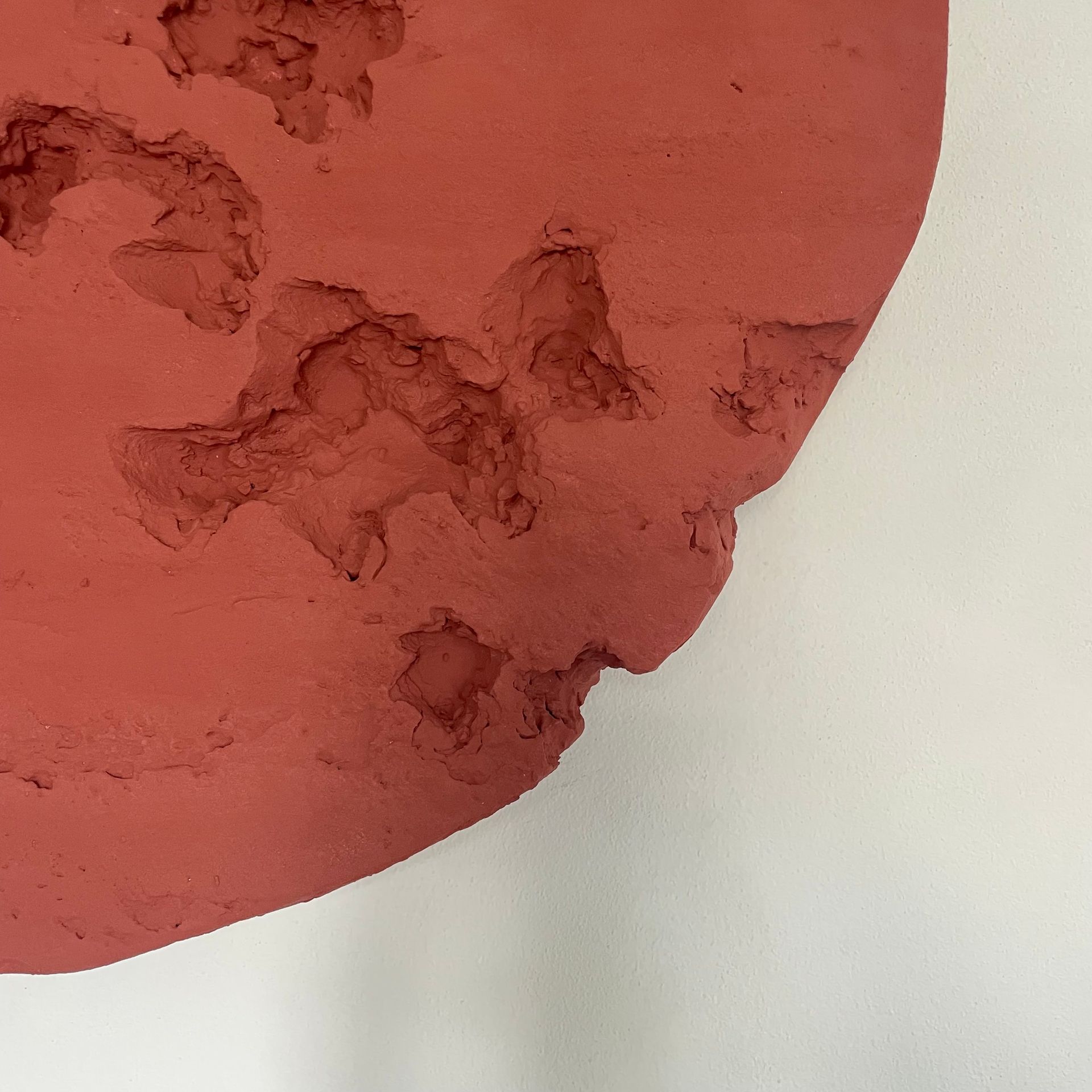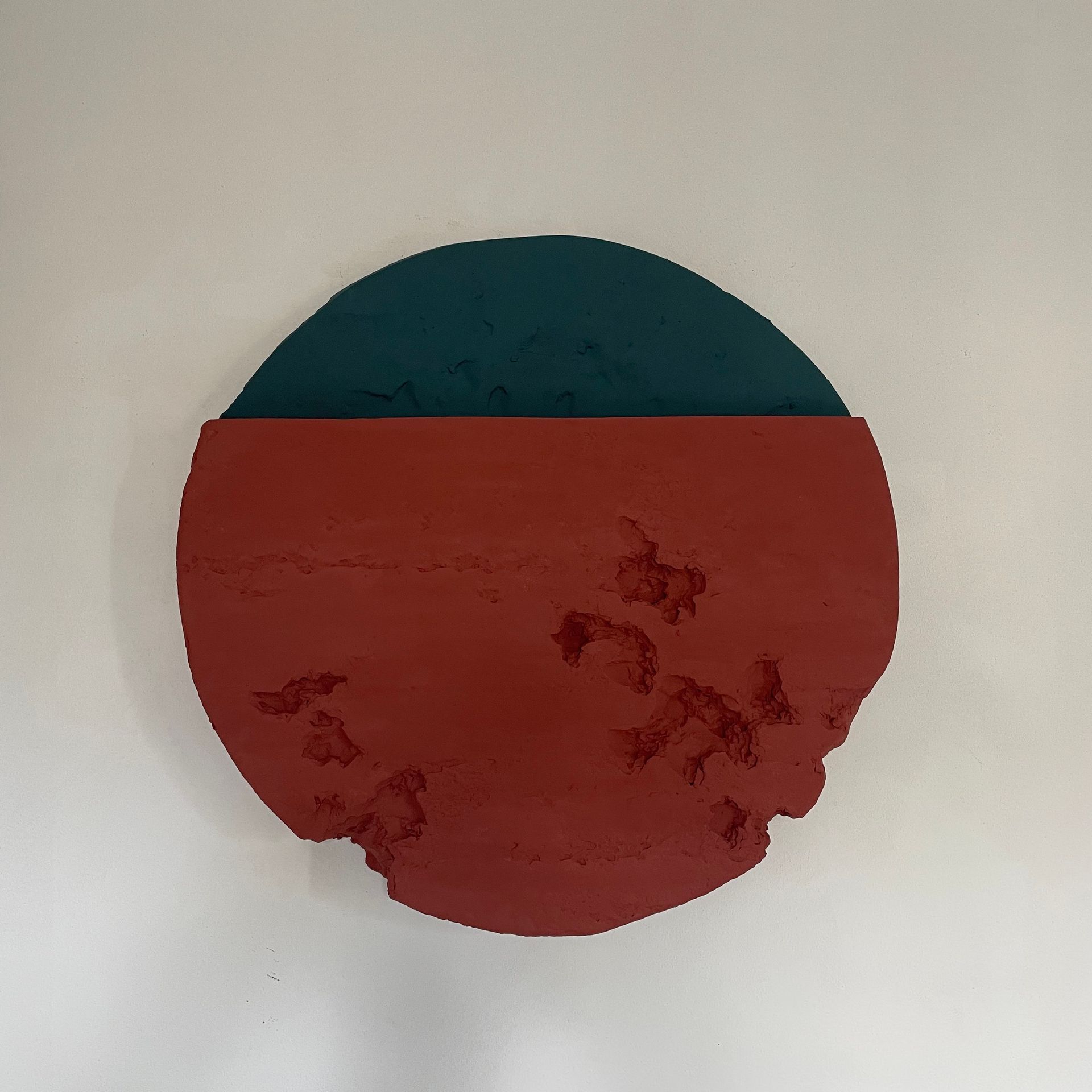 Terracotta e petrolio, accostamento di colori all’avanguardia per questo tondo materico. Le crepe accompagnano dolcemente al cambio di profondità. è il contrasto di colore quì ad essere protagonista, il petrolio e il terracotta si completano perfettamente per un risultato intenso e profondo. La forma del tondo mi ha sempre attirata e quì la ritroviamo con questo netto cambio di profondità. A differenza di altre opere quì la tecnica è in negativo, è stato tolto del materiale per ricavare la parte cava. La sperimentazione di tecniche e materiali è sempre alla base del lavoro.