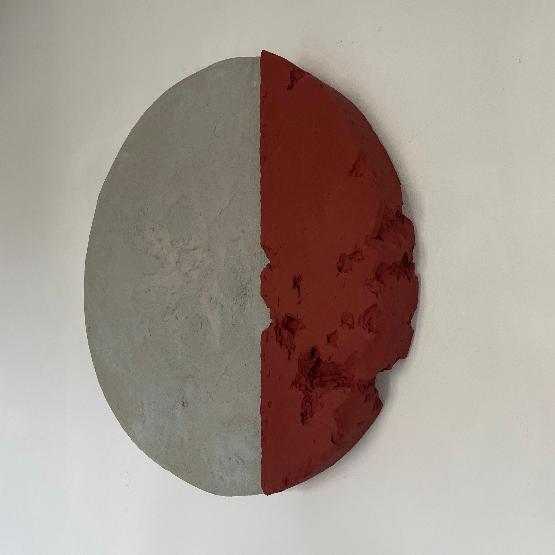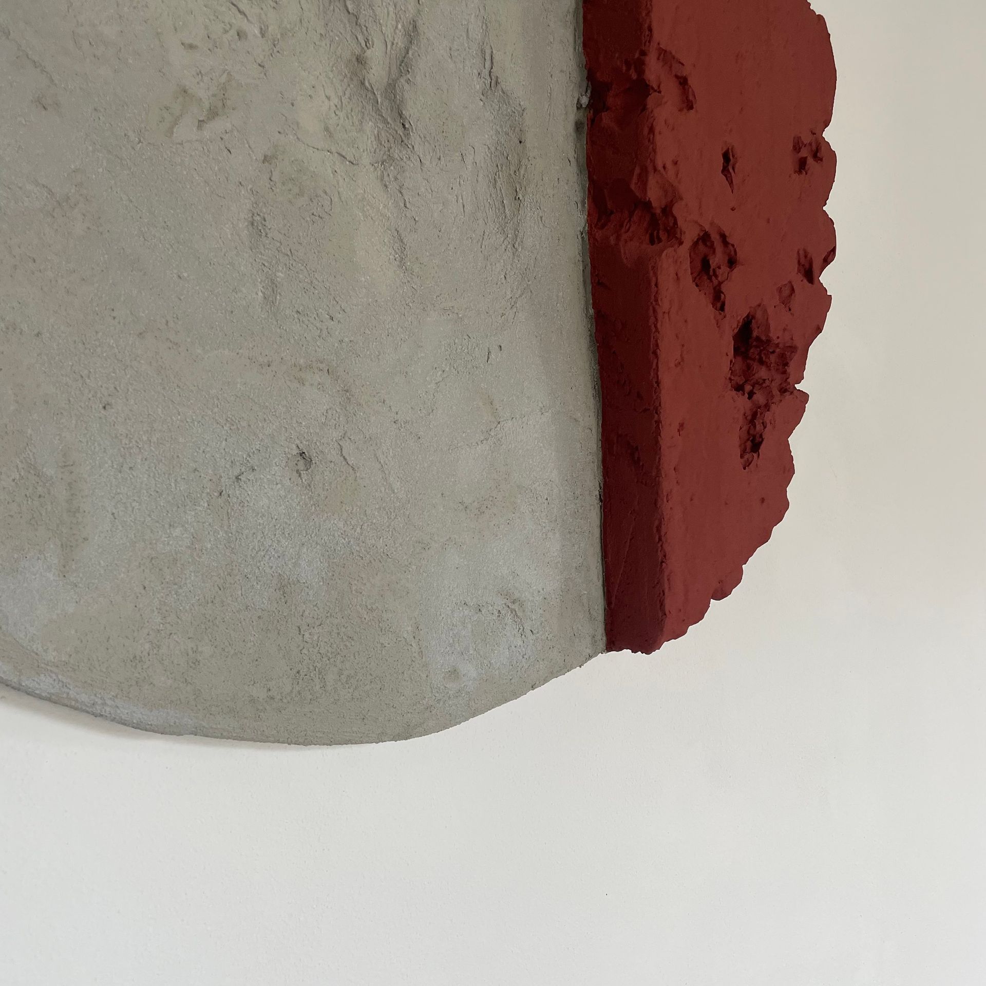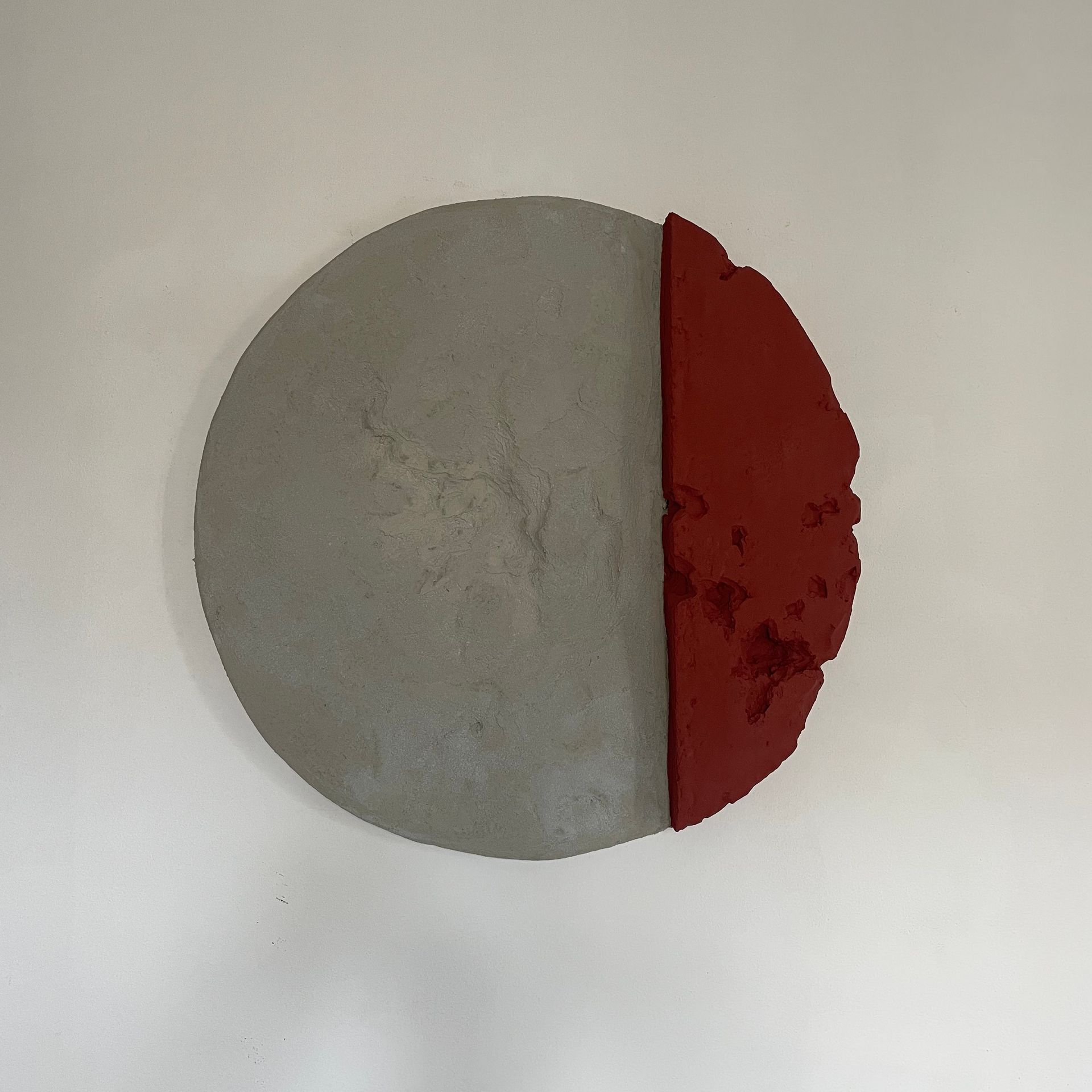 Tondo complementare dell’opera “ Sunrise”. L’accostamento di colori quì è più delicato, ma sempre innovativo. è la parte geometrica più piccola ad avere una maggiore profondità e a spiccare per le crepe e il tono di terracotta. La parte in cemento invece collassa creando una conca quasi al centro dell’opera.