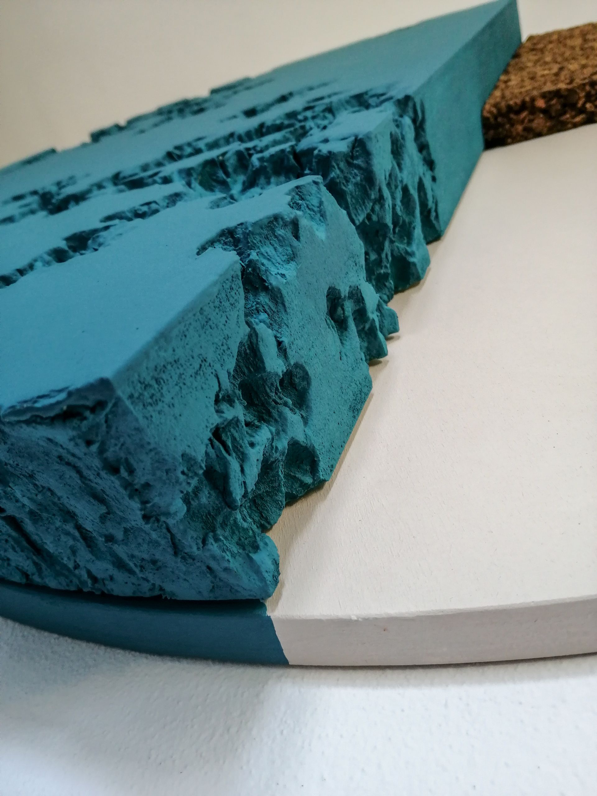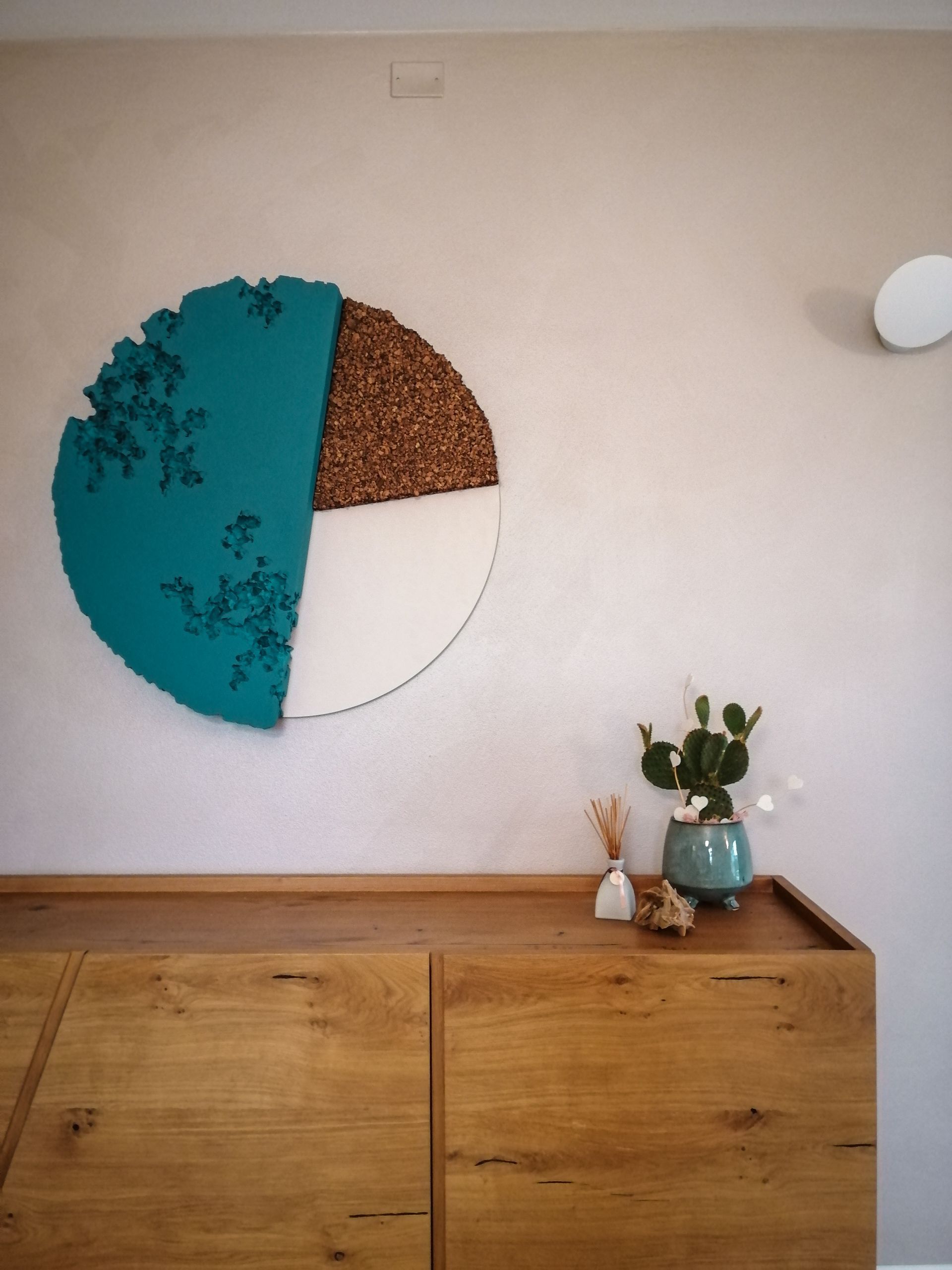 Ecco che su questa parete il tondo richiama l'attenzione ed ha tutto lo spazio necessario per "respirare". Per lei ho scelto un moodboard dal sapore delicato.. sughero, azzurro e burro.