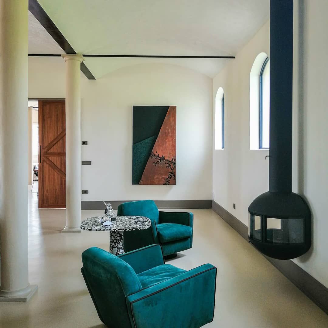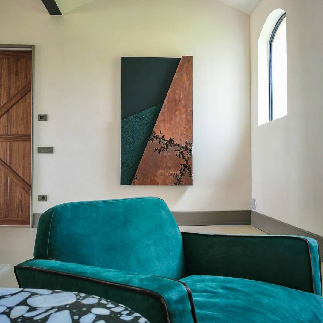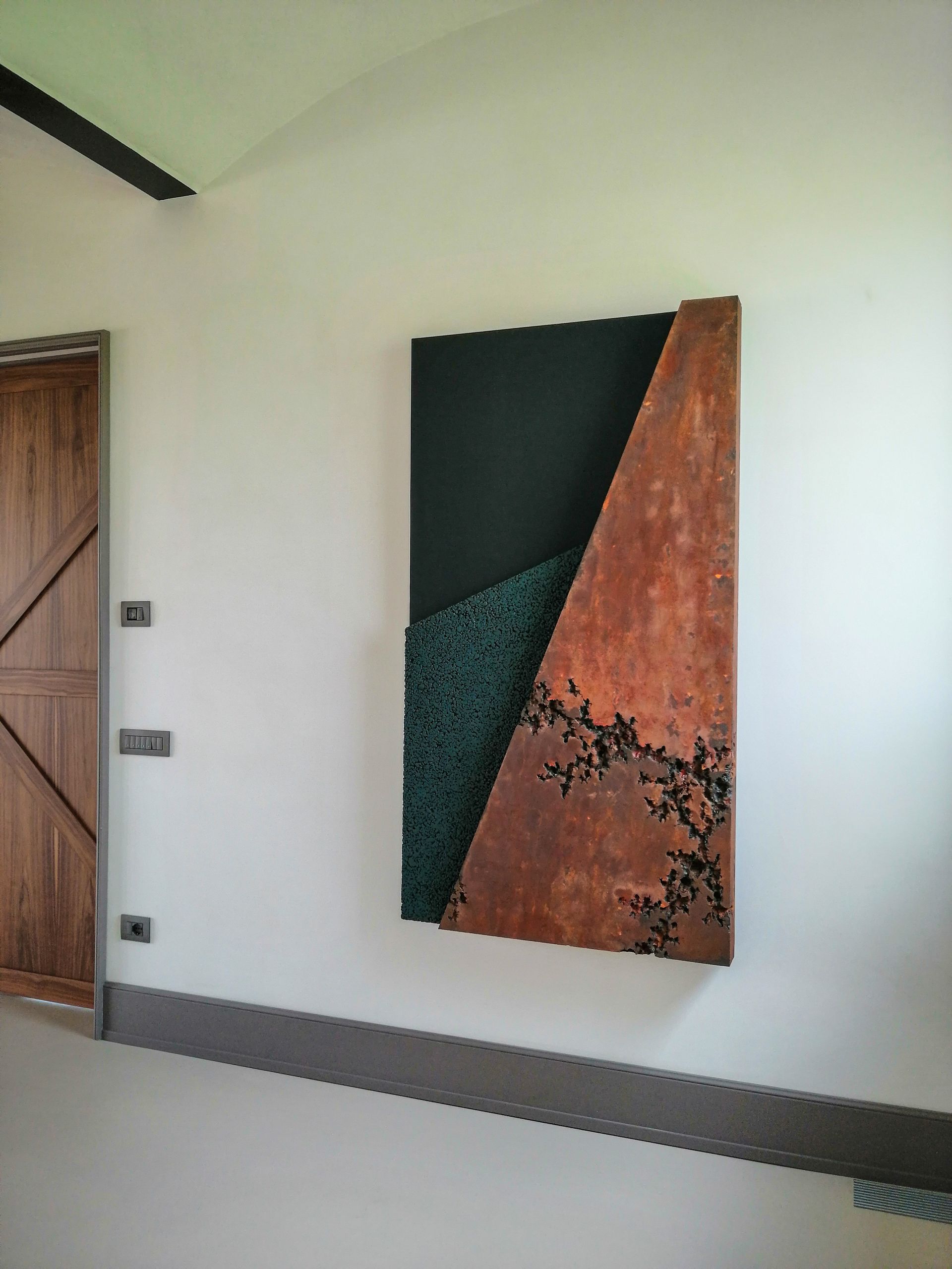 Eccola sul fondo di questa cucina meravigliosa. La sua rigida geometria, la materici tè e le sfumature ruggine si sposano perfettamente con lo stile della casa, un antico cascinale ristrutturato nella campagna emiliana. L'opera è cromaticamente collegata alla zona relax, al colore delle sedute di Baxter ed al fuoco sospeso.