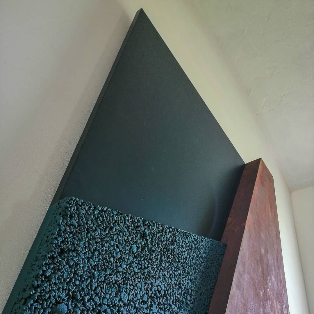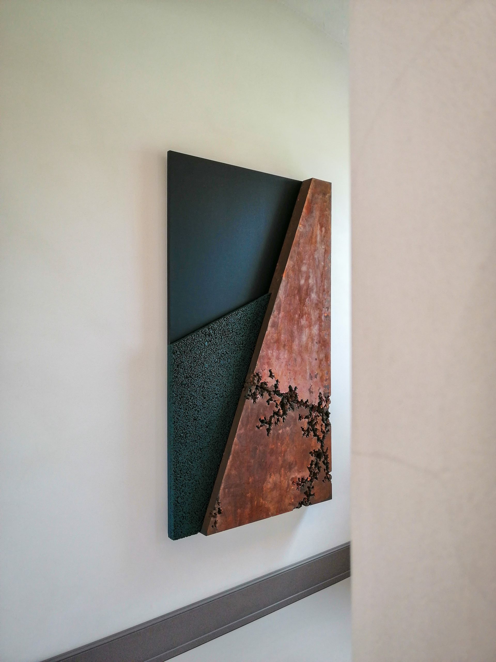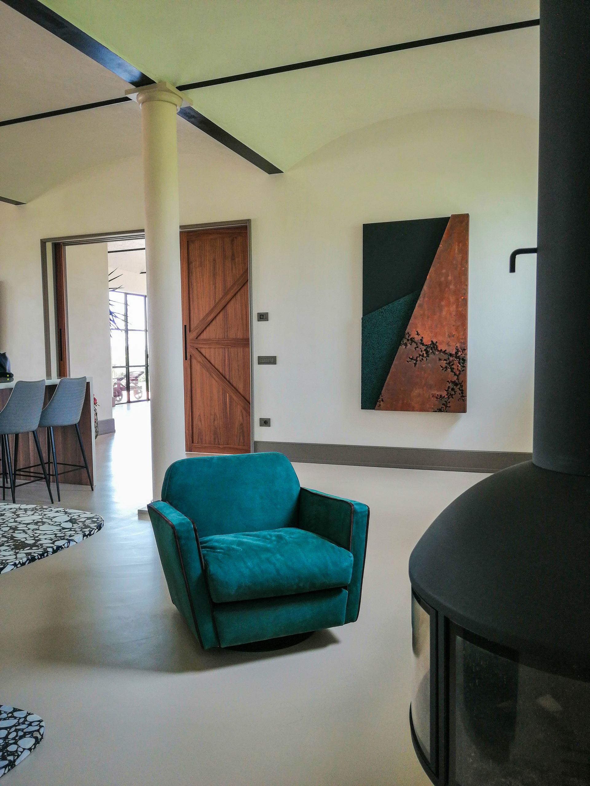 Eccola sul fondo di questa cucina meravigliosa. La sua rigida geometria, la materici tè e le sfumature ruggine si sposano perfettamente con lo stile della casa, un antico cascinale ristrutturato nella campagna emiliana. L'opera è cromaticamente collegata alla zona relax, al colore delle sedute di Baxter ed al fuoco sospeso.
