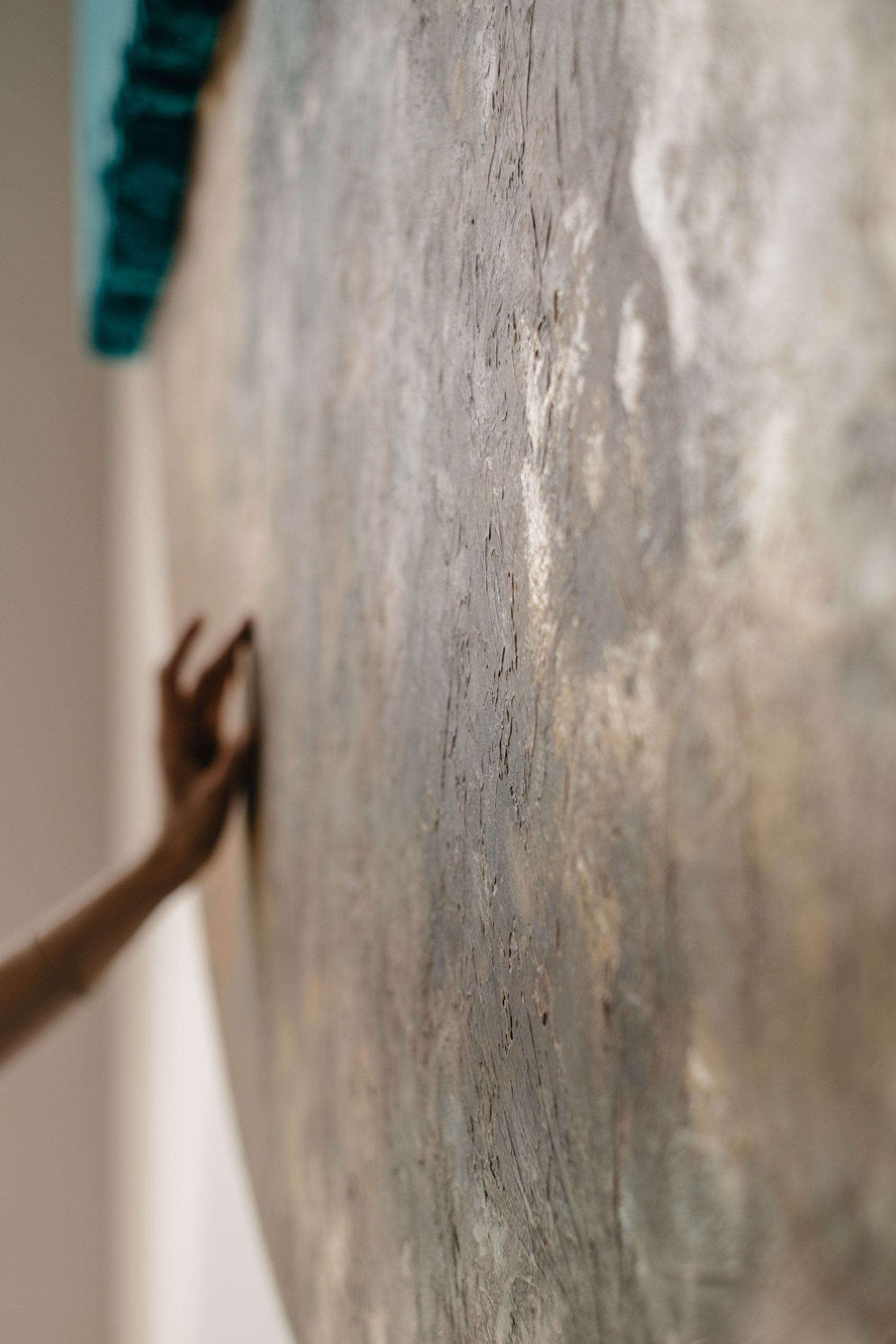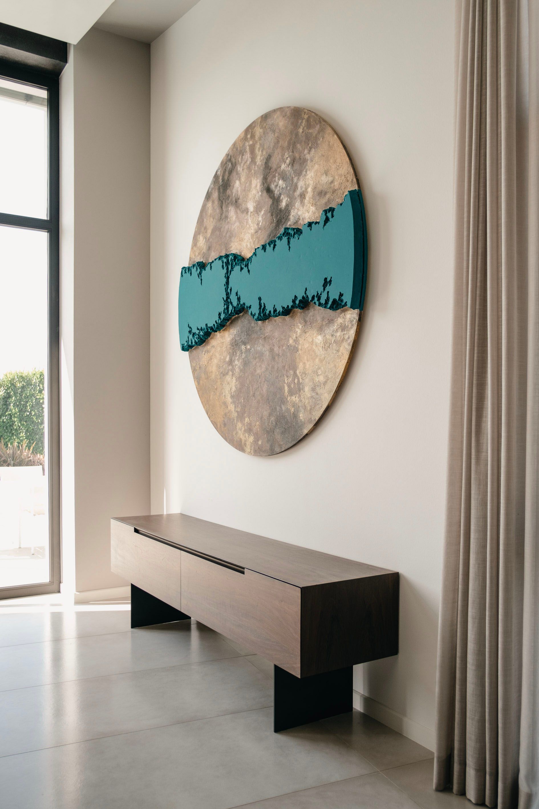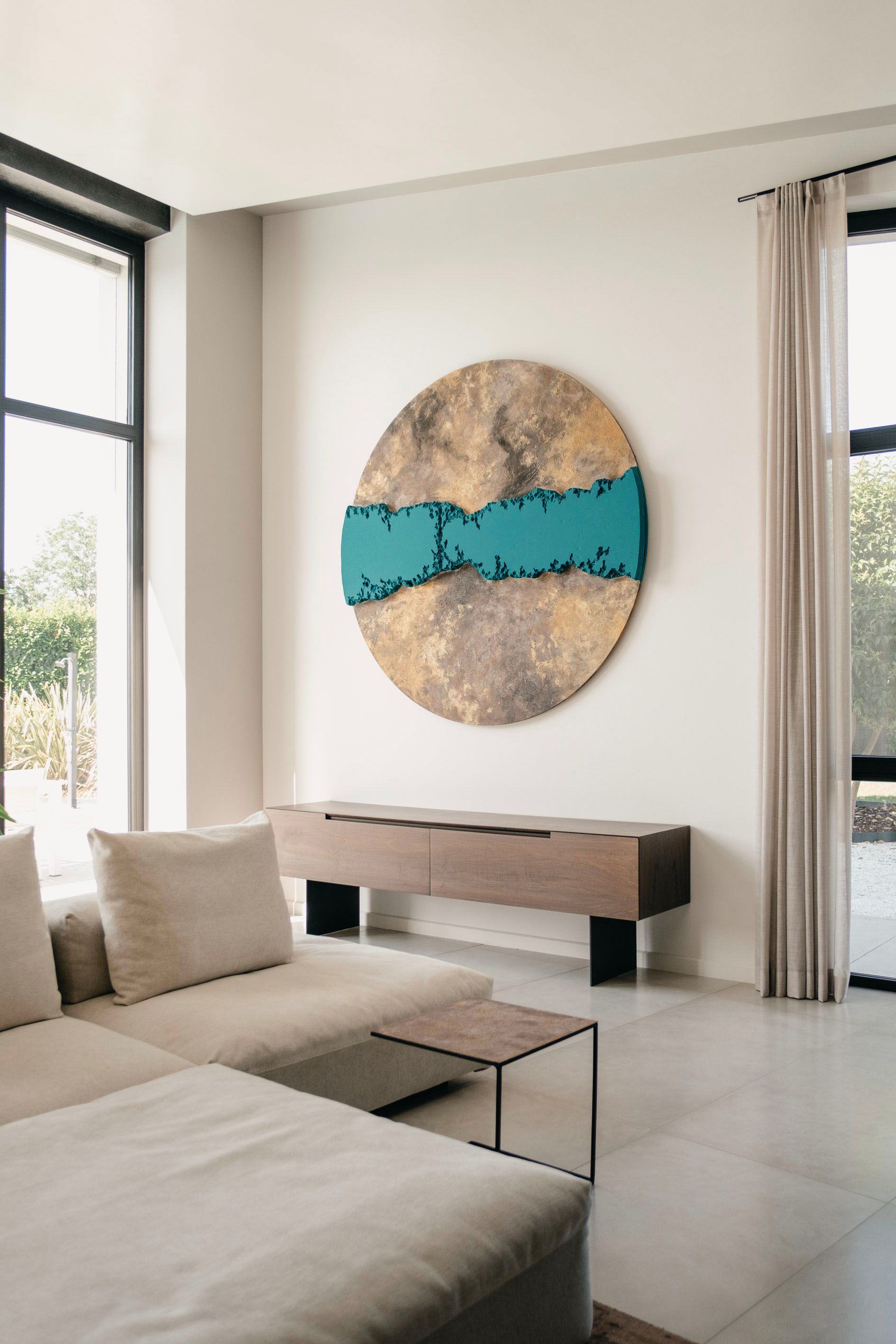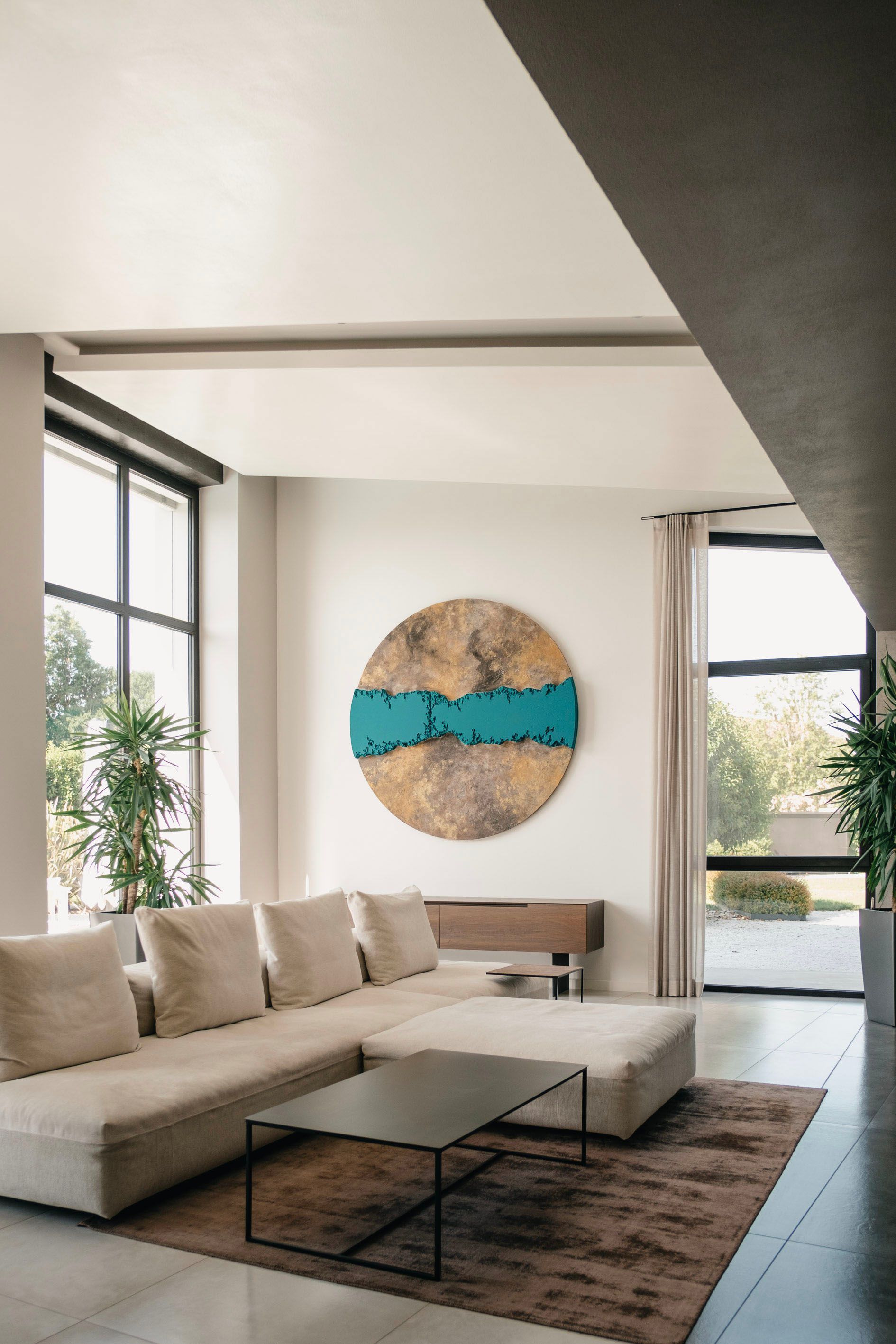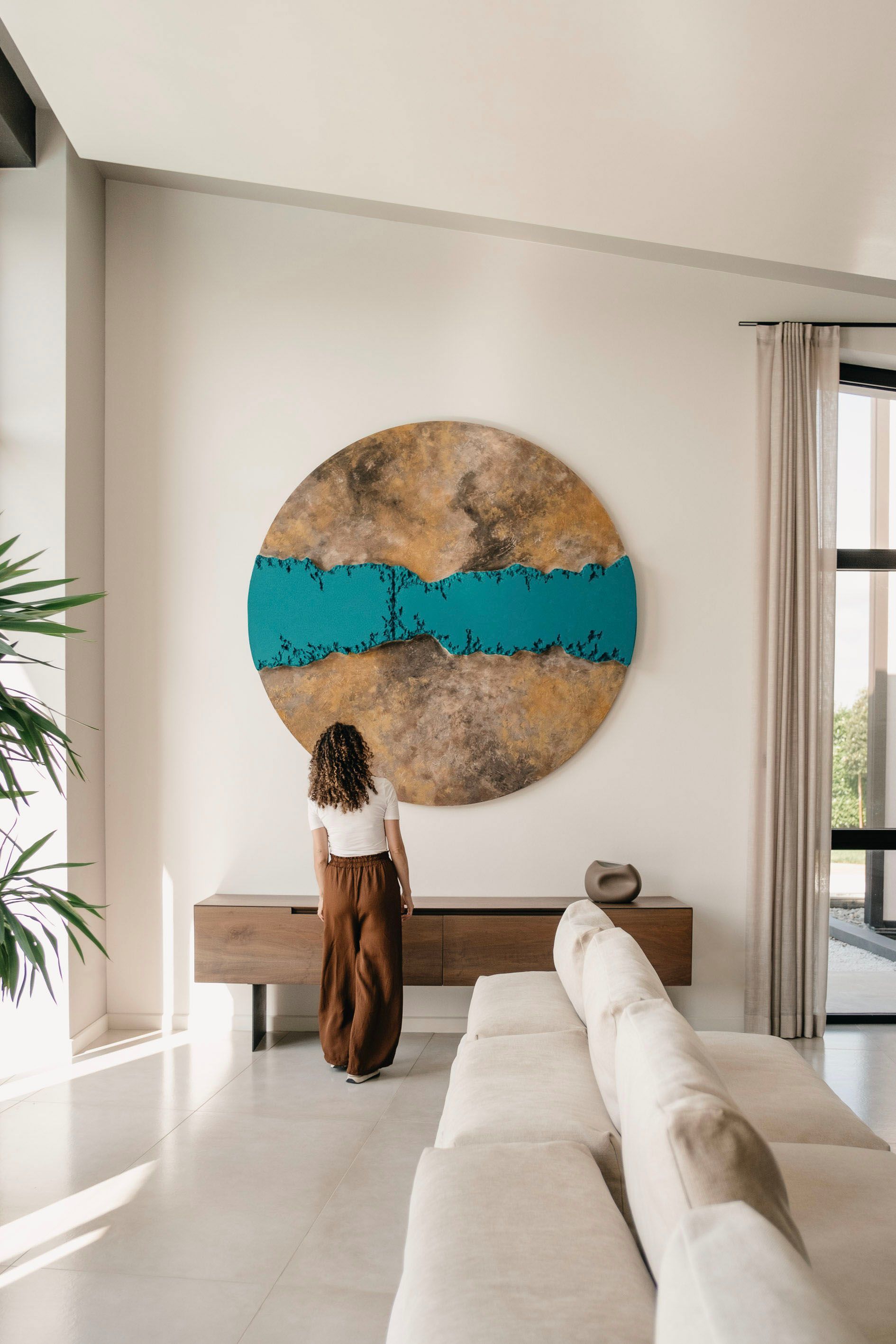 Un tondo di due metri che stravolge completamente le geometrie di questa casa, con fondo materico e sfumature bronzo e oro.