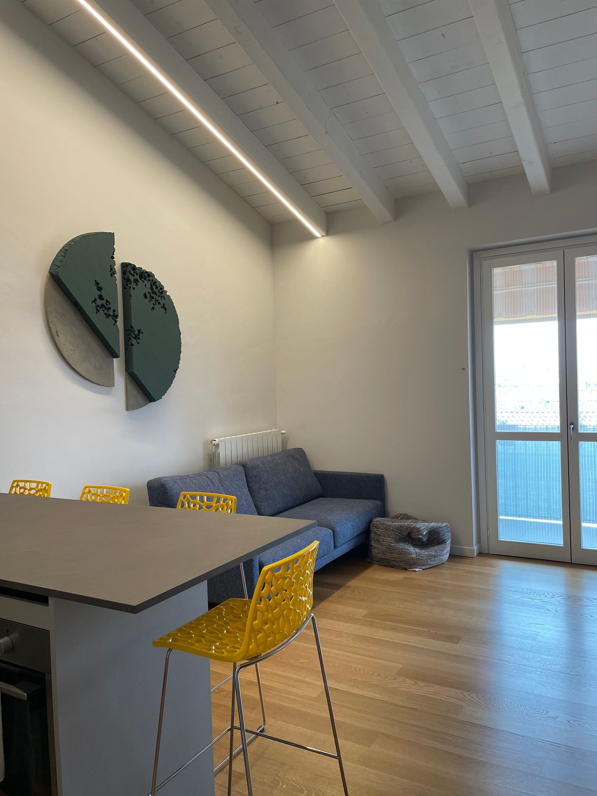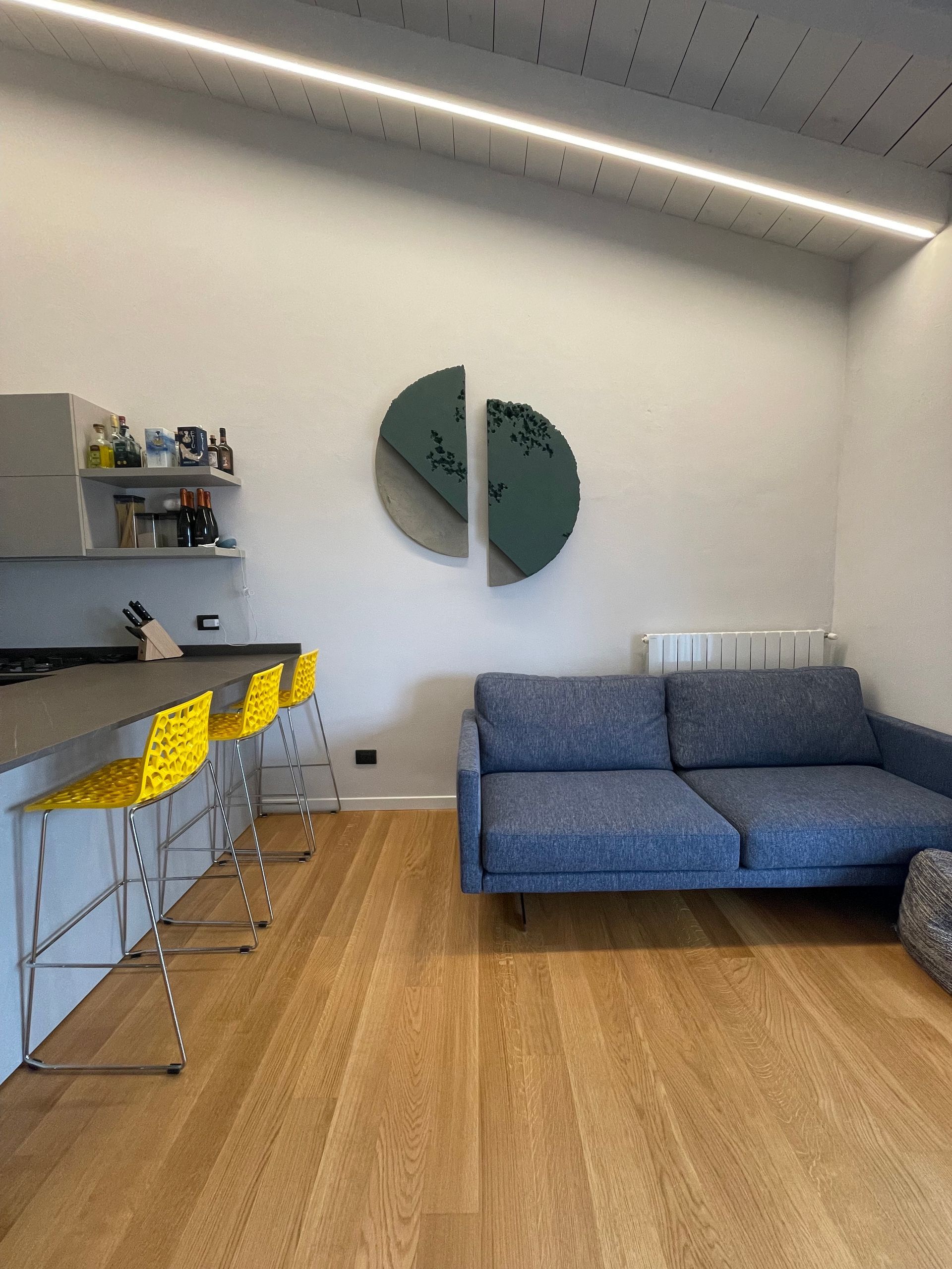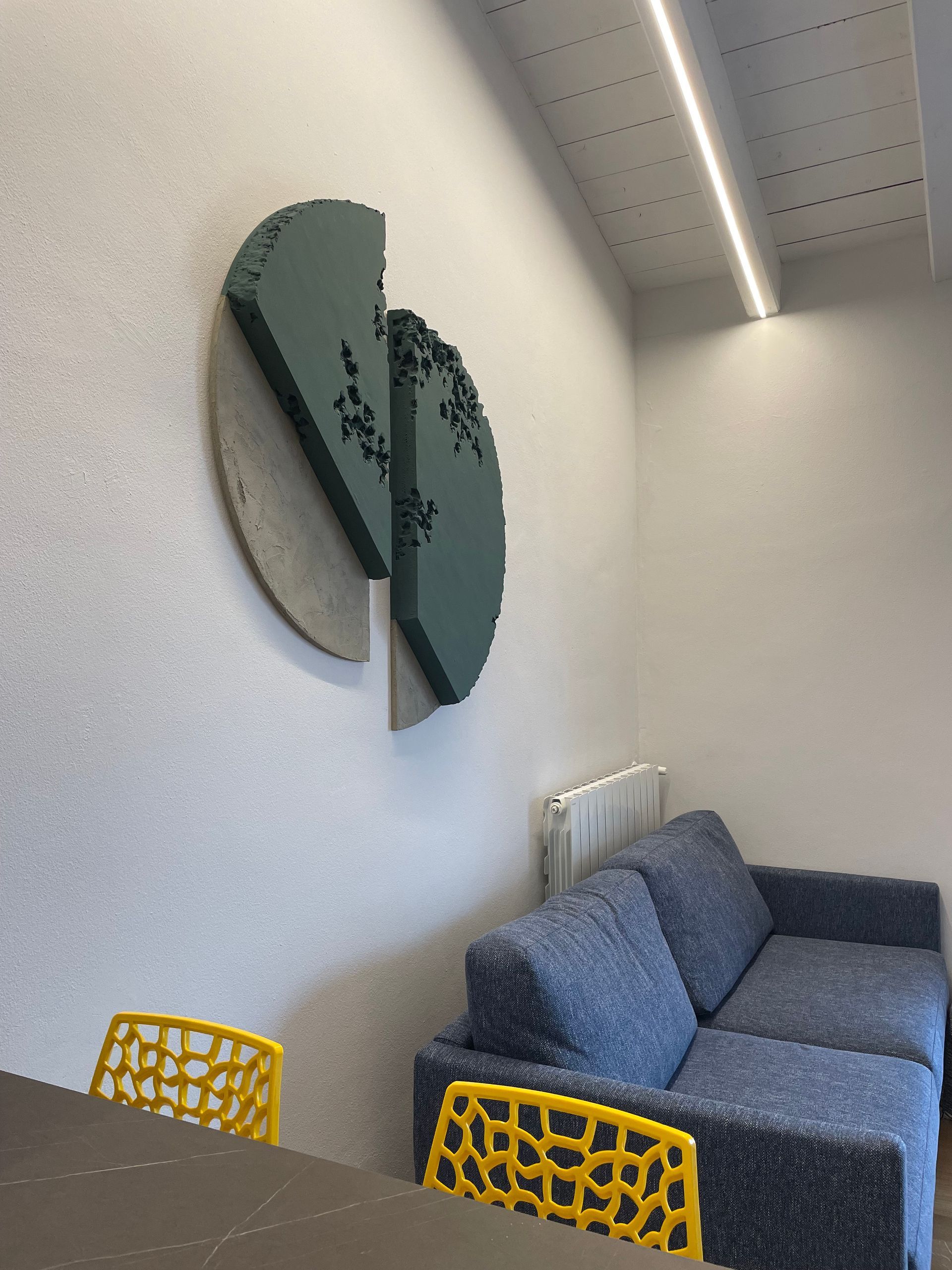 Nell'entrare per la prima volta in questa casa già immaginavo quest'opera. Quante volte ci limitiamo, quante volte non crediamo nelle nostre possibilità! Possiamo davvero arrivare in alto se crediamo in noi stessi, proprio come arriva in alto questo tondo. La sua energia è talmente forte che prende il volo e si spinge oltre!