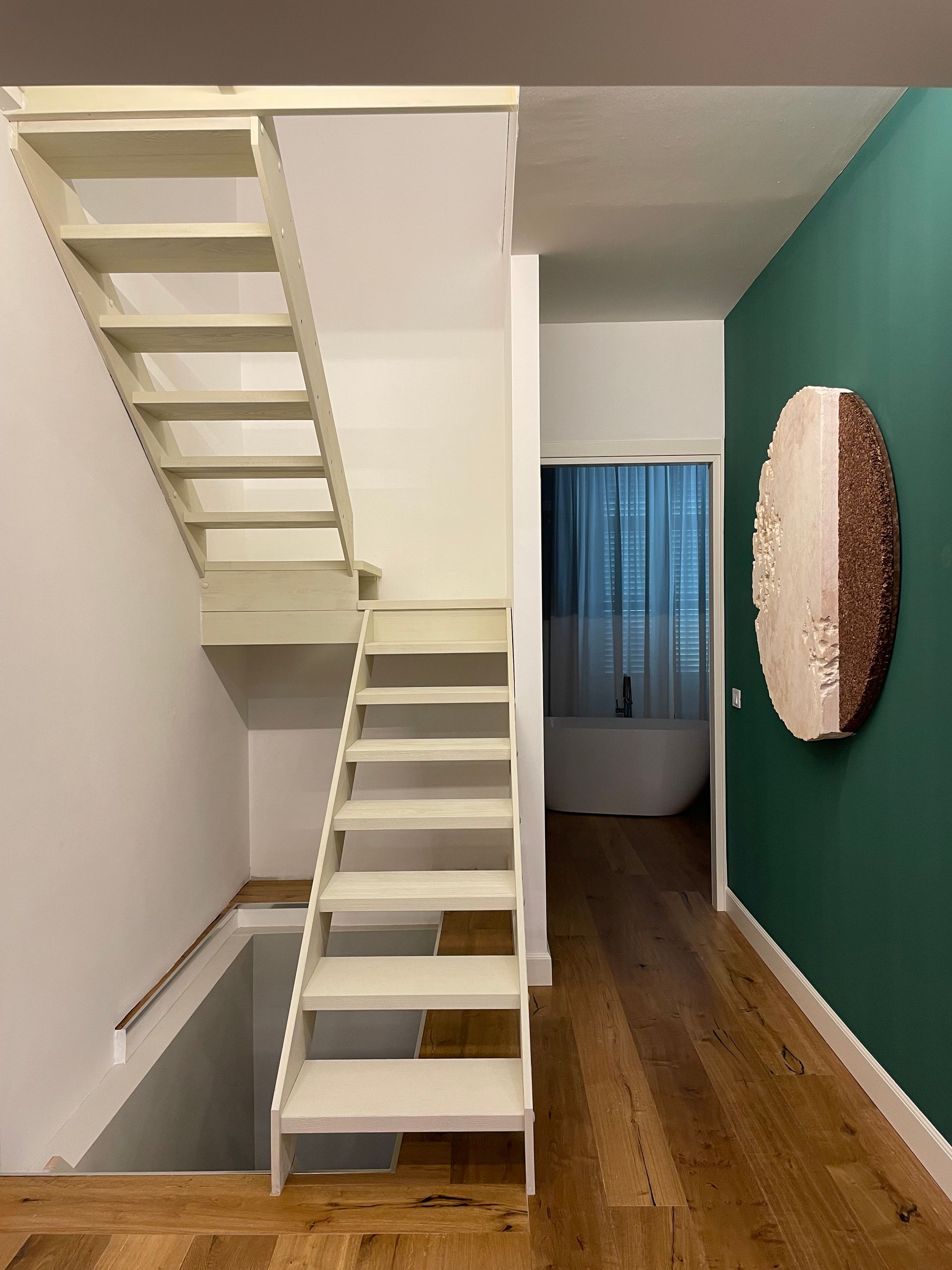 Un super tondo per questa nuova ristrutturazione. Questa casa del centro storico di Brescia ora ha un piano in più e ad accogliervi è proprio Lei. I suoi colori tenui e delicati trovano contrasto con la parete verde foresta... è cosi che nasce l'ingresso di questa grande zona notte!