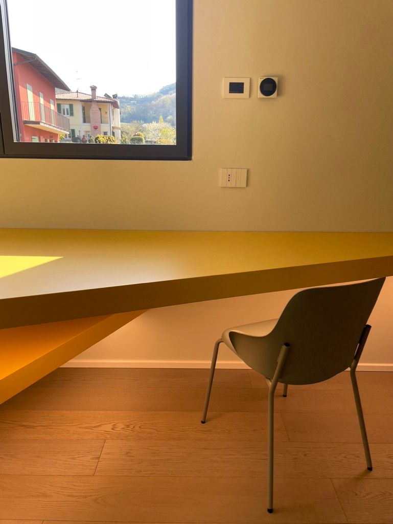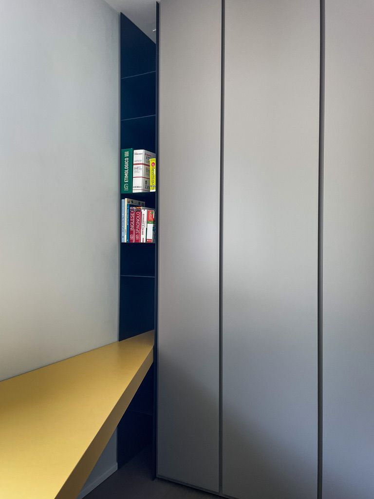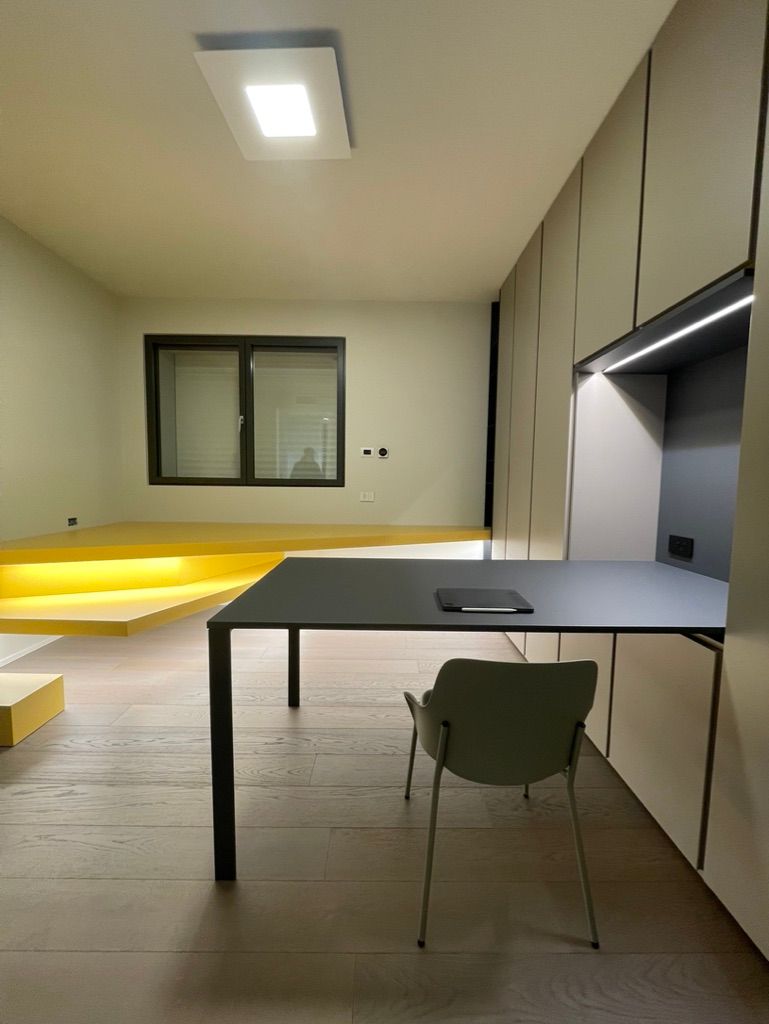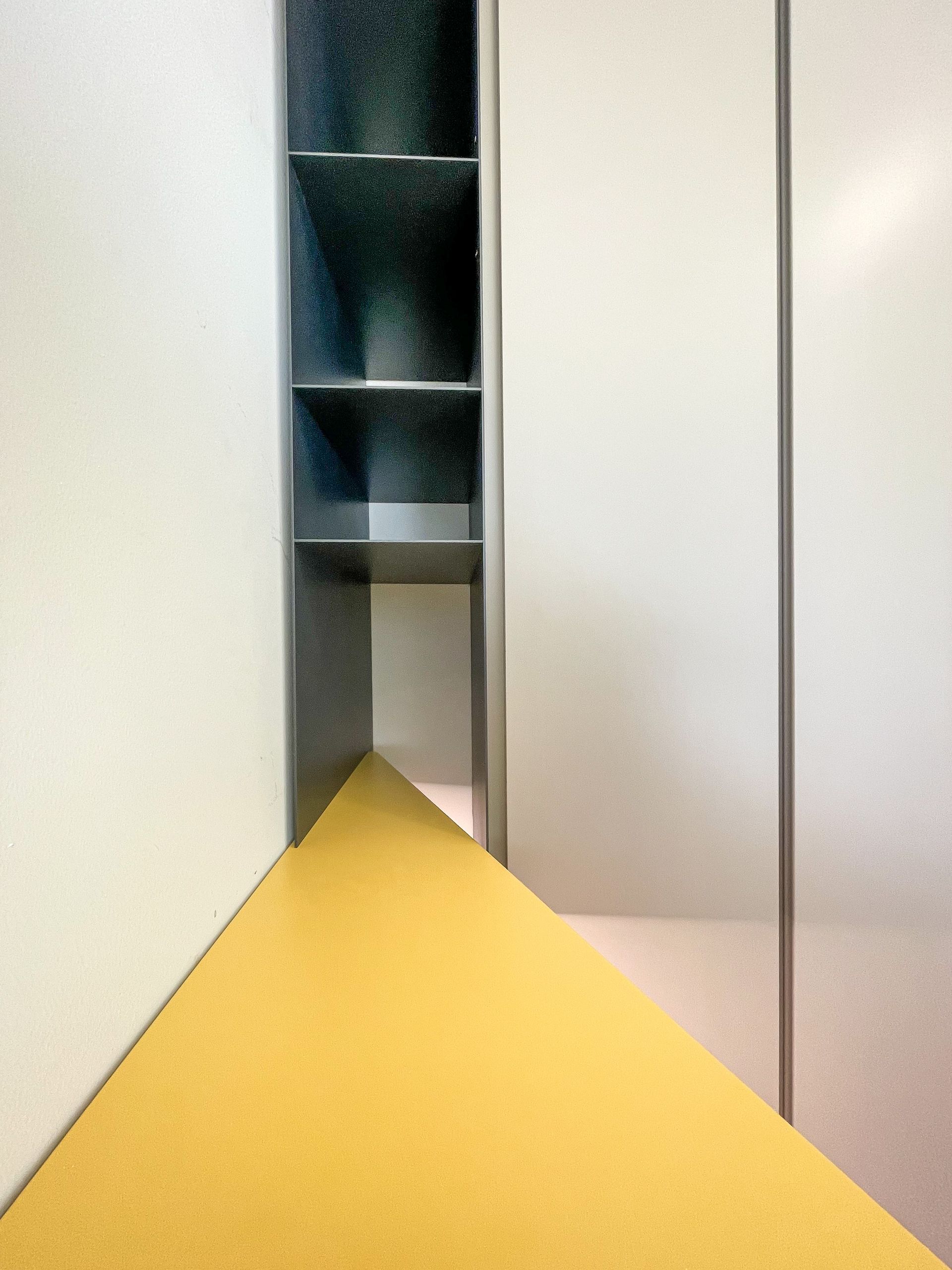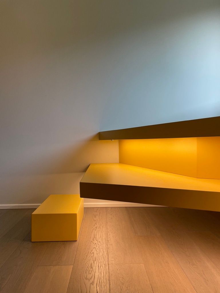 L'angolo giallo ha diverse funzioni, zona relax, scrivania, libreria, scala, seduta per pianola.. Diventa protagonista della stanza. Il dettaglio della sua forma che si interseca con la struttura in ferro della libreria non passa inosservato. Luci led che illuminano l'angolo principale e la scrivania per creare un'atmosfera calda ed accogliente!