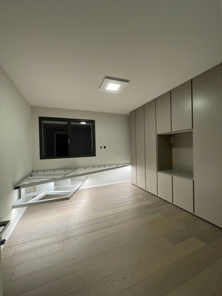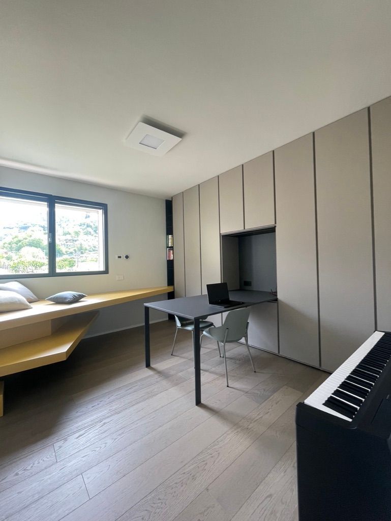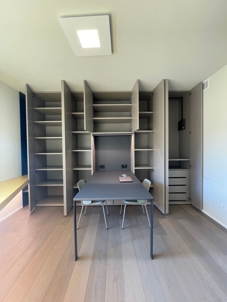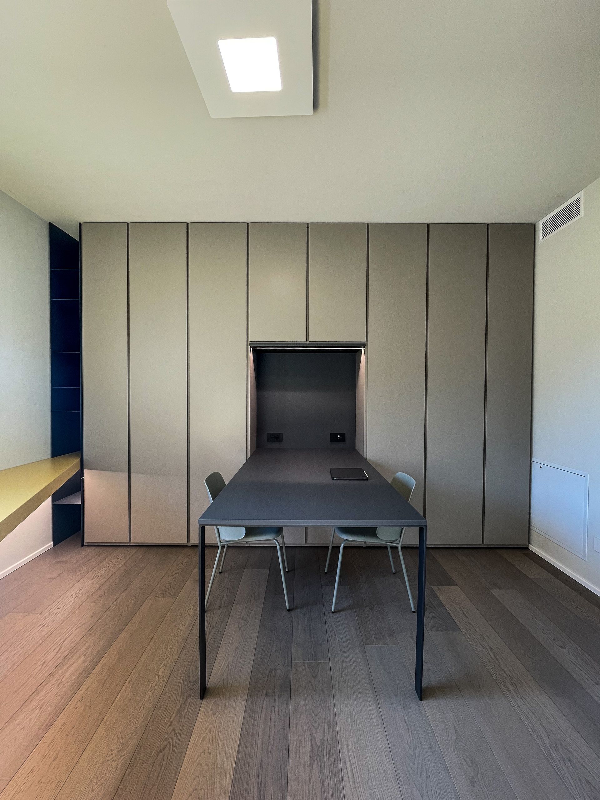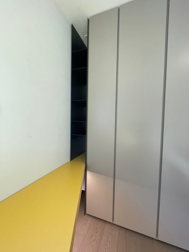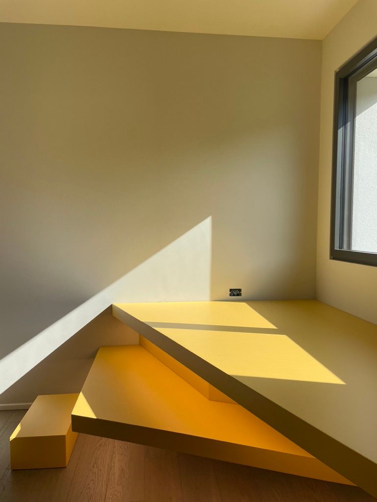L'angolo giallo ha diverse funzioni, zona relax, scrivania, libreria, scala, seduta per pianola.. Diventa protagonista della stanza. Il dettaglio della sua forma che si interseca con la struttura in ferro della libreria non passa inosservato. Luci led che illuminano l'angolo principale e la scrivania per creare un'atmosfera calda ed accogliente!