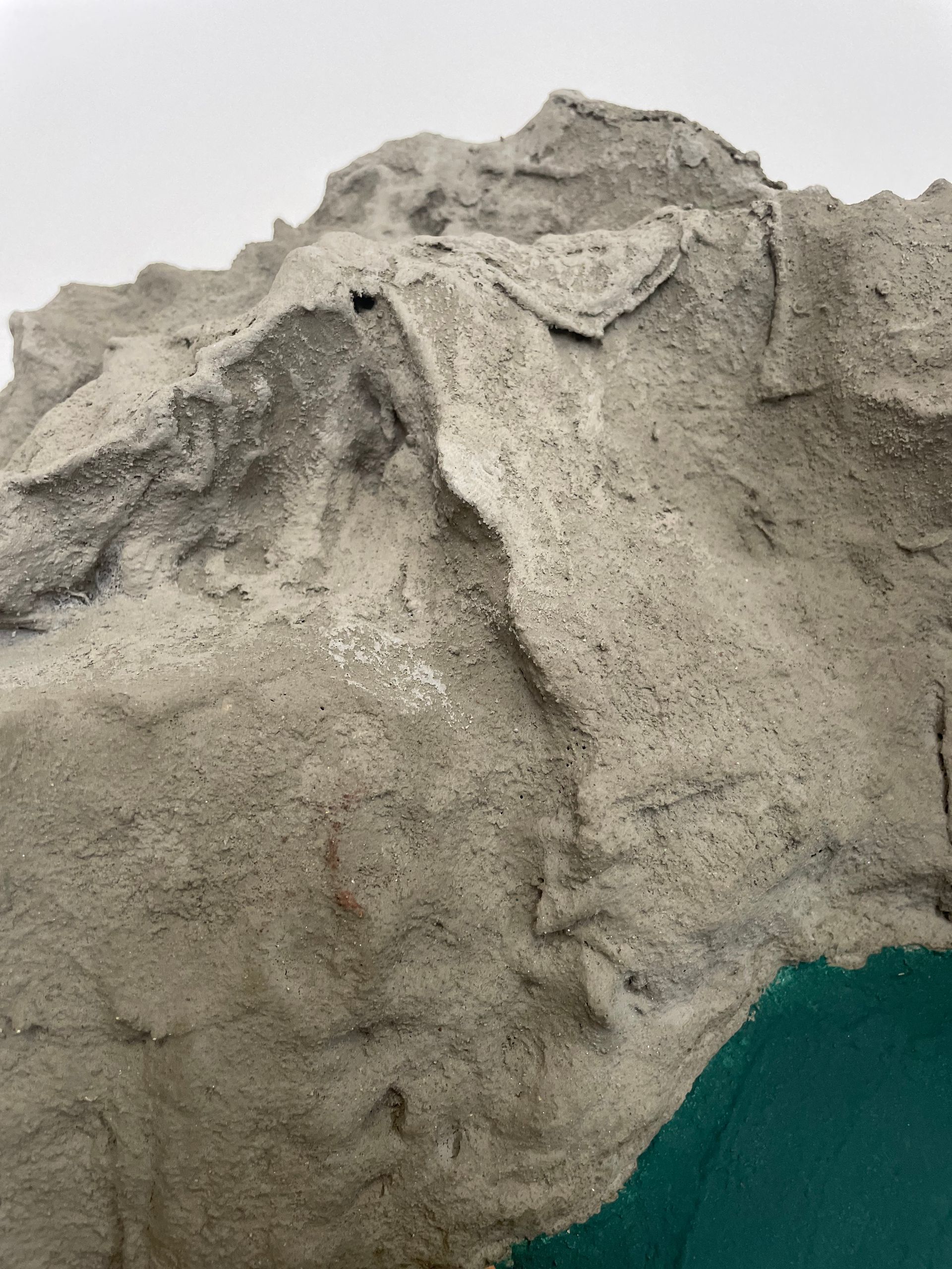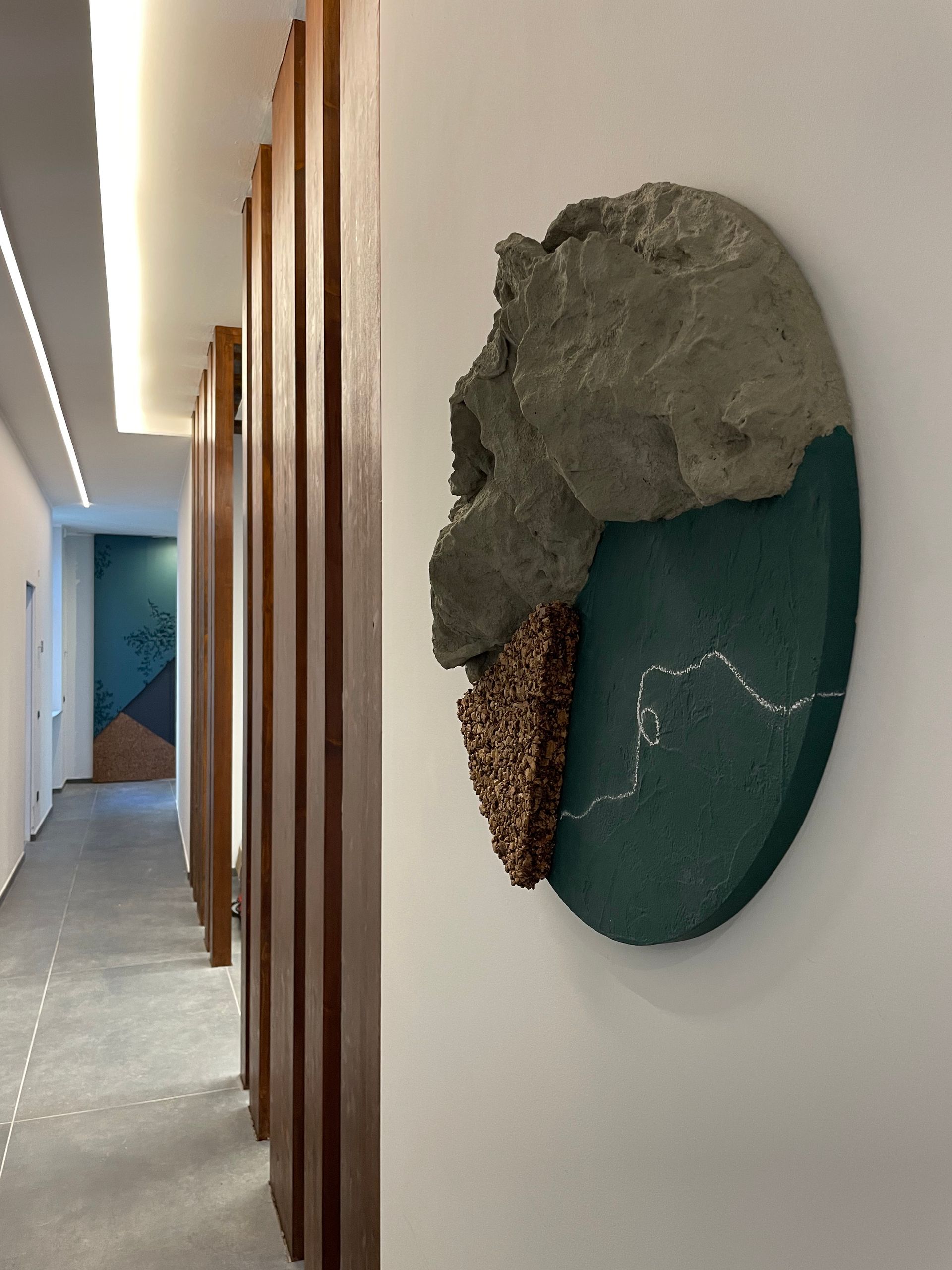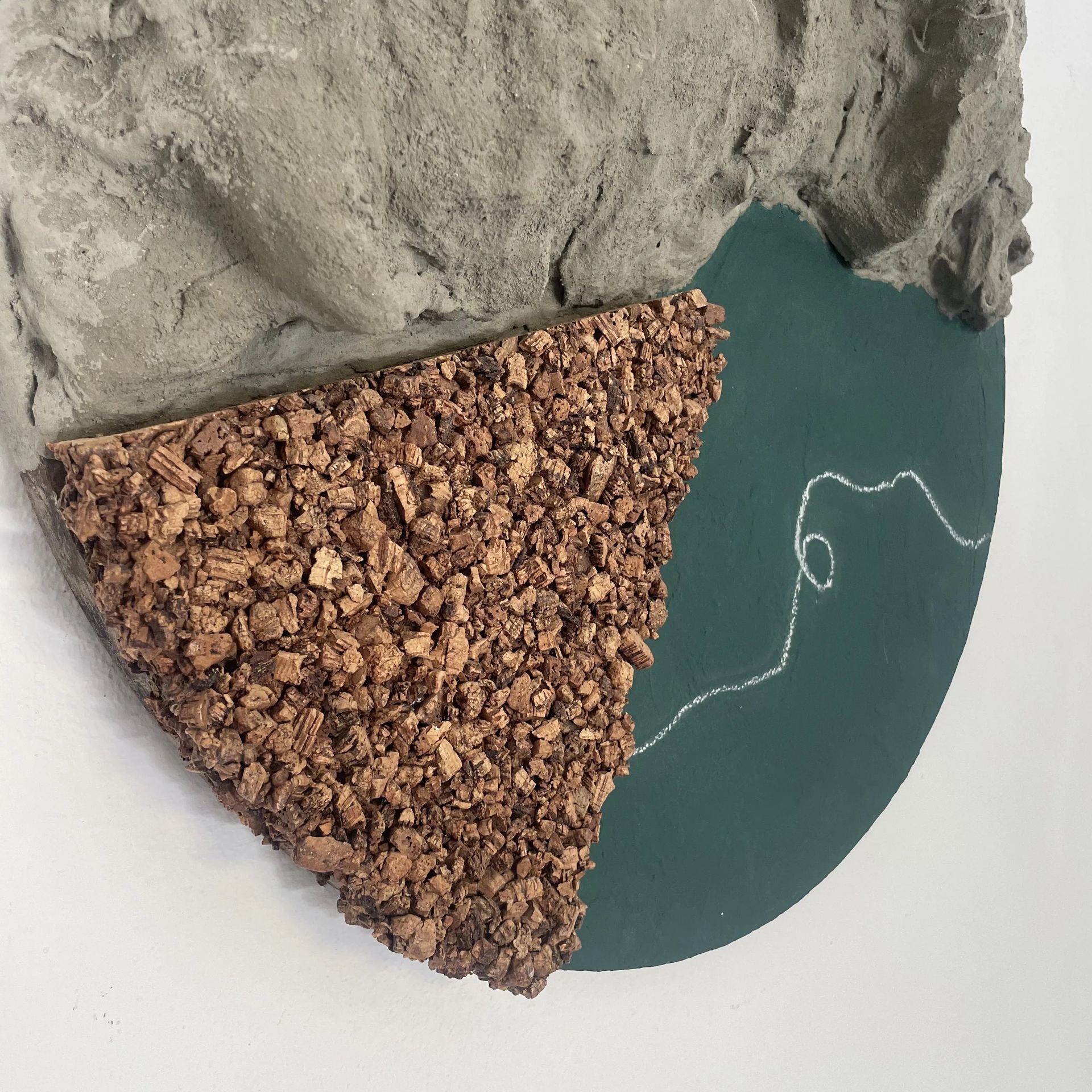 Un mix di texture per questo tondo. Le onde del cemento si fondono ai frammenti di sughero e la linea bianco gesso completa lo sfondo.