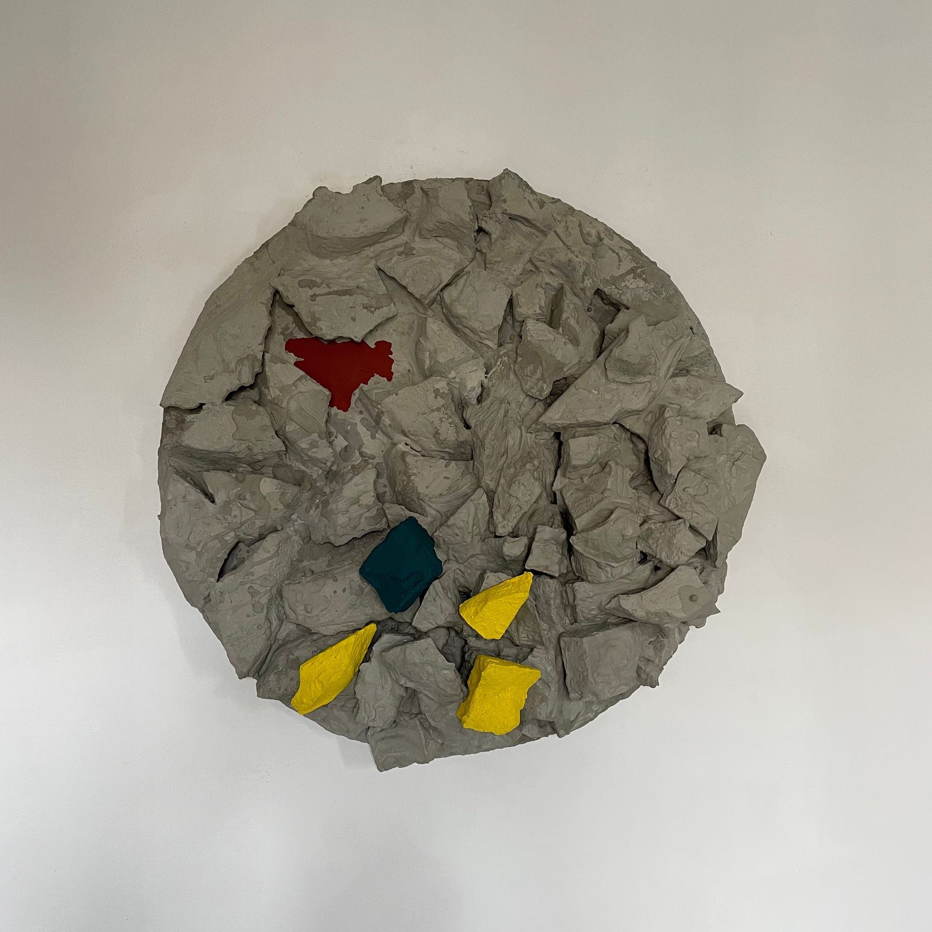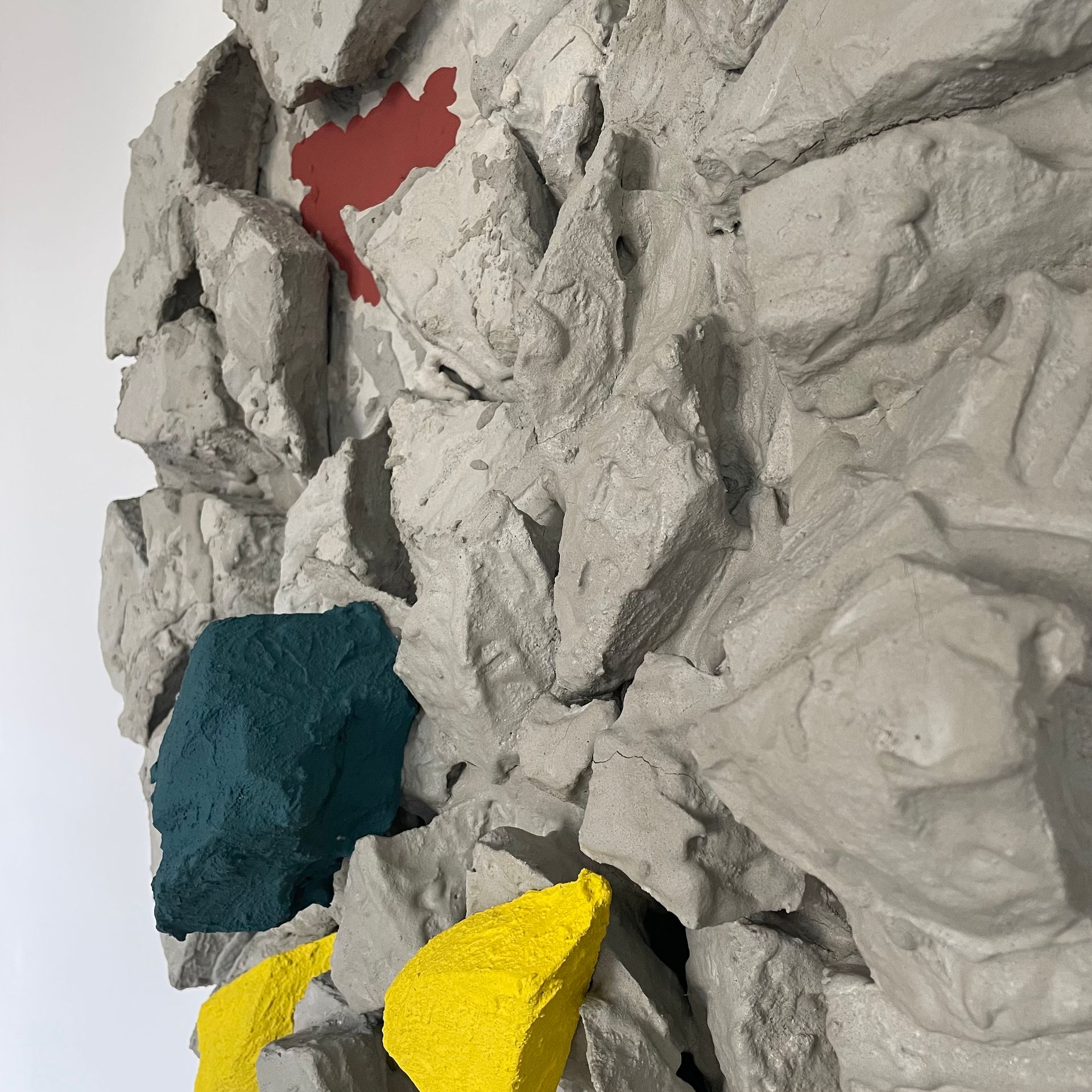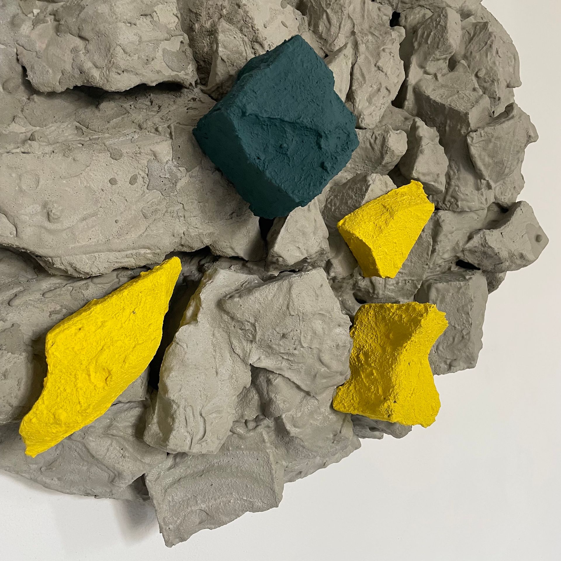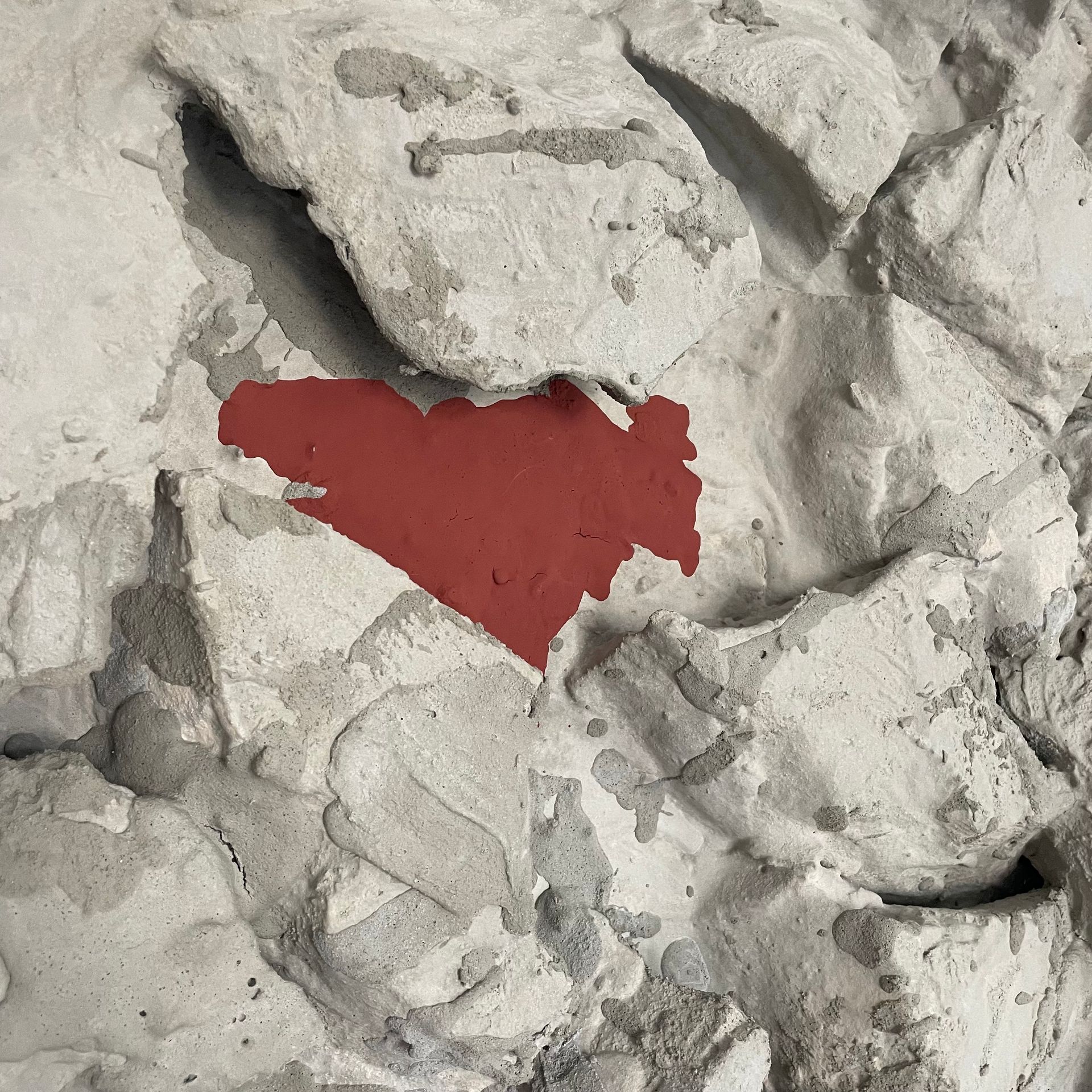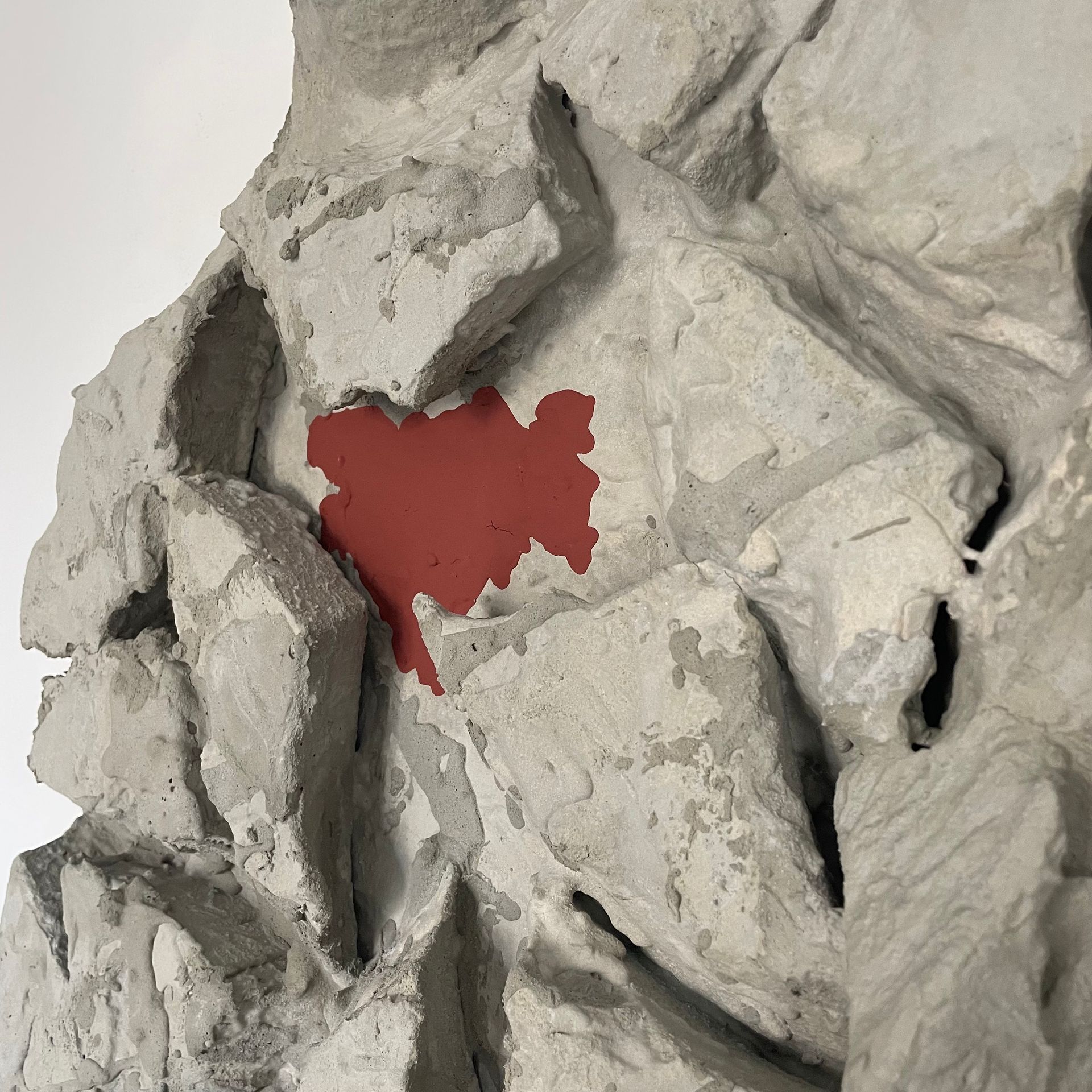 La bellezza del recupero. Quest’opera nasce da pezzi di recupero che si trasformano in qualcosa di unico.. Una scogliera in riva al mare, dove gli scogli simboleggiano i sassi che ci portiamo dietro e che dovremmo lasciare andare per aprire il nostro cuore.. Un’unica colata di cemento travolge quest’opera e la riveste di materia, solo qualche pezzo resta colorato, mentre il cuore respira.