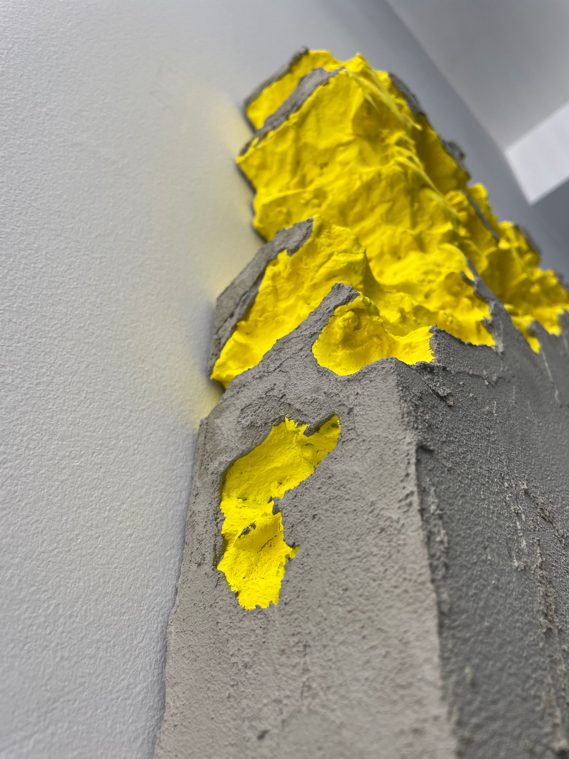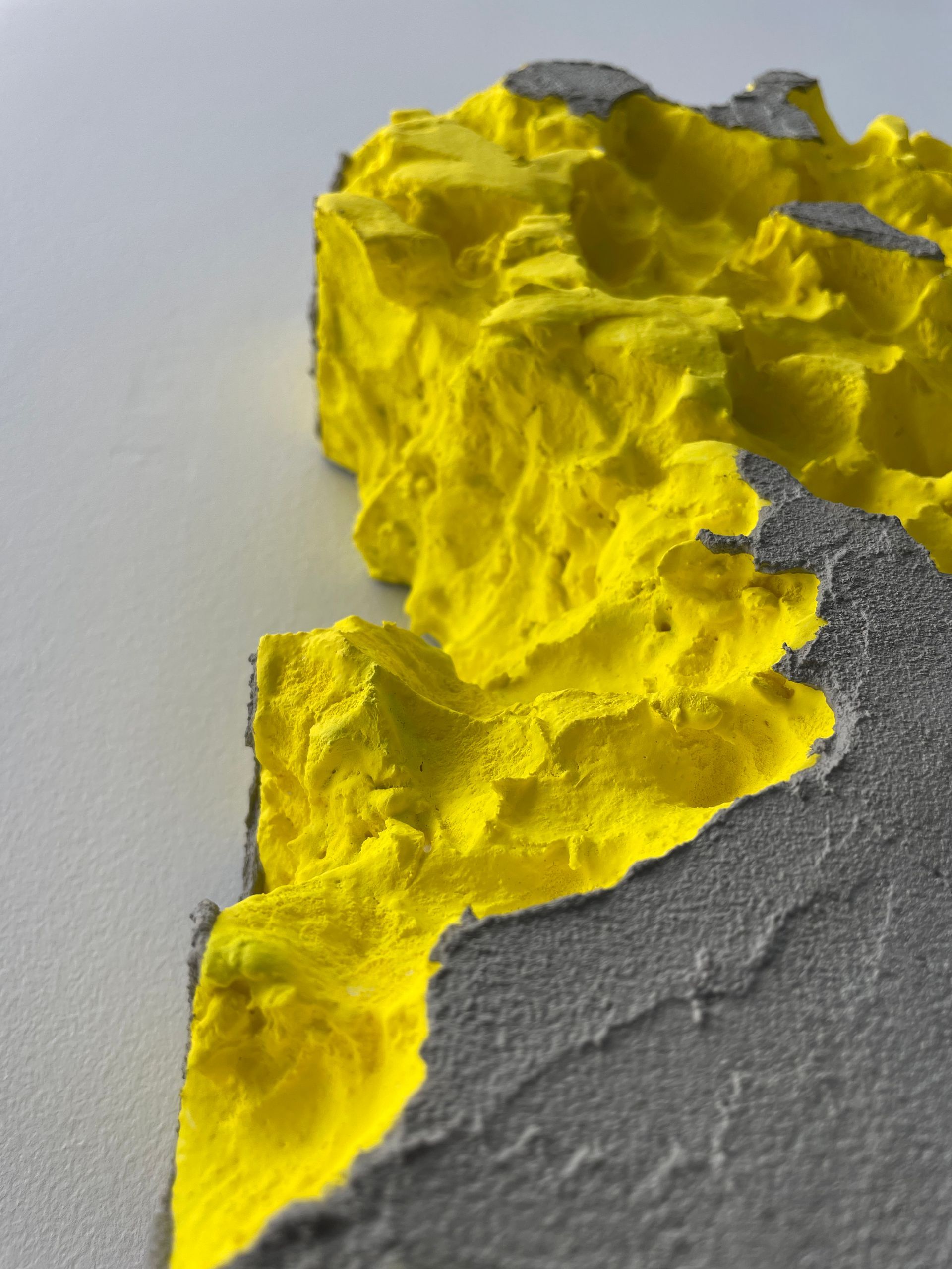 Texture cemento e giallo intenso per questo pezzo dalla forma quadrata.